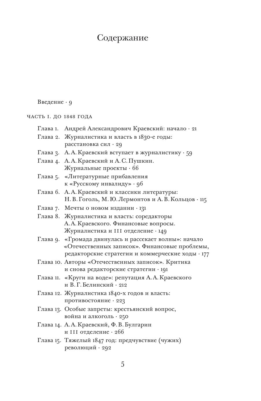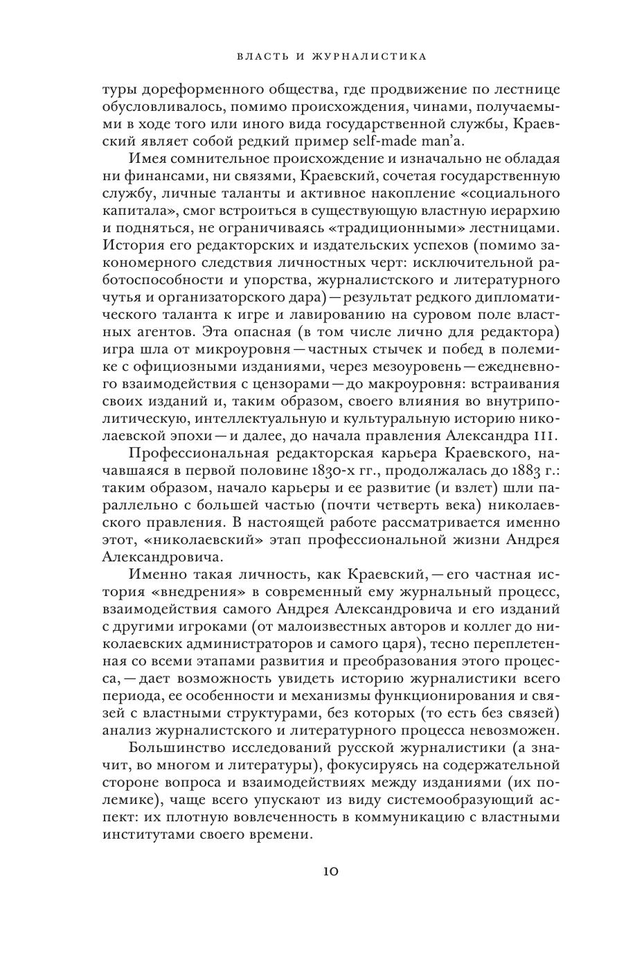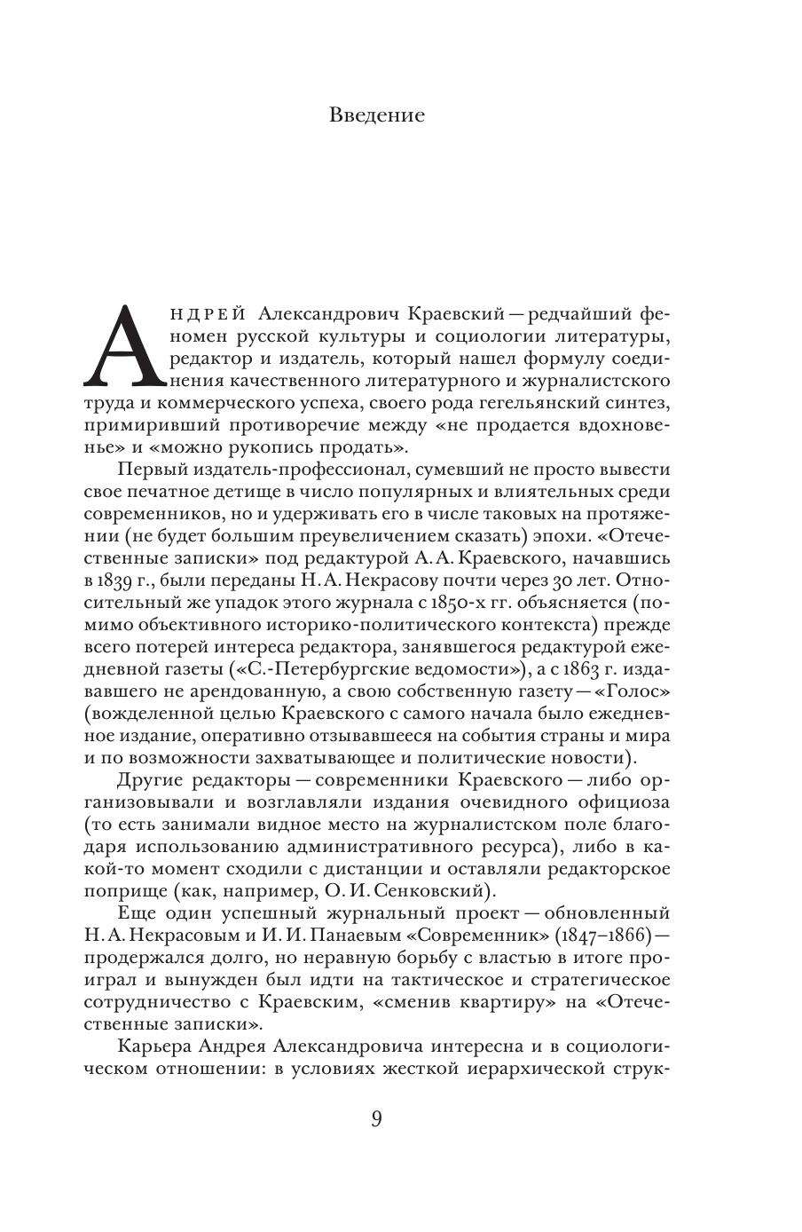 Книга посвящена взаимоотношениям власти и журналистики 1830–1855 гг. — времени правления Николая I и одновременно периода журналистской деятельности Андрея Александровича Краевского. Это годы профессионализации журналистики и литературы, попыток обществен-ного мнения выразить себя в печати посредством завуалированных общественно-политических высказываний в условиях жесточайшей цензуры. Один из фокусов исследования в книге — профессиональная биография Краевского, талантливого редактора и предпринимателя, создавшего уникальный издательский проект XIX в. — журнал «Отечественные записки». Краевский не только сумел привлечь в свой журнал в качестве авторов лучших литераторов и ученых, но явил и уникальную способность взаимодействовать с властью на всех ее уровнях и одновременно сохранять интеллектуальную и идеологическую независимость издания. В книге использованы разнообразные источники (как официальные, так и эго-документы), часть которых впервые вводится в научный оборот.