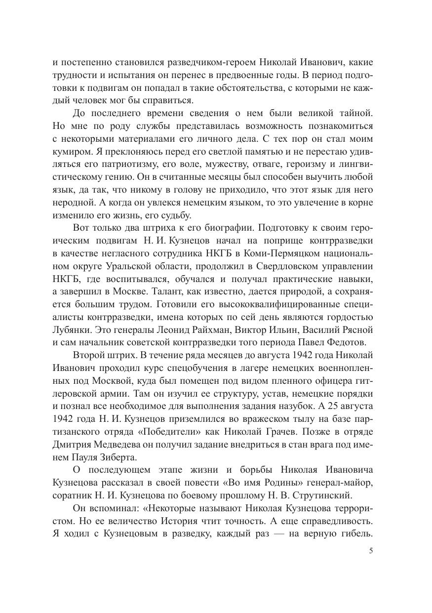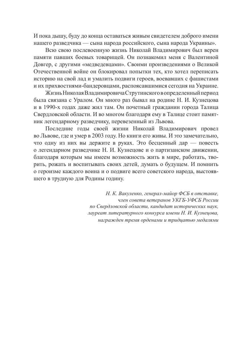 Книга представляет собой документальное повествование о расследовании обстоятельств гибели легендарного разведчика Николая Кузнецова. Автор, бывший в описываемое время соратником Н. Кузнецова по партизанскому движению, очень точно передает атмосферу того времени и пишет о событиях, которые вошли в историю Великой Отечественной войны. В современной политической ситуации, когда регулярно предпринимаются попытки ревизии исторических фактов и принижения значения победы над фашизмом, книга приобретает особую актуальность. Для широкого круга читателей.