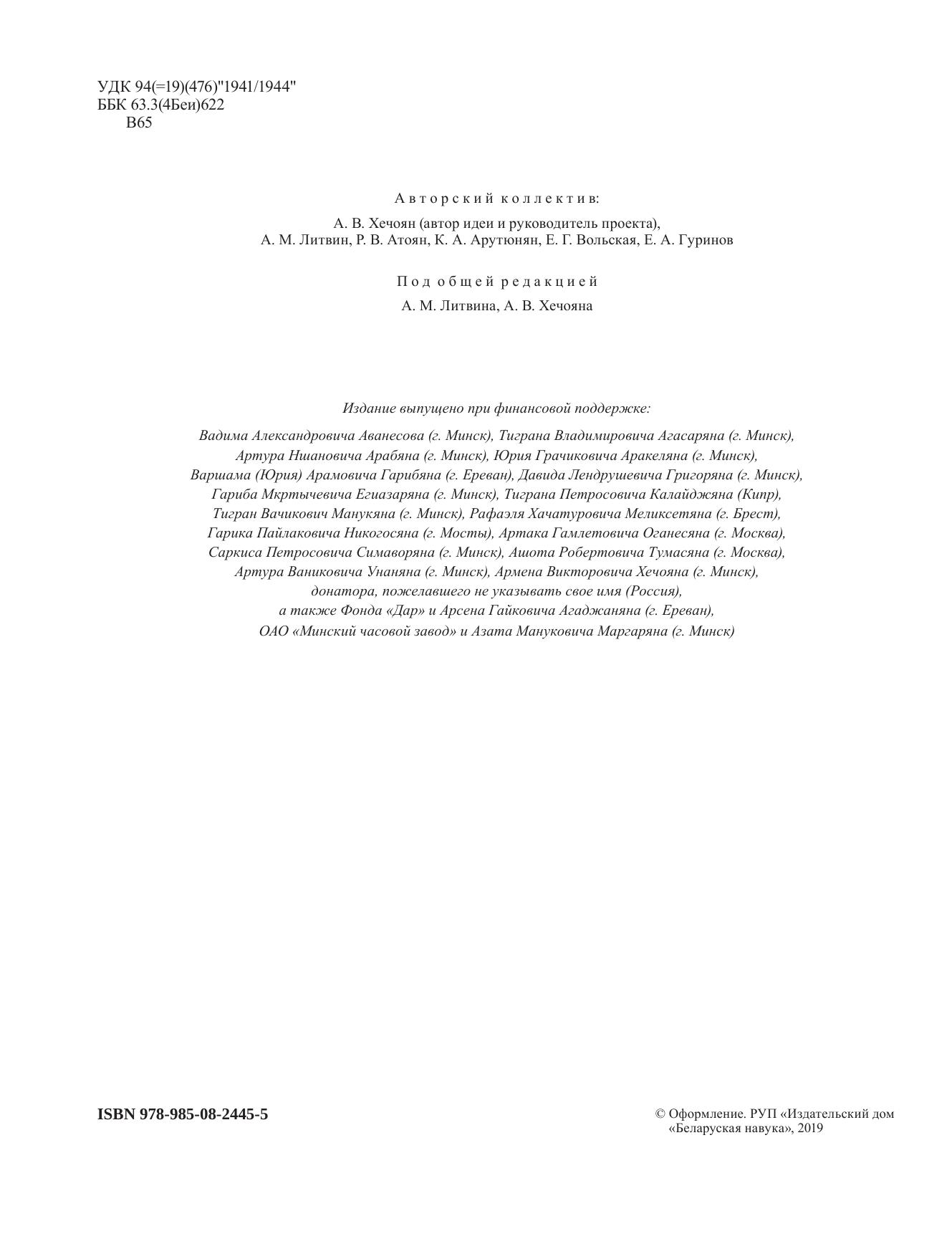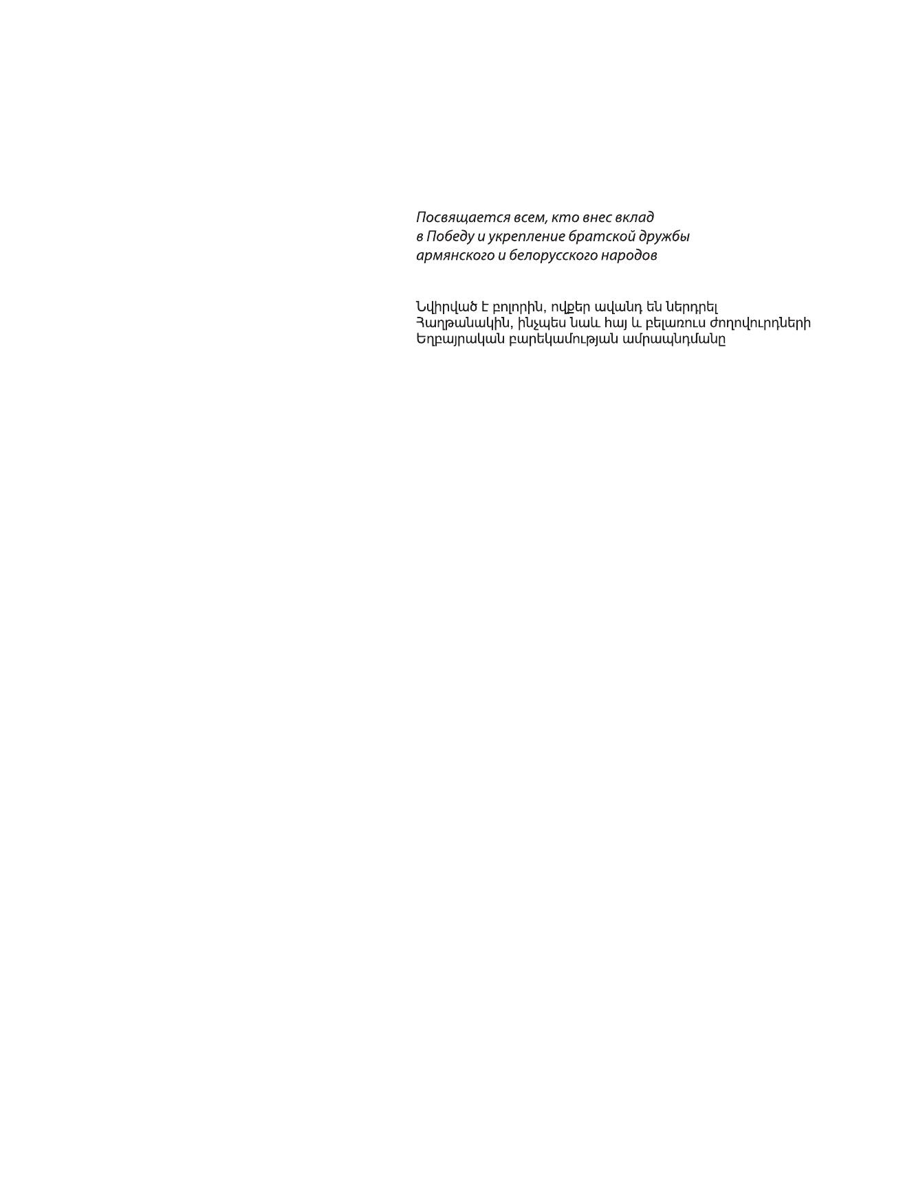 Мемориальное издание содержит впервые сведенные воедино на основе архивных и других источников персонифицированные данные о воинах-армянах, погибших, пропавших без вести и похороненных на территории Беларуси в годы Великой Отечественной войны, защитниках Брестской крепости, участниках партизанского движения и подпольной борьбы, сведения о награжденных за боевые подвиги и заслуги. Фундаментальный труд посвящен всем, кто внес вклад в Победу и укрепление братской дружбы армянского и белорусского народов, а также празднованию в честь 75-летия освобождения Беларуси от немецко-фашистских захватчиков.