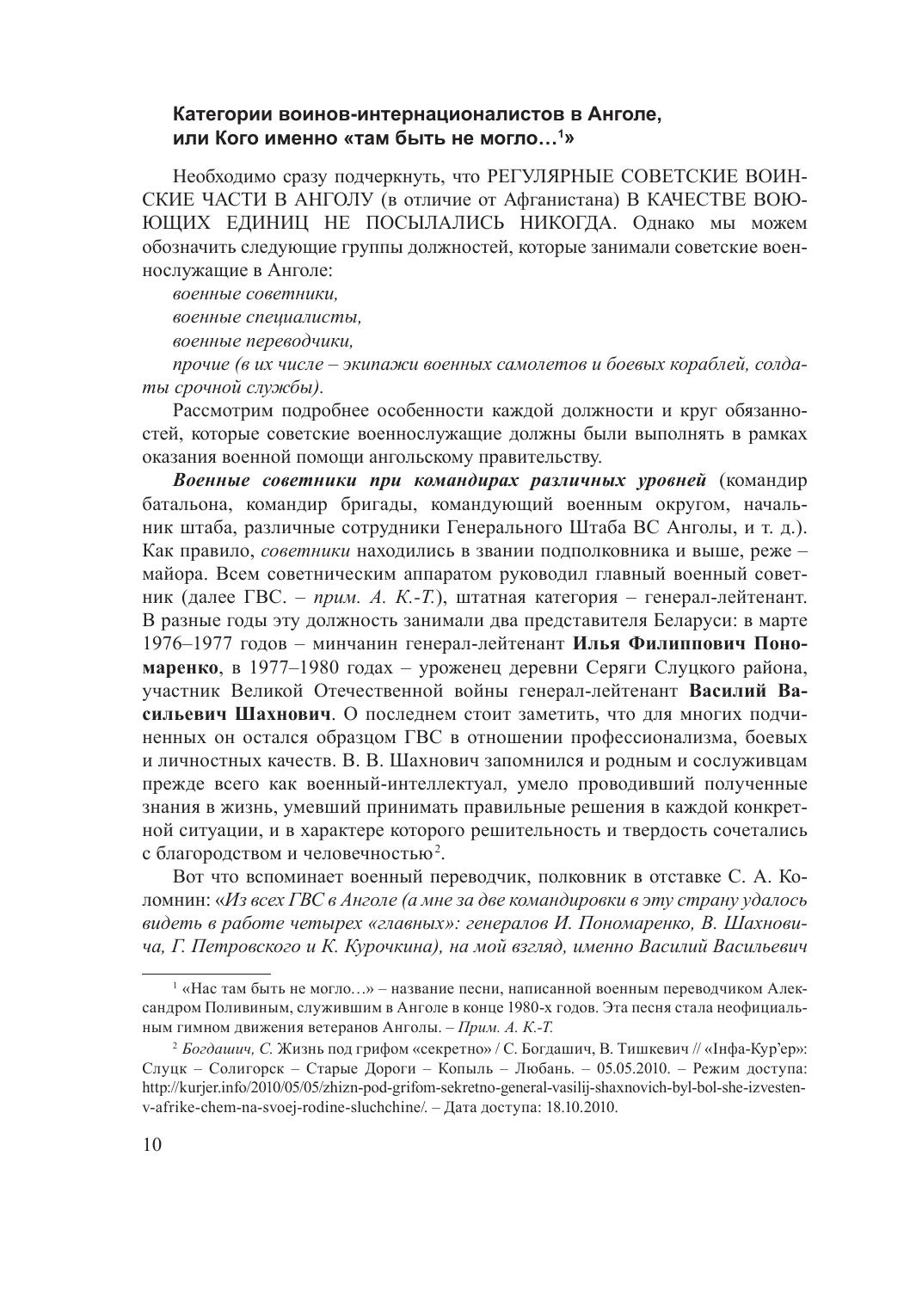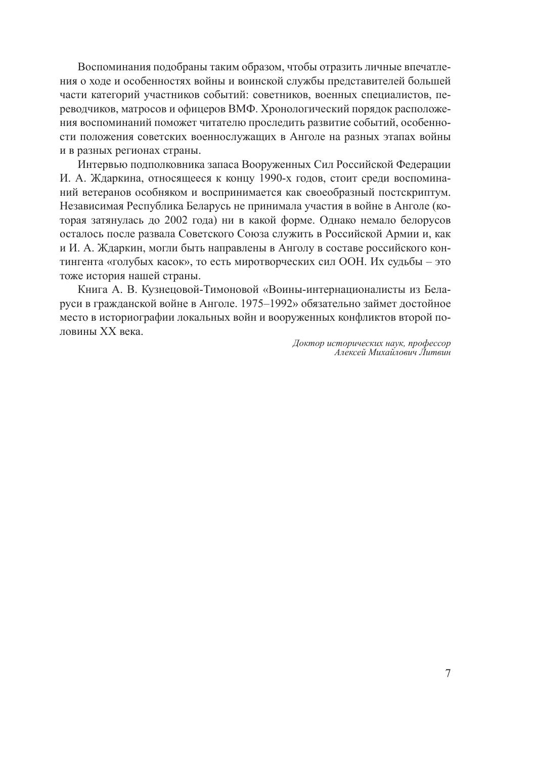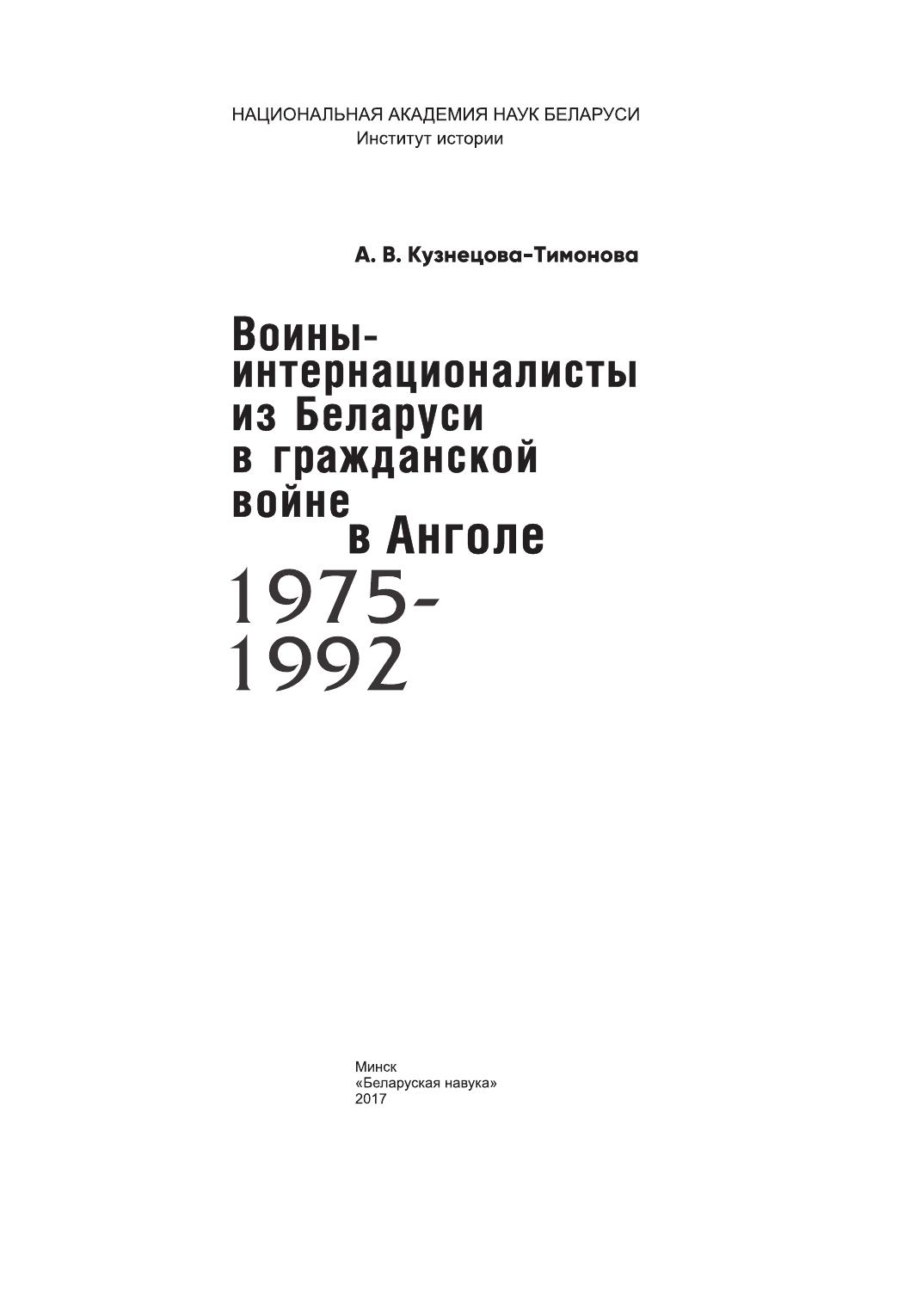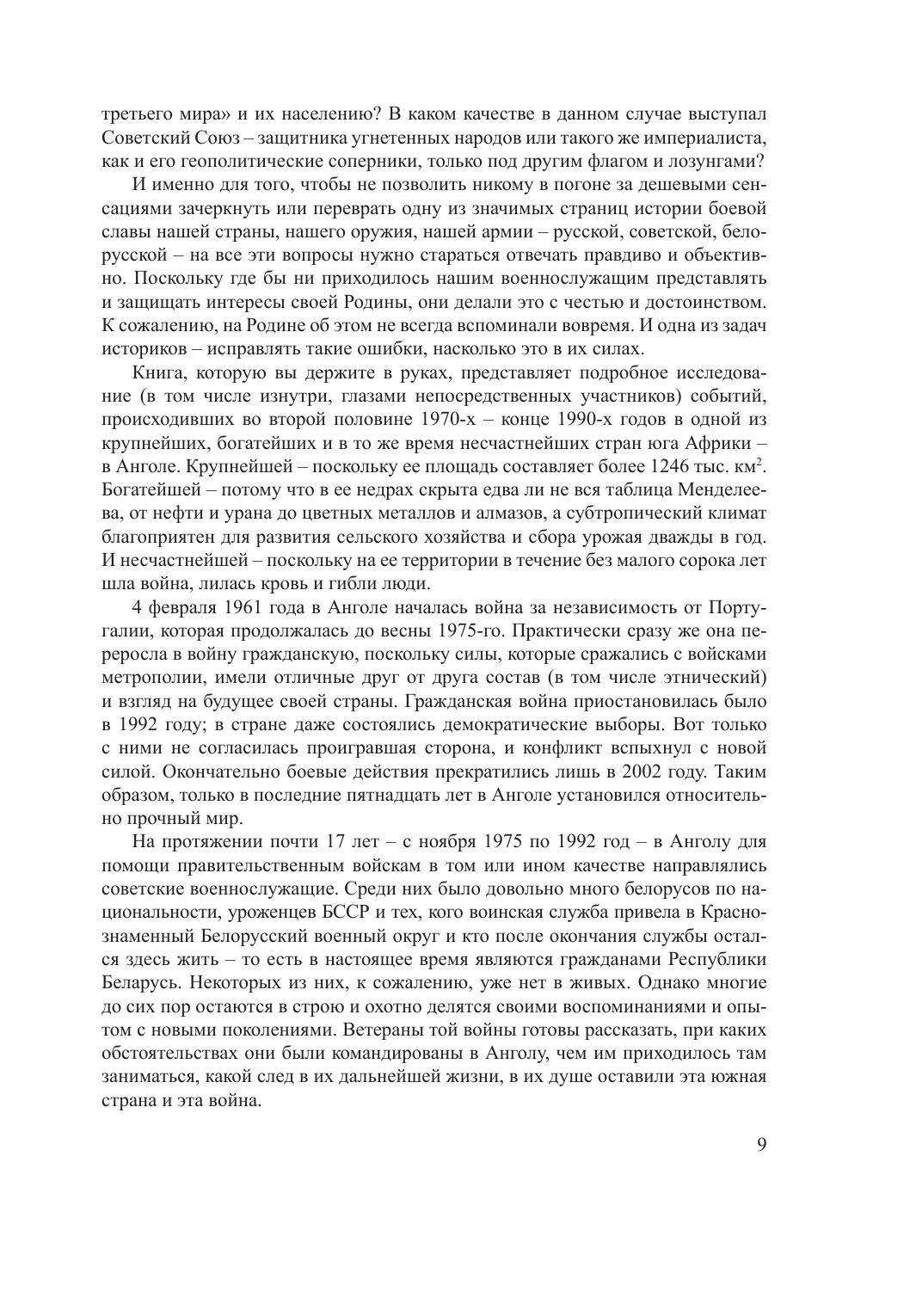 В книге изложены события гражданской войны в Анголе (1975–2002 гг.), причины и обстоятельства, при которых туда направлялись советские военнослужащие – в том числе белорусы, уроженцы БССР и те, кто являются гражданами Республики Беларусь в настоящее время. Подробно рассмотрены условия несения службы в Анголе советскими военными советниками и специалистами, их участие в боевых операциях, взаимодействия с ангольскими и кубинскими военнослужащими. Значительная часть книги представляет собой воспоминания непосредственных участников событий. Издание представляет большой интерес для профессиональных историков и всех, кто интересуется военной историей ХХ века.