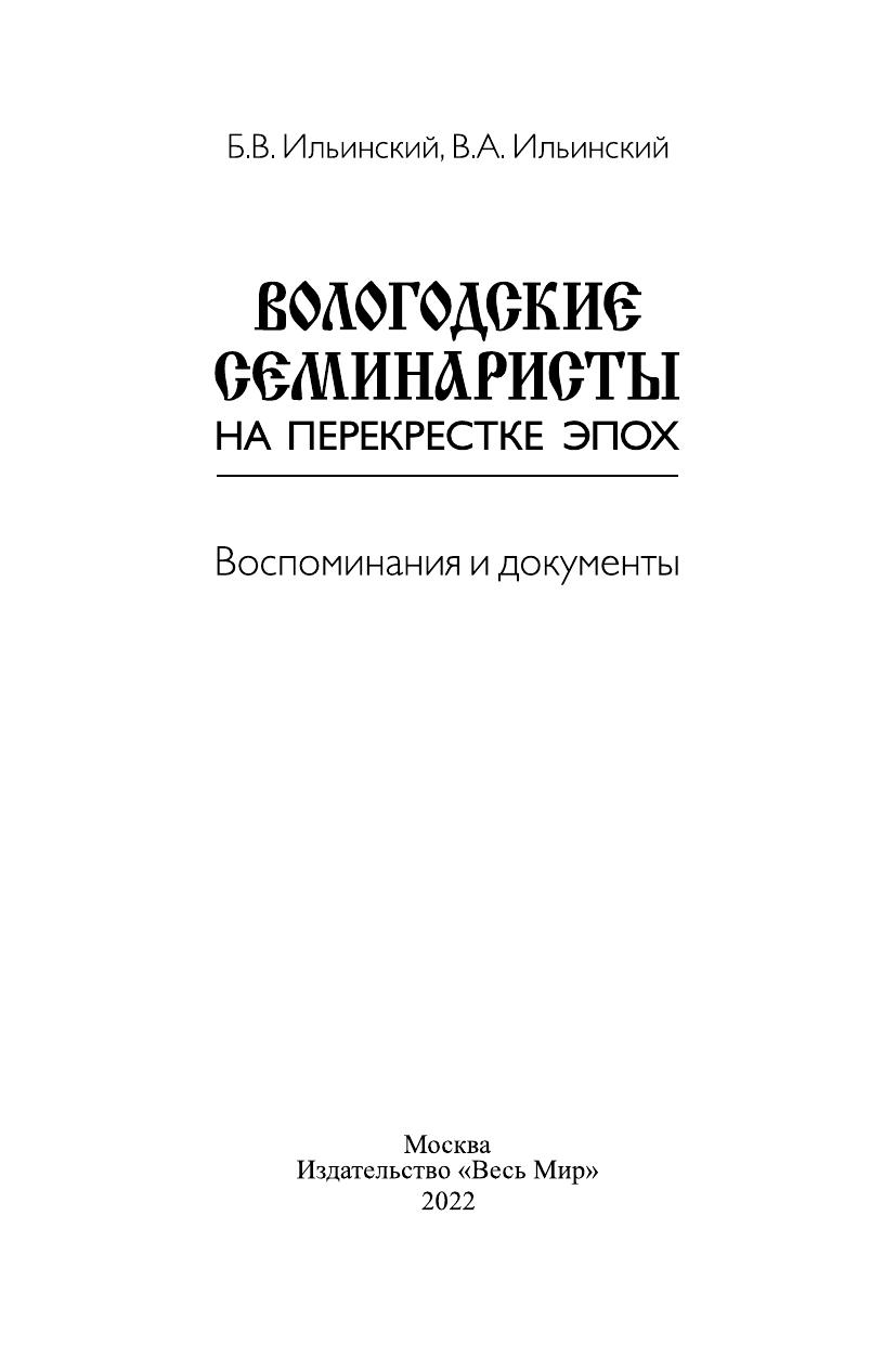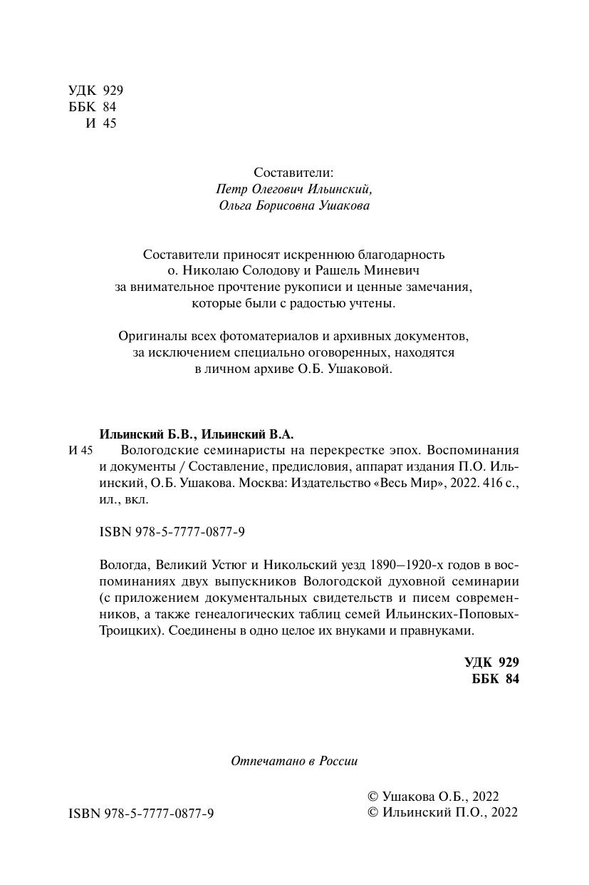 Вологда, Великий Устюг и Никольский уезд 1890–1920х годов в воспоминаниях двух выпускников Вологодской духовной семинарии (с приложением документальных свидетельств и писем современников, а также генеалогических таблиц семей Ильинских, Поповых, Троицких). Соединены в одно целое их внуками и правнуками.