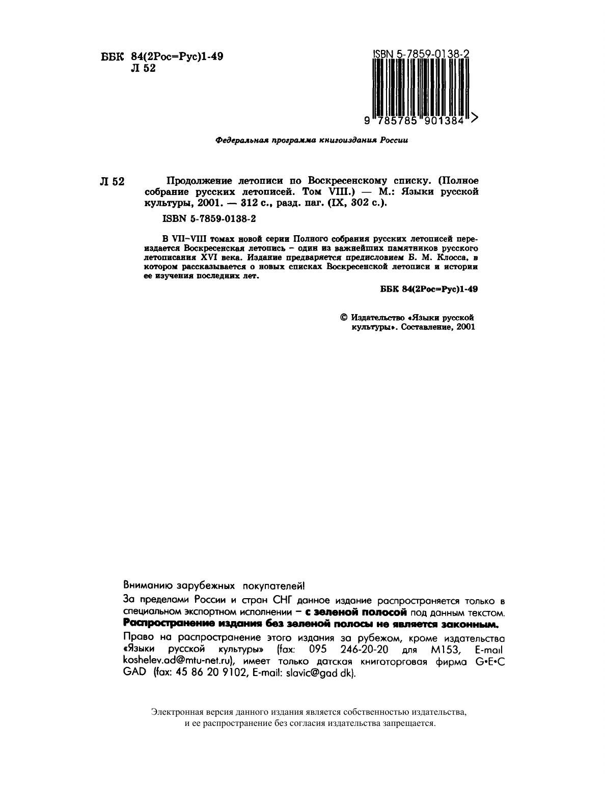 В VIII томе новой серии Полного собрания русских летописей переиздается Воскресенская летопись - один из важнейших памятников русского летописания XVI века. Издание предваряется предисловием Б.М. Клосса, в котором рассказывается о новых списках Воскресенской летописи и истории ее изучения последних лет. Книга предназначена для историков, филологов и всех интересующихся древнерусской литературой и историей культуры.