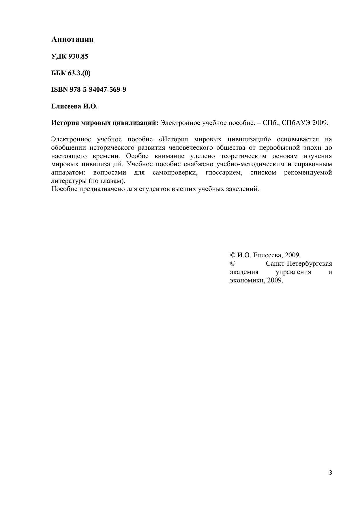 Электронное учебное пособие «История мировых цивилизаций» основывается на обобщении исторического развития человеческого общества от первобытной эпохи до настоящего времени. Особое внимание уделено теоретическим основам изучения мировых цивилизаций. Учебное пособие снабжено учебно-методическим и справочным аппаратом: вопросами для самопроверки, глоссарием, списком рекомендуемой литературы (по главам). Пособие предназначено для студентов высших учебных заведений. Электронное учебное пособие для дистанционного обучения