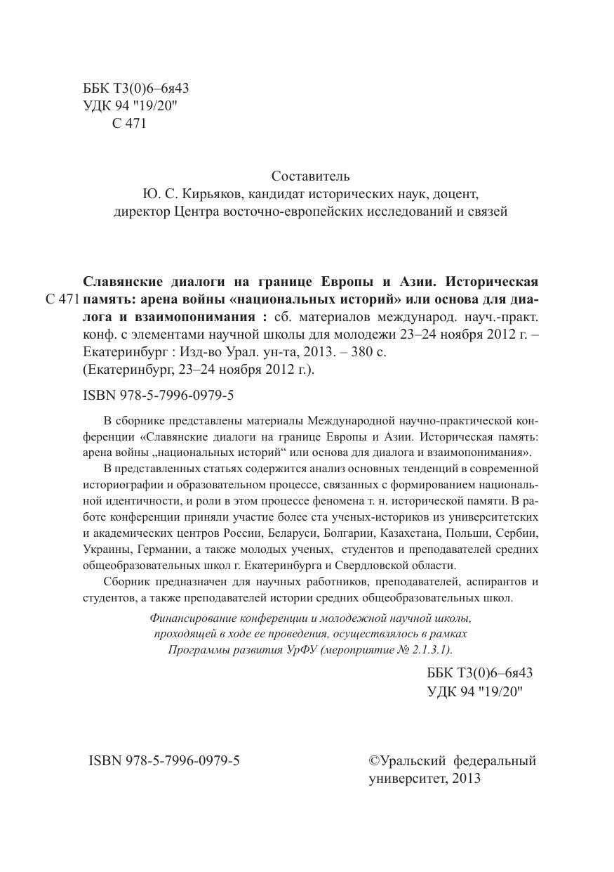Славянские диалоги на границе Европы и Азии. Историческая память: арена войны «национальных историй» или основа для диалога и взаимопонимания : сб. материалов международ. науч.-практ. конф. с элементами научной школы для молодежи 23–24 ноября 2012 г.