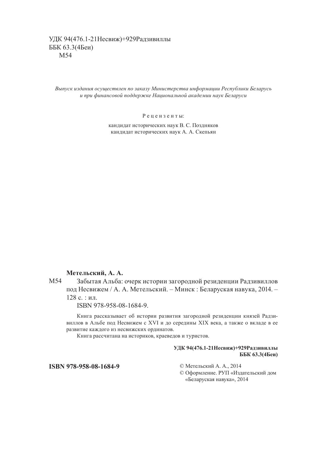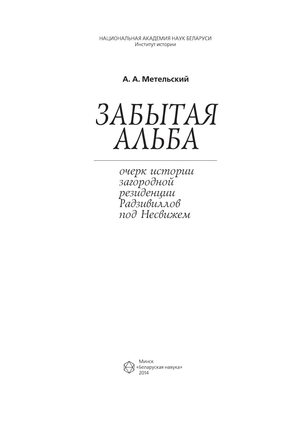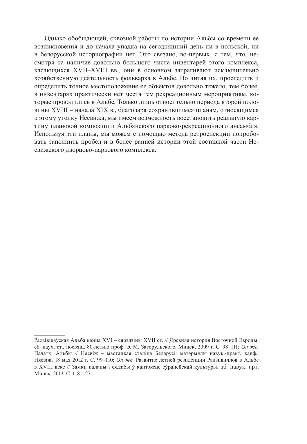 Книга рассказывает об истории развития загородной резиденции князей Радзивиллов в Альбе под Несвижем с XVI и до середины XIX века, а также о вкладе в ее развитие каждого из несвижских ординатов. Книга рассчитана на историков, краеведов и туристов.