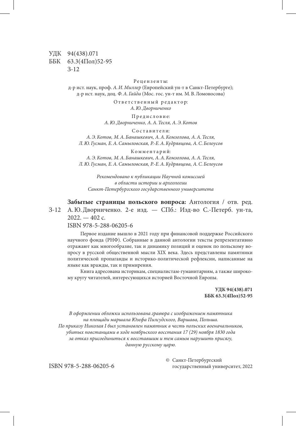 Первое издание вышло в 2021 году при финансовой поддержке Российского фонда (РНФ). Собранные в данной антологии тексты репрезентативно отражают как многообразие, так и динамику позиций и оценок по польскому вопросу в русской общественной мысли XIX века. Здесь представлены памятники политической пропаганды и историко-политической рефлексии, написанные на языке как вражды, так и примирения.