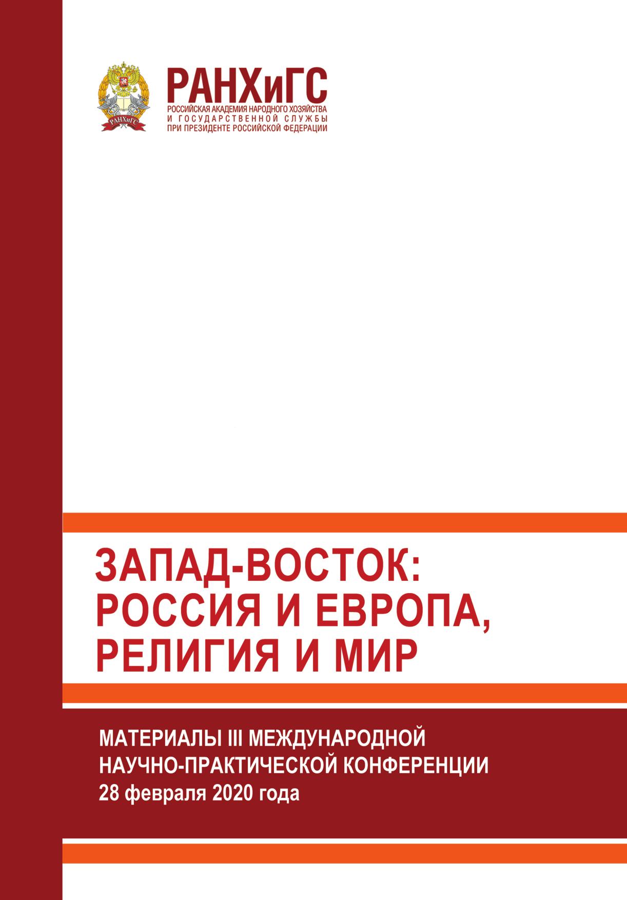 Сборник подготовлен по материалам выступлений участников III Международной научно-практической конференции на тему: «ЗападВосток: Россия и Европа, религия и мир» (28 февраля 2020 г.) организованной Среднерусским институтом управления – филиалом РАНХиГС. В сборнике представлены исследования ведущих специалистов и работников органов государственной власти, руководителей наиболее значимых общественных организаций, представителей бизнеса, СМИ, профессорско-преподавательского состава, докторантов, аспирантов и студентов. Материалы публикуются в авторской редакции.