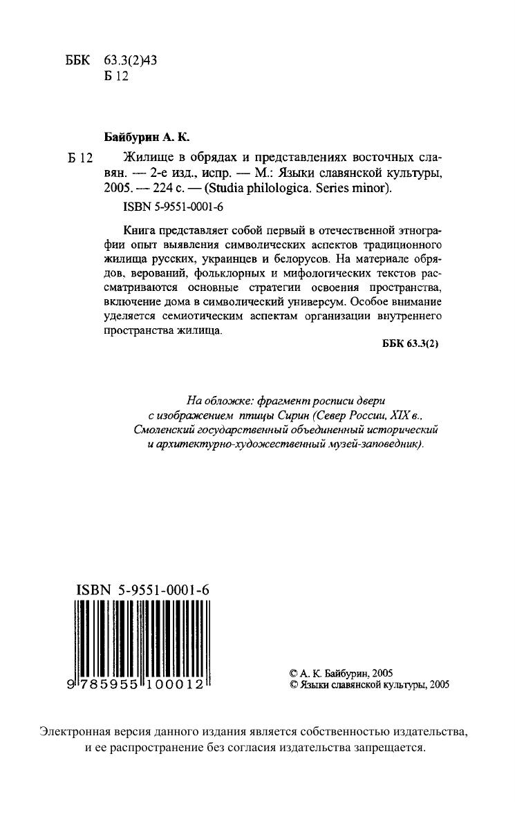 Книга представляет собой первый в отечественной этнографии опыт выявления символических аспектов традиционного жилища русских, украинцев и белорусов. На материале обрядов, верований, фольклорных и мифологических текстов рассматриваются основные стратегии освоения пространства, включение дома в символический универсум. Особое внимание уделяется семиотическим аспектам организации внутреннего пространства жилища. Для научных работников, широкого круга специалистов.