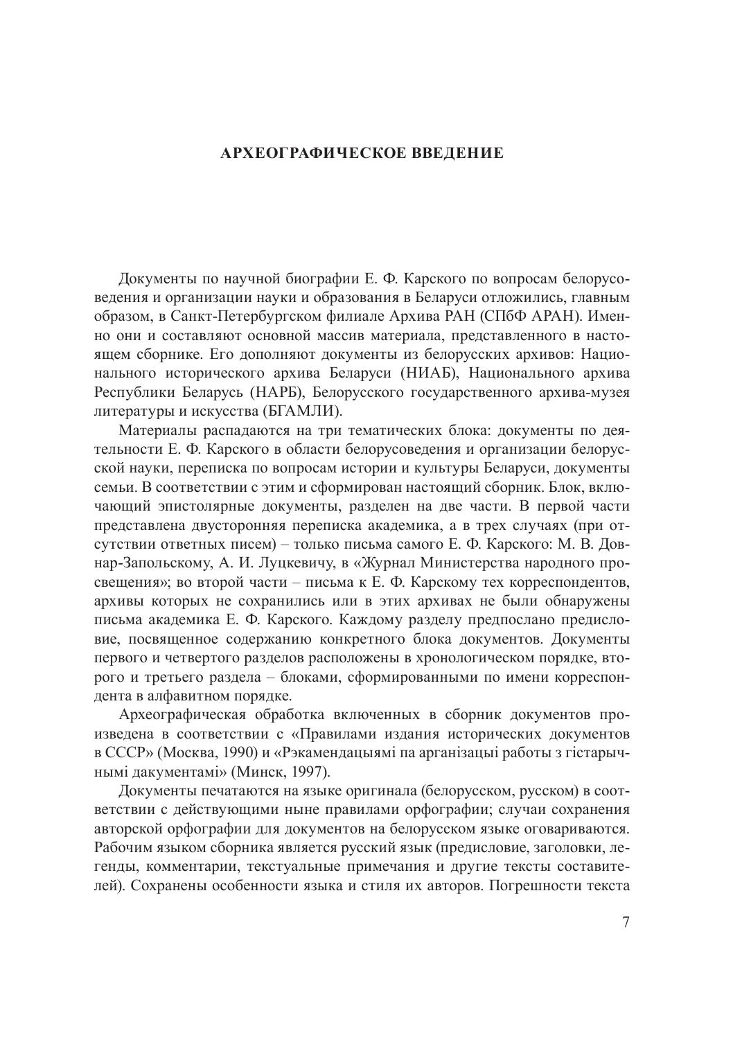 В сборник включены документы и материалы, освещающие проблемы истории и культуры Беларуси в документальном наследии выдающегося белорусоведа академика Е. Ф. Карского (1860–1931). Основу сборника составляют документы и материалы из Санкт-Петербургского филиала Архива Российской академии наук. Представлены также документы и материалы из Национального исторического архива Беларуси, Национального архива Беларуси, Белорусского государственного архива-музея литературы и искусства. Большинство документов впервые вводятся в научный оборот и отражают сложный процесс становления белорусоведения как науки, формирования представлений о пределах распространения белорусского языка, границах Беларуси и других важных аспектах национального вопроса.
