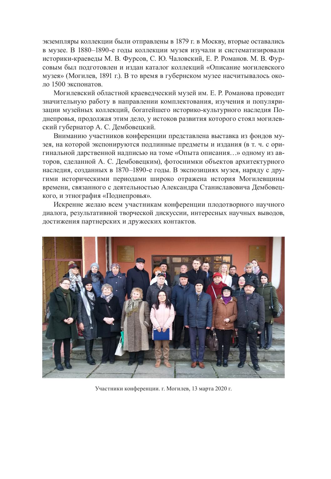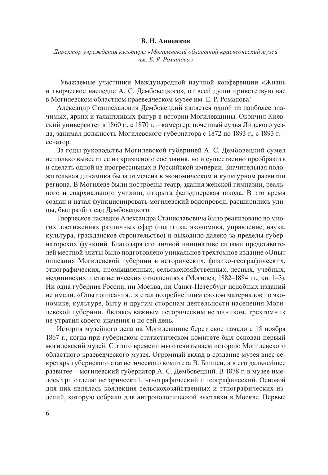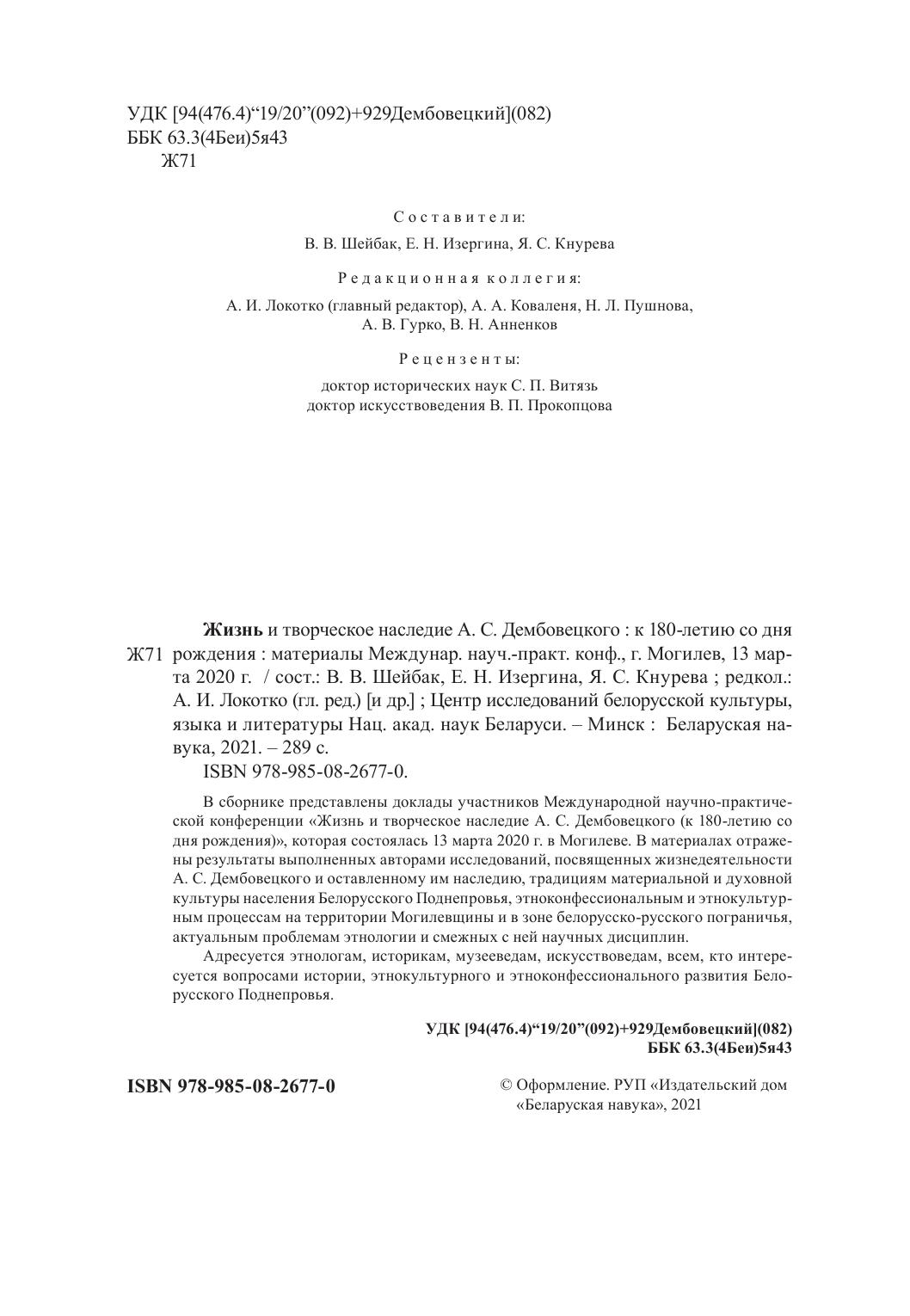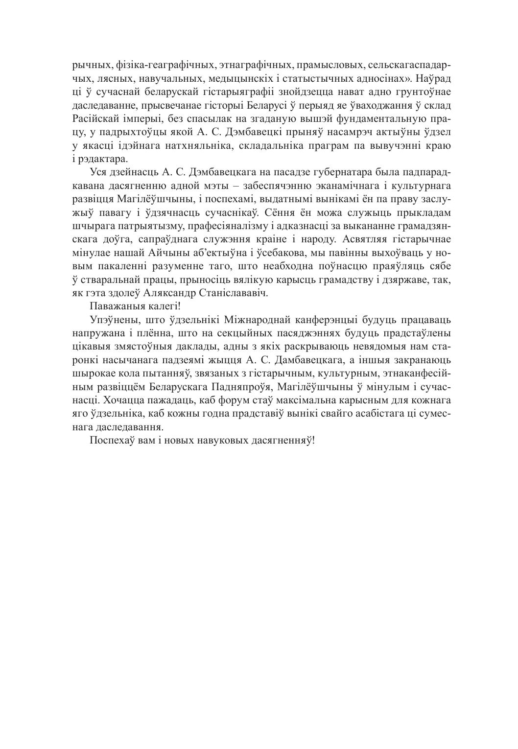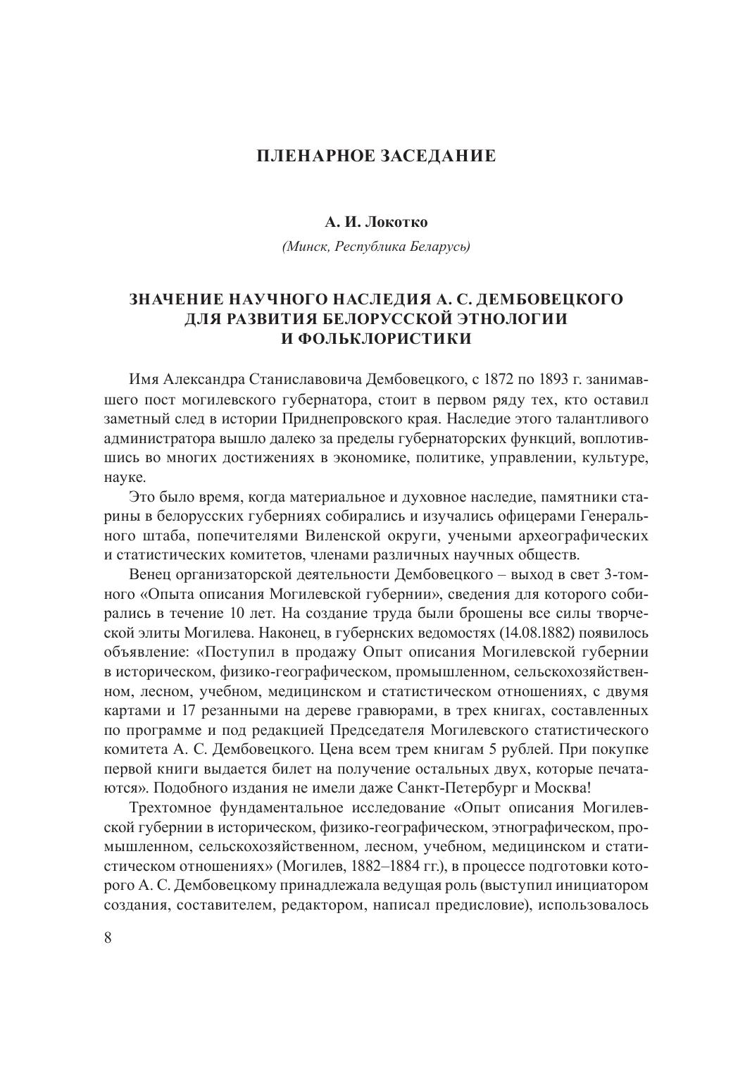 В сборнике представлены доклады участников Международной научно-практической конференции «Жизнь и творческое наследие А. С. Дембовецкого (к 180-летию со дня рождения)», которая состоялась 13 марта 2020 г. в Могилеве. В материалах отражены результаты выполненных авторами исследований, посвященных жизнедеятельности А. С. Дембовецкого и оставленному им наследию, традициям материальной и духовной культуры населения Белорусского Поднепровья, этноконфессиональным и этнокультурным процессам на территории Могилевщины и в зоне белорусско-русского пограничья, актуальным проблемам этнологии и смежных с ней научных дисциплин.