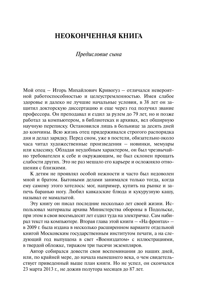 В издании публикуются незавершенные воспоминания известного историка Игоря Михайловича Кривогуза (1926–2013). Мемуары профессионального историка имеют особое значение для читателя, потому что для ученого и его собственная жизнь – предмет профессионального исследования. В воспоминаниях И.М. Кривогуза содержатся интереснейшие рассказы о жизни на Кубани в 20–30е годы, в предвоенном Грозном, о перипетиях коллективизации. Исключительный интерес представляют откровенные фронтовые воспоминания автора, прошедшего практически всю войну (с 1942 по 1945 г.) – от Предкавказья до Праги и Маньчжурии, и сверявшего воспоминания с архивными документами. После войны И.М. Кривогуз стал известным историком, специалистом по новейшей истории Европы, автором учебников. При этом его взгляды на историю нашей страны в XX в. претерпели серьезные изменения, о чем автор пишет очень ясно. Все эти особенности делают книгу ценным историческим источником. Книга подготовлена к изданию сыном автора – Михаилом Игоревичем Кривогузом, дополнившим незавершенный текст отца своими воспоминаниями и заметками, данными в приложениях. Книга содержит фотоиллюстрации из семейного архива.
