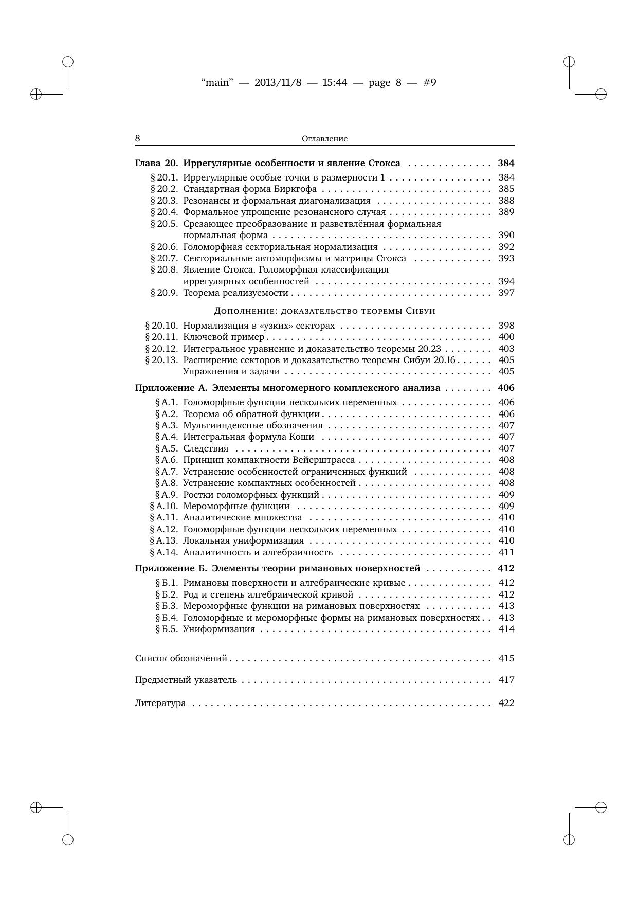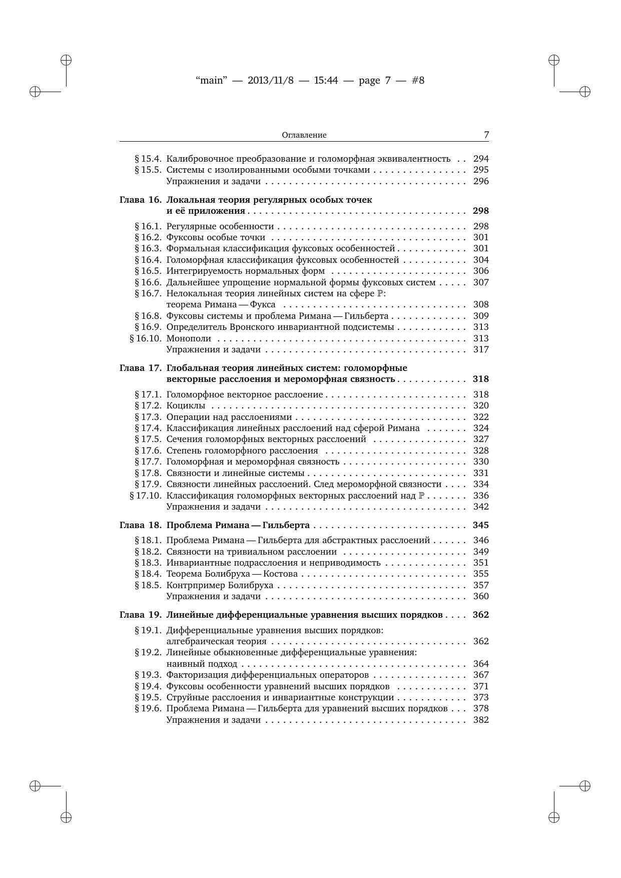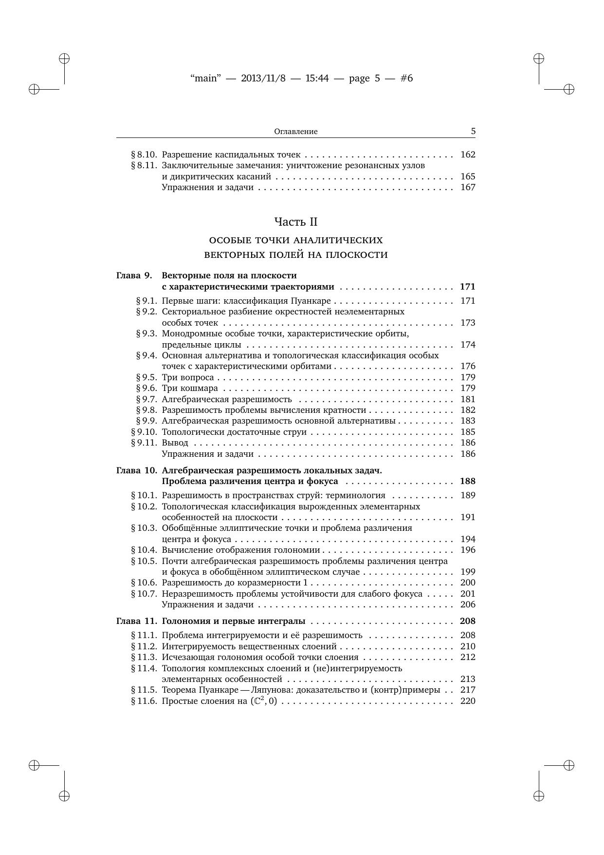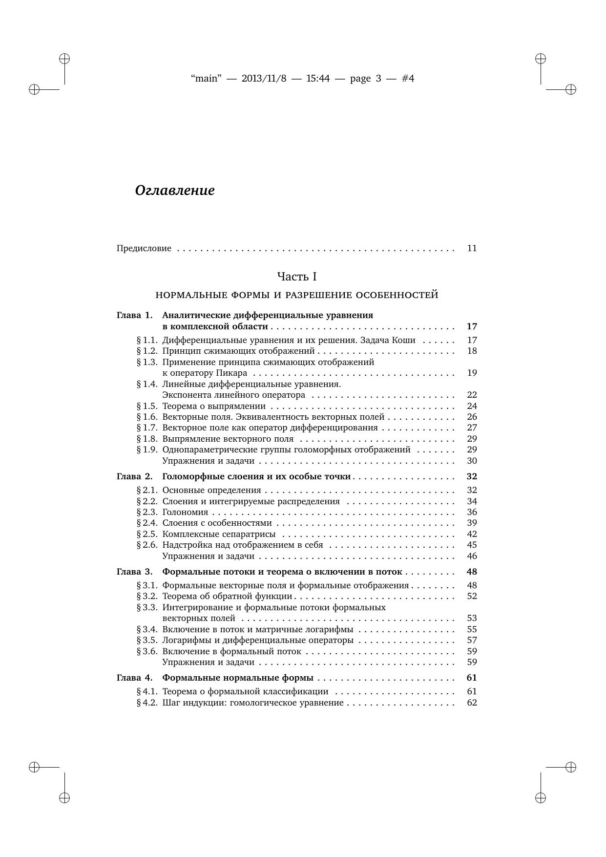 Предлагаемая книга—первый том двухтомной монографии, посвящённой аналитической теории дифференциальных уравнений. В первой части этого тома излагается формальная и аналитическая теория нормальных форм и теорема о разрешении особенностей для векторных полей на плоскости. Вторая часть посвящена алгебраически разрешимым локальным задачам теории аналитических дифференциальных уравнений, квадратичным векторным полям и проблеме локальной классификации ростков векторных полей в комплексной области. Дано современное изложение работы Дюлака (1908) об условиях центра и классической работы Баутина о рождении не более чем трех предельных циклов при бифуркации особой точки квадратичного векторного поля типа центр. Изложена теория алгебраически разрешимых локальных задач и доказана алгебраическая неразрешимость проблемы различения центра и фокуса. В третьей части изложена линейная теория: подход Арнольда к теории нормальных форм линейных систем с нелинейной точки зрения, проблема Римана— Гильберта, явление Стокса, теорема Сибуи о секториальной нормализации. В приложениях приводится необходимый минимум сведений из теории римановых поверхностей и многомерного комплексного анализа. Книга предназначена для студентов, аспирантов и научных работников физико-математических специальностей.