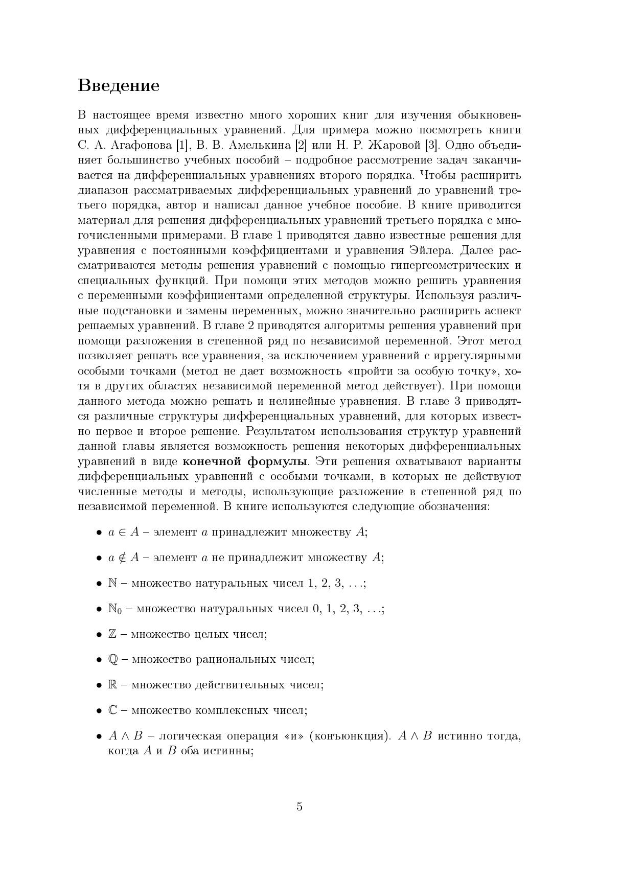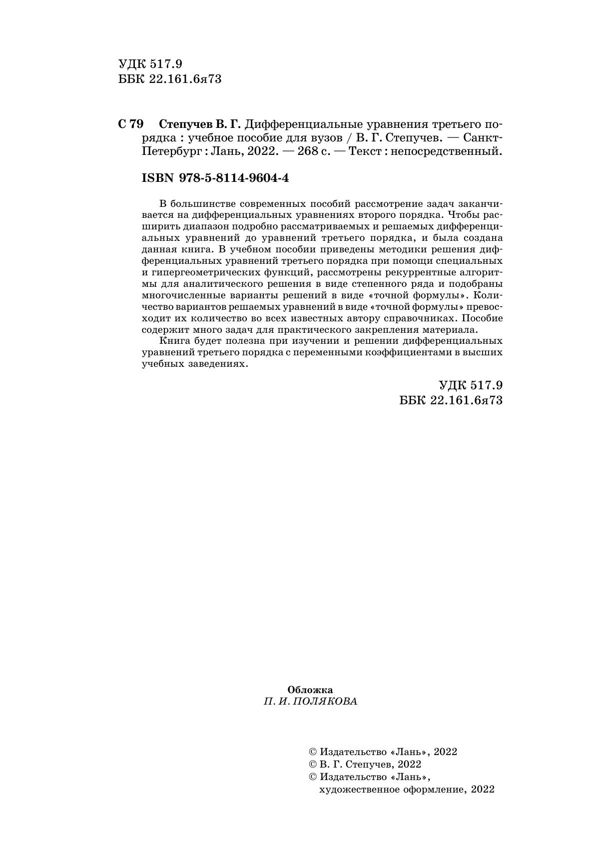 В большинстве современных пособий рассмотрение задач заканчивается на дифференциальных уравнениях второго порядка. Чтобы расширить диапазон подробно рассматриваемых и решаемых дифференциальных уравнений до уравнений третьего порядка, была и создана данная книга. В данной книге приведены методики решения дифференциальных уравнений третьего порядка при помощи специальных и гипергеометрических функций, рассмотрены рекуррентные алгоритмы для аналитического решения в виде степенного ряда и подобраны многочисленные варианты решений в виде «точной формулы». Количество вариантов решаемых уравнений в виде «точной формулы» превосходит все известные автору справочники. Пособие содержит большое количество задач для практического закрепления материала. Книга будет полезна при изучении и решении дифференциальных уравнений третьего порядка с переменными коэффициентами в высших учебных заведениях.