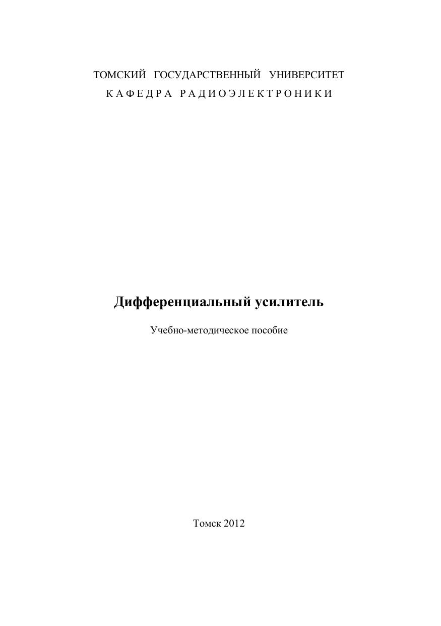Учебно-методическое пособие содержит описание лабораторной работы "Дифференциальный усилитель" по курсу "Схемотехника аналоговых электронных устройств". Пособие разработано для студентов третьего курса радиофизического факультета Томского государственного университета, обучающихся по специальности 210302.65 - РАДИОТЕХНИКА.