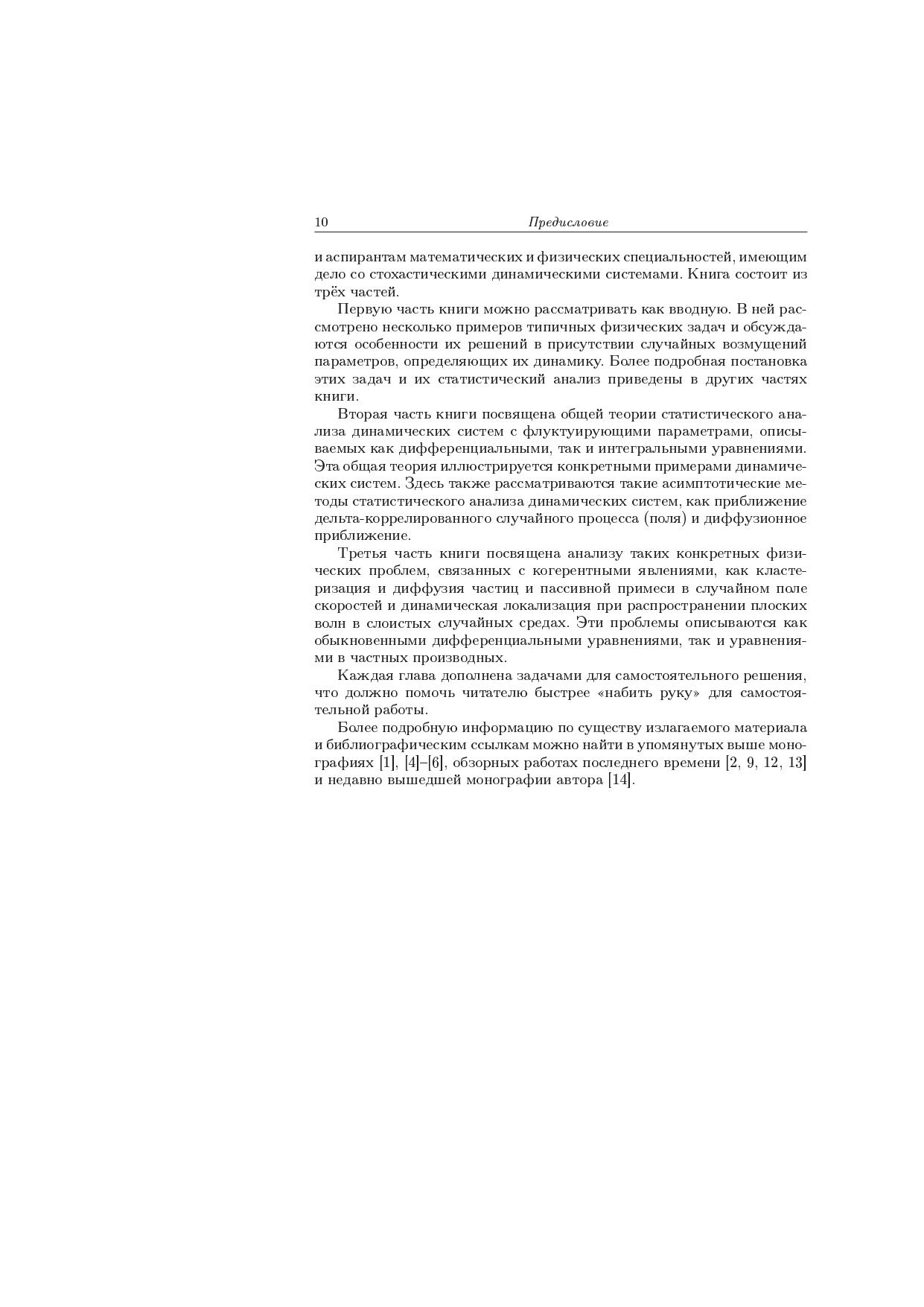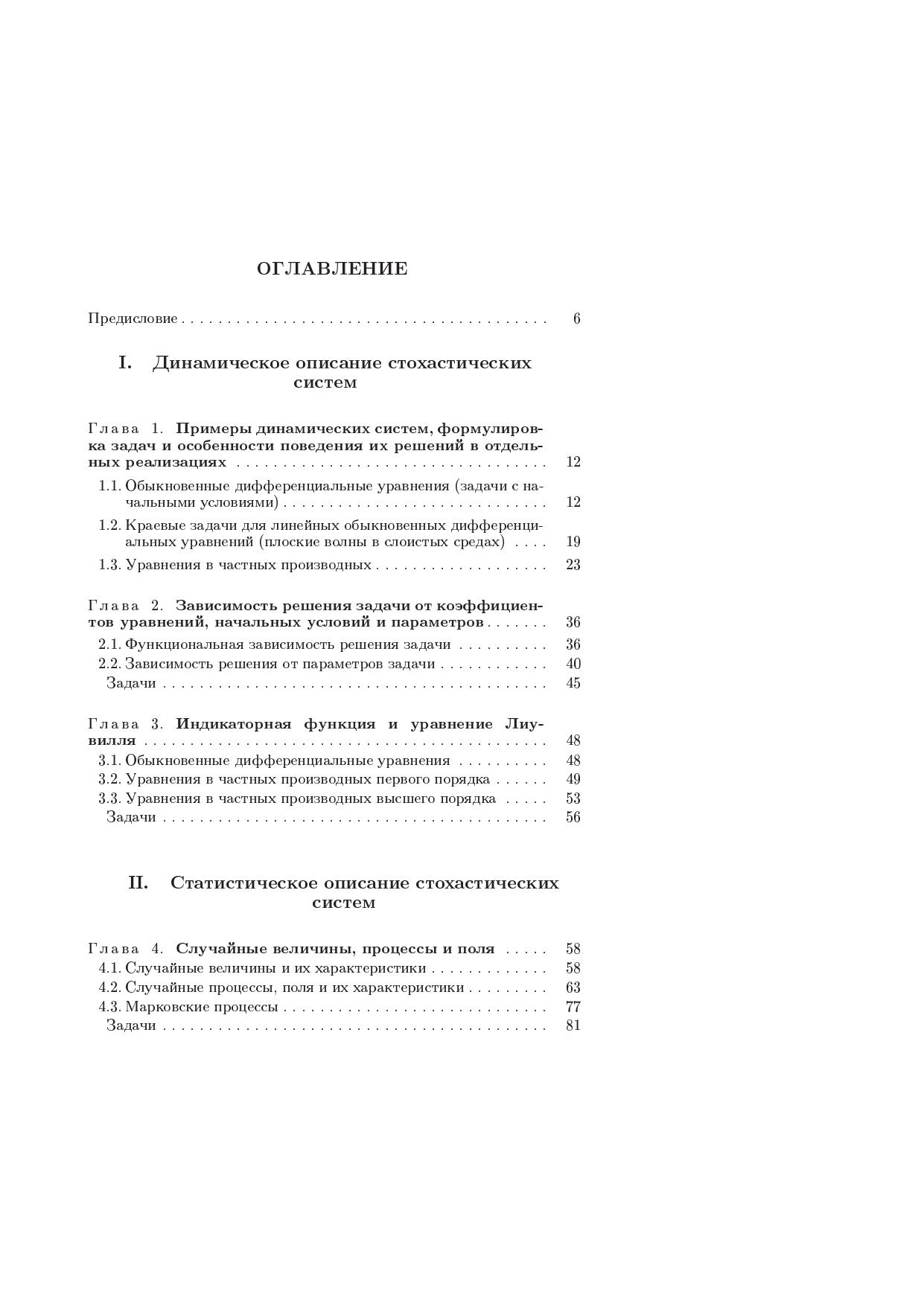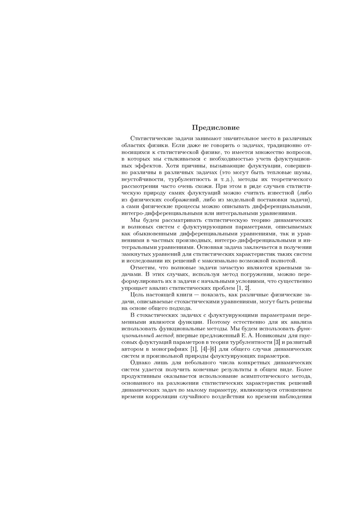 В книге на основе функционального подхода формулируются общие методы статистического описания и анализа стохастических динамических систем с флуктуирующими параметрами, описываемых обыкновенными дифференциальными уравнениями, уравнениями в частных производных, краевыми задачами и интегральными уравнениями. Рассматриваются также асимптотические методы анализа стохастических динамических систем (приближение дельта-коррелированного случайного поля и диффузионное приближение). Общие идеи иллюстрируются на примерах таких когерентных явлений в стохастических динамических системах, как кластеризация частиц и пассивной примеси в случайном поле скоростей и динамическая локализация плоских волн в слоистых случайных средах.