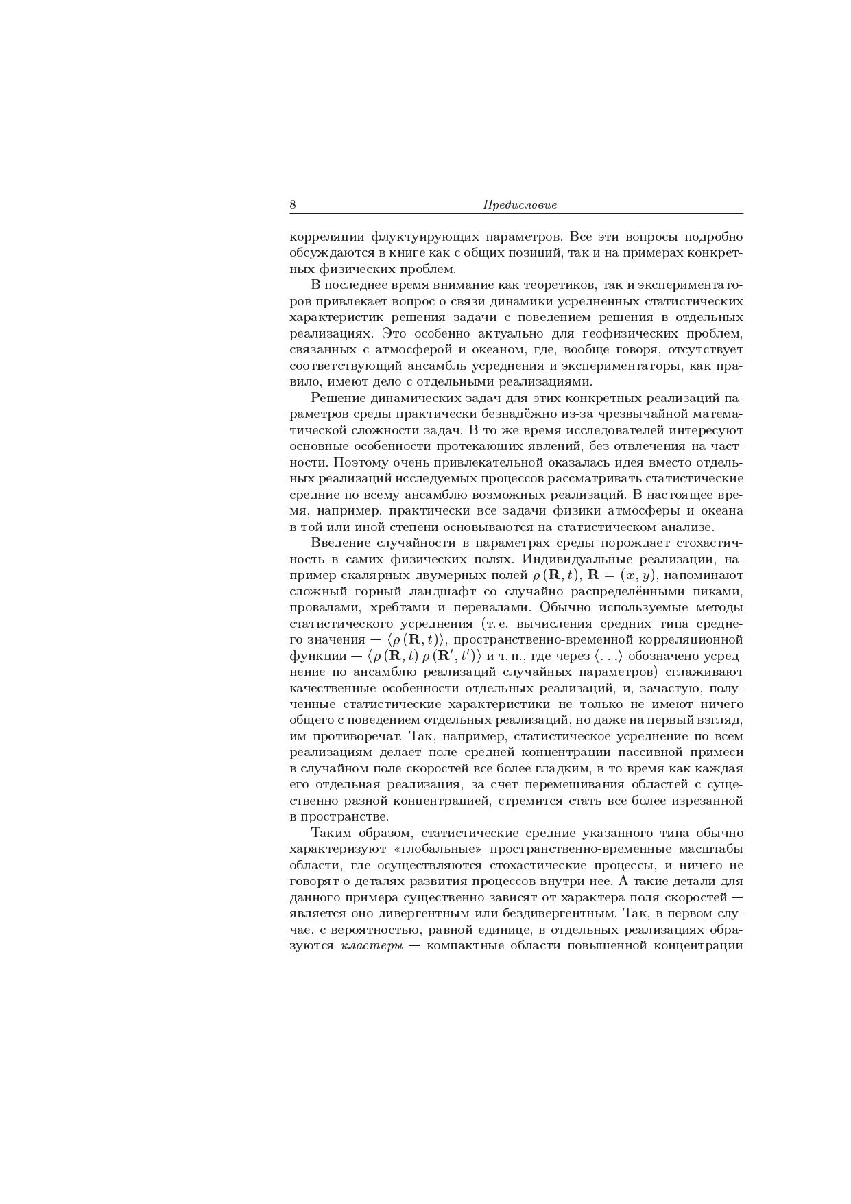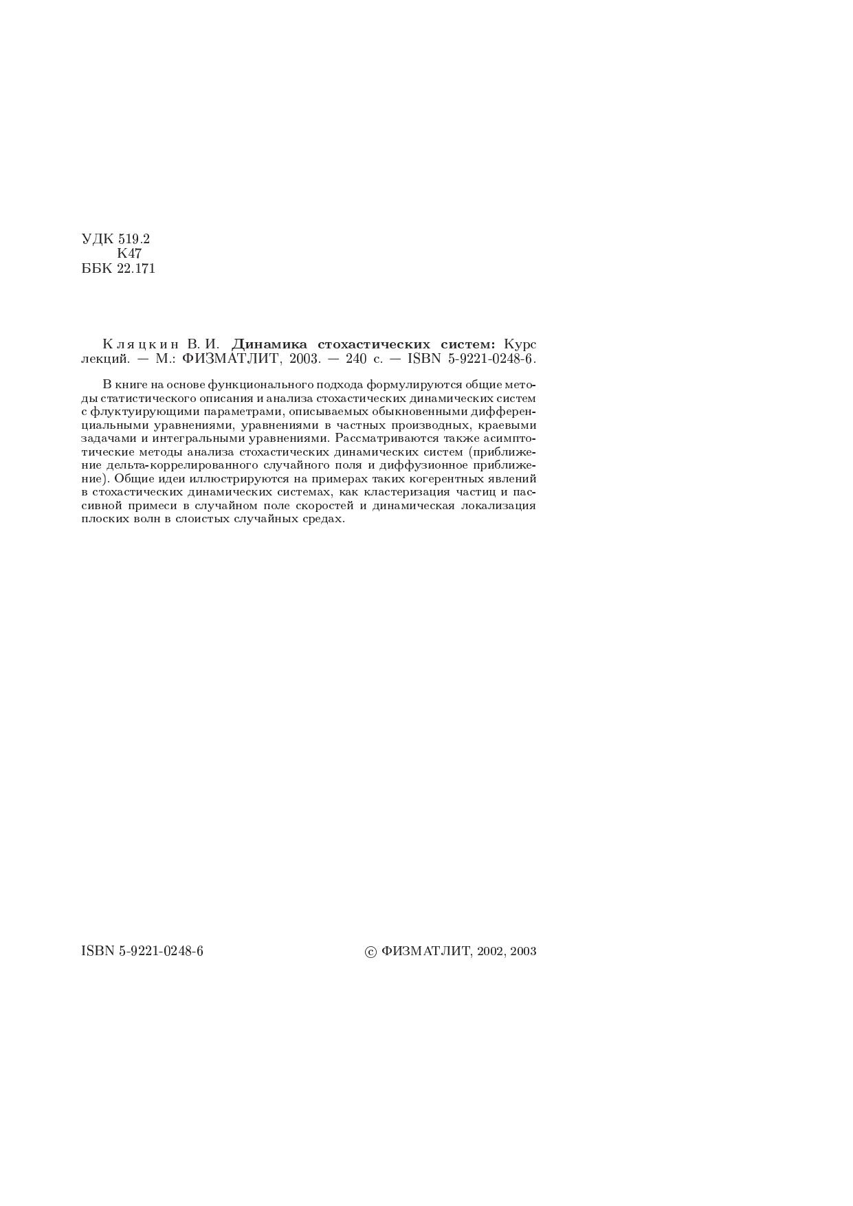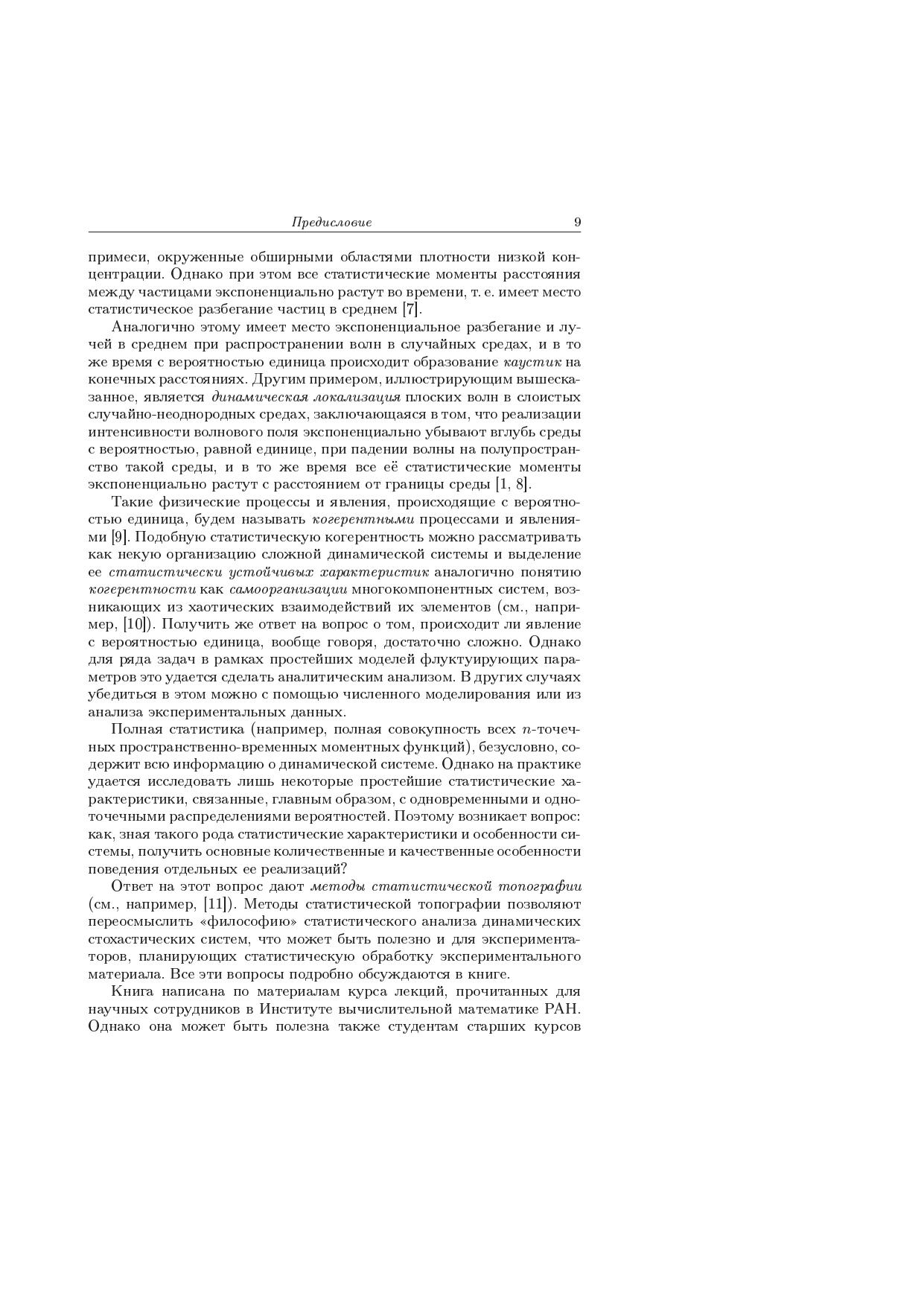 В книге на основе функционального подхода формулируются общие методы статистического описания и анализа стохастических динамических систем с флуктуирующими параметрами, описываемых обыкновенными дифференциальными уравнениями, уравнениями в частных производных, краевыми задачами и интегральными уравнениями. Рассматриваются также асимптотические методы анализа стохастических динамических систем (приближение дельта-коррелированного случайного поля и диффузионное приближение). Общие идеи иллюстрируются на примерах таких когерентных явлений в стохастических динамических системах, как кластеризация частиц и пассивной примеси в случайном поле скоростей и динамическая локализация плоских волн в слоистых случайных средах.