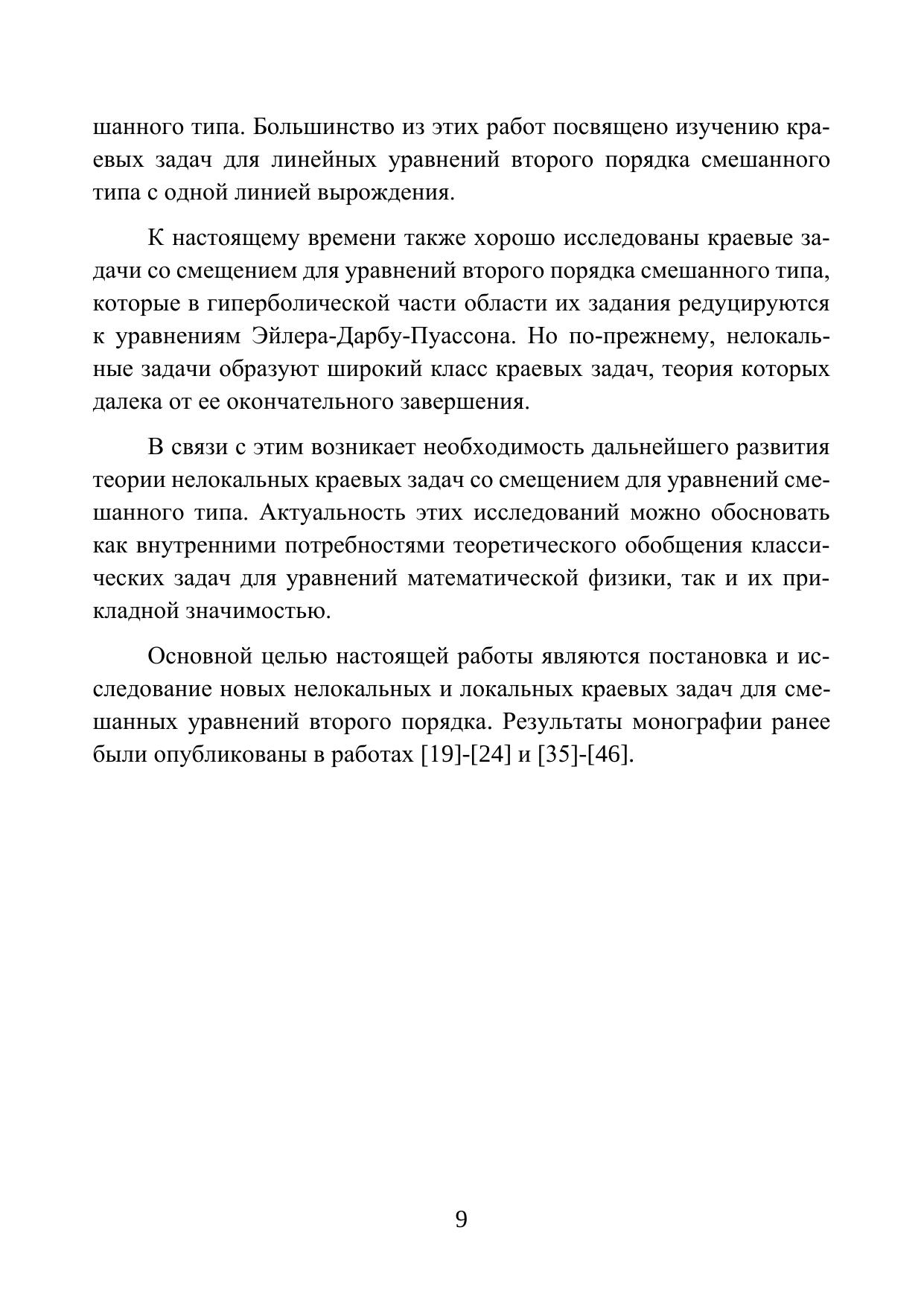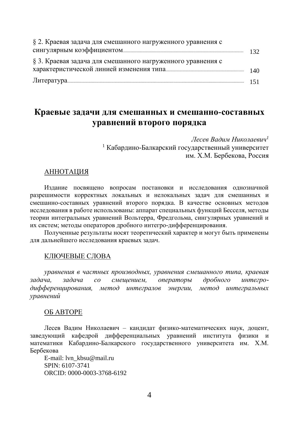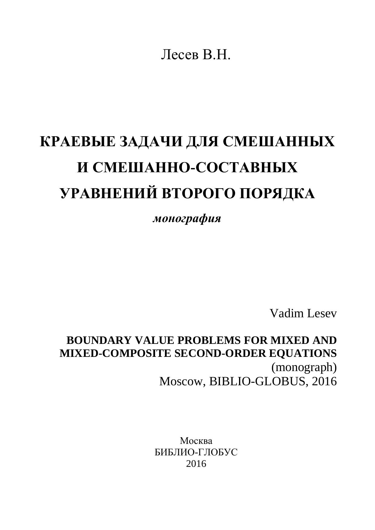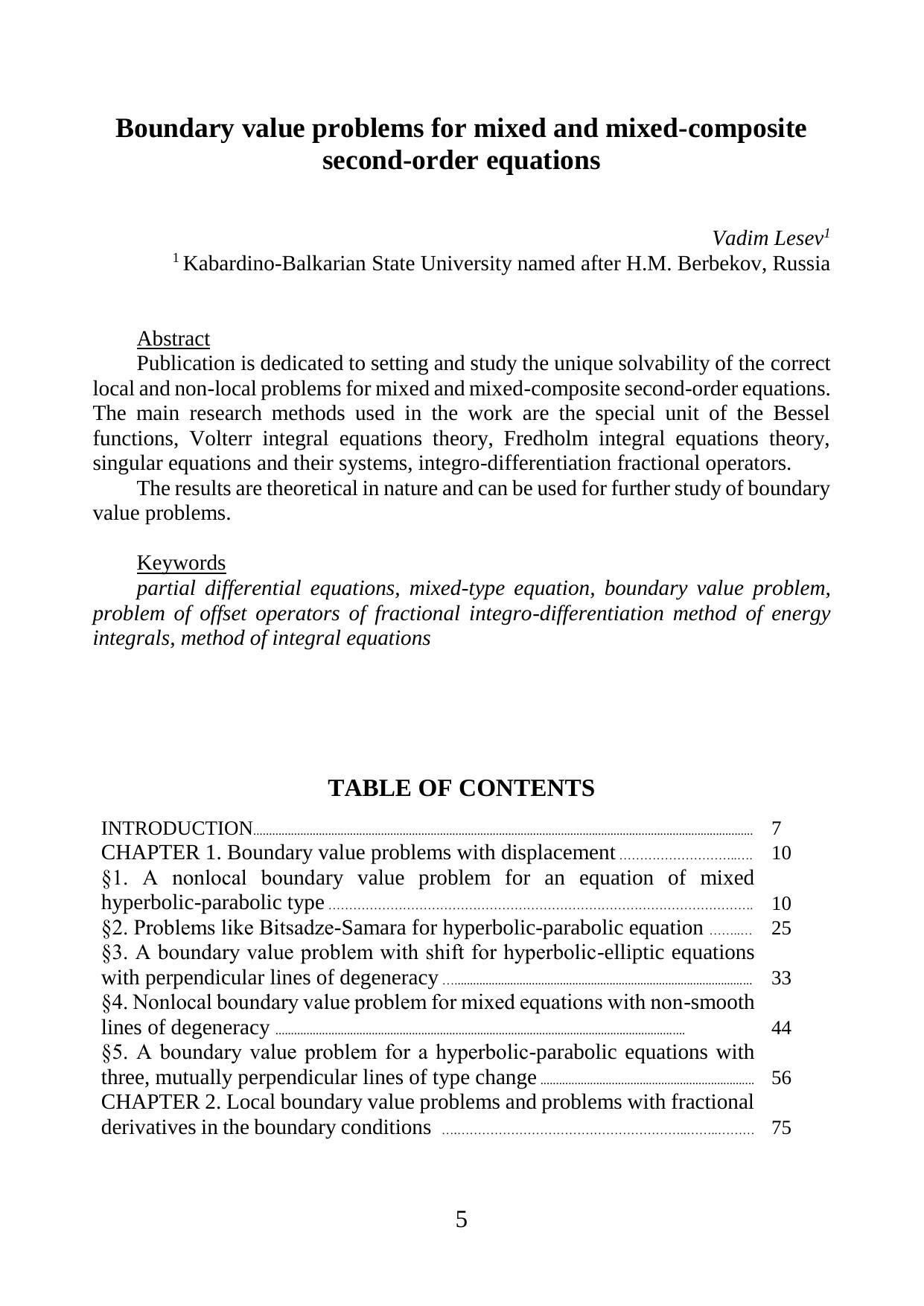 Издание посвящено вопросам постановки и исследования однозначной разрешимости корректных локальных и нелокальных задач для смешанных и смешанно-составных уравнений второго порядка. В качестве основных методов исследования в работе использованы: аппарат специальных функций Бесселя, методы теории интегральных уравнений Вольтерра, Фредгольма, сингулярных уравнений и их систем; методы операторов дробного интегро-дифференцирования. Полученные результаты носят теоретический характер и могут быть применены для дальнейшего исследования краевых задач.