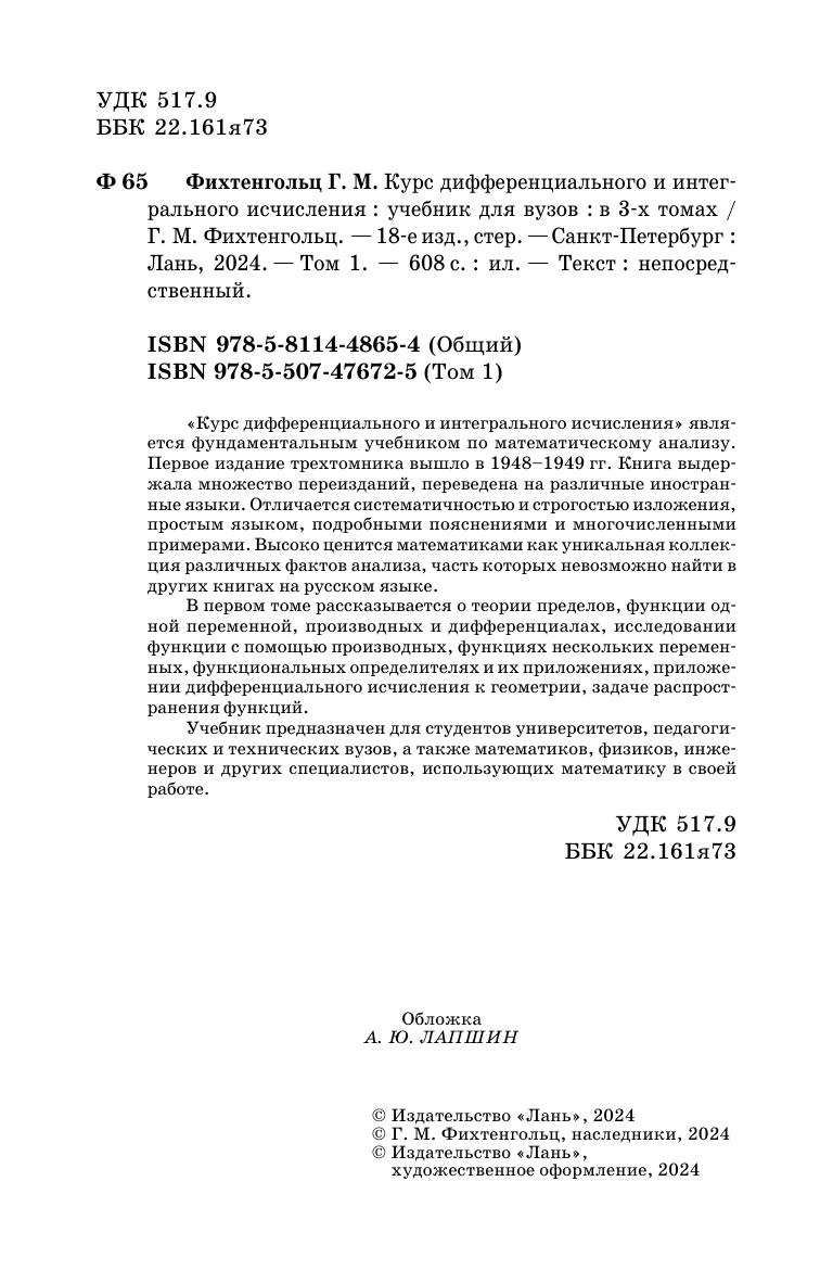«Курс дифференциального и интегрального исчисления» является фундаментальным учебником по математическому анализу. Первое издание трехтомного «Курса...» вышло в 1948–1949 гг. Книга выдержала множество переизданий, переведена на различные иностранные языки. Отличается систематичностью и строгостью изложения, простым языком, подробными пояснениями и многочисленными примерами. Высоко ценится математиками как уникальная коллекция различных фактов анализа, часть которых невозможно найти в других книгах на русском языке. В первом томе рассказывается о теории пределов, функции одной переменной, производных и дифференциалах, исследовании функции с помощью производных, функциях нескольких переменных, функциональных определителях и их приложениях, приложении дифференциального исчисления к геометрии, задаче распространения функций. Учебник предназначен для студентов университетов, педагогических и технических вузов, а также математиков, физиков, инженеров и других специалистов, использующих математику в своей работе.