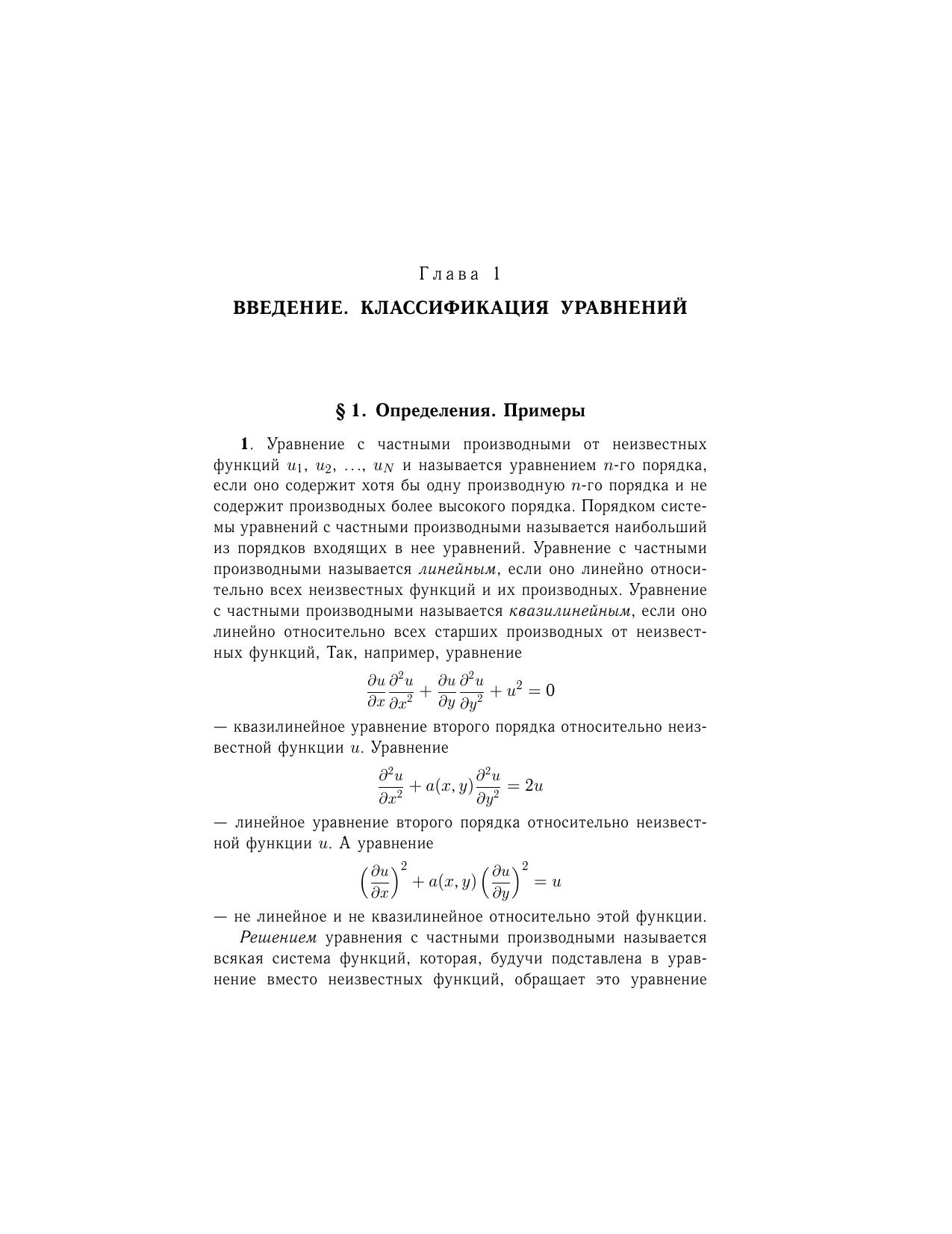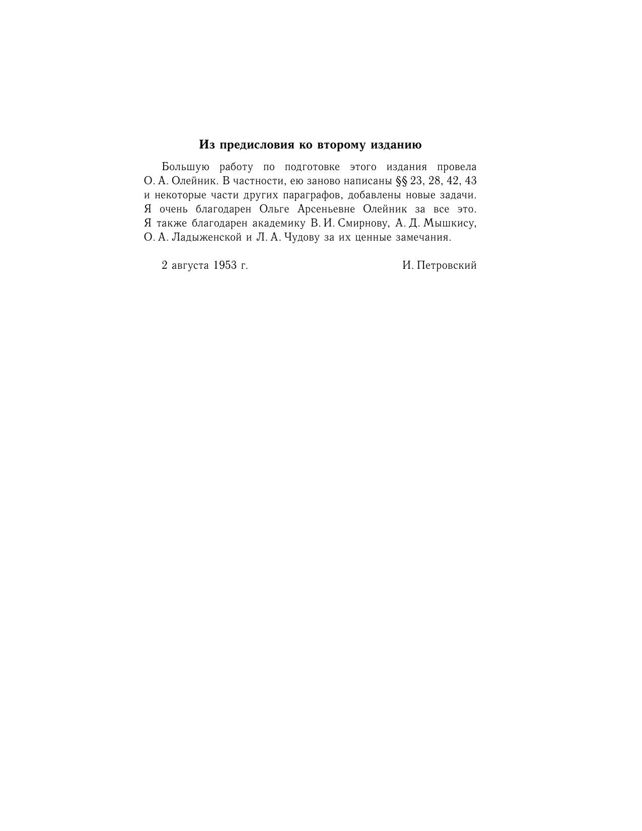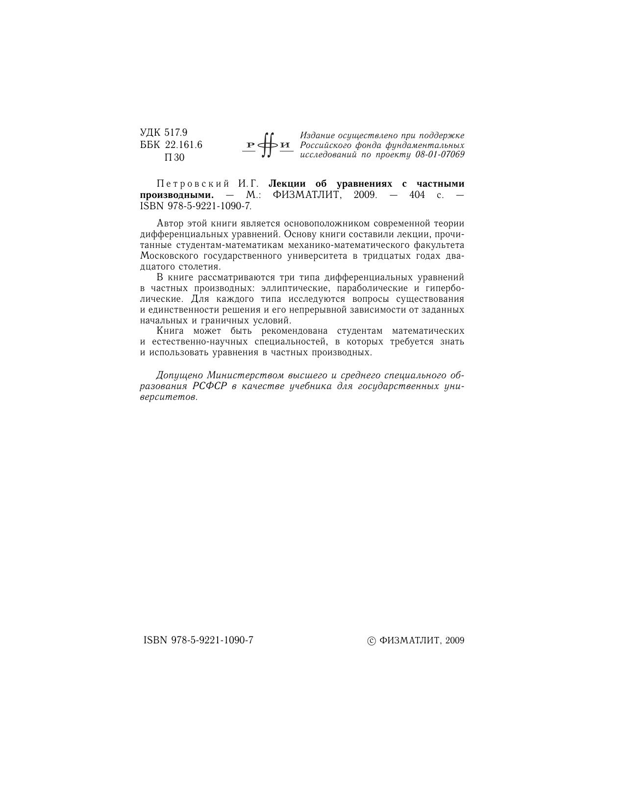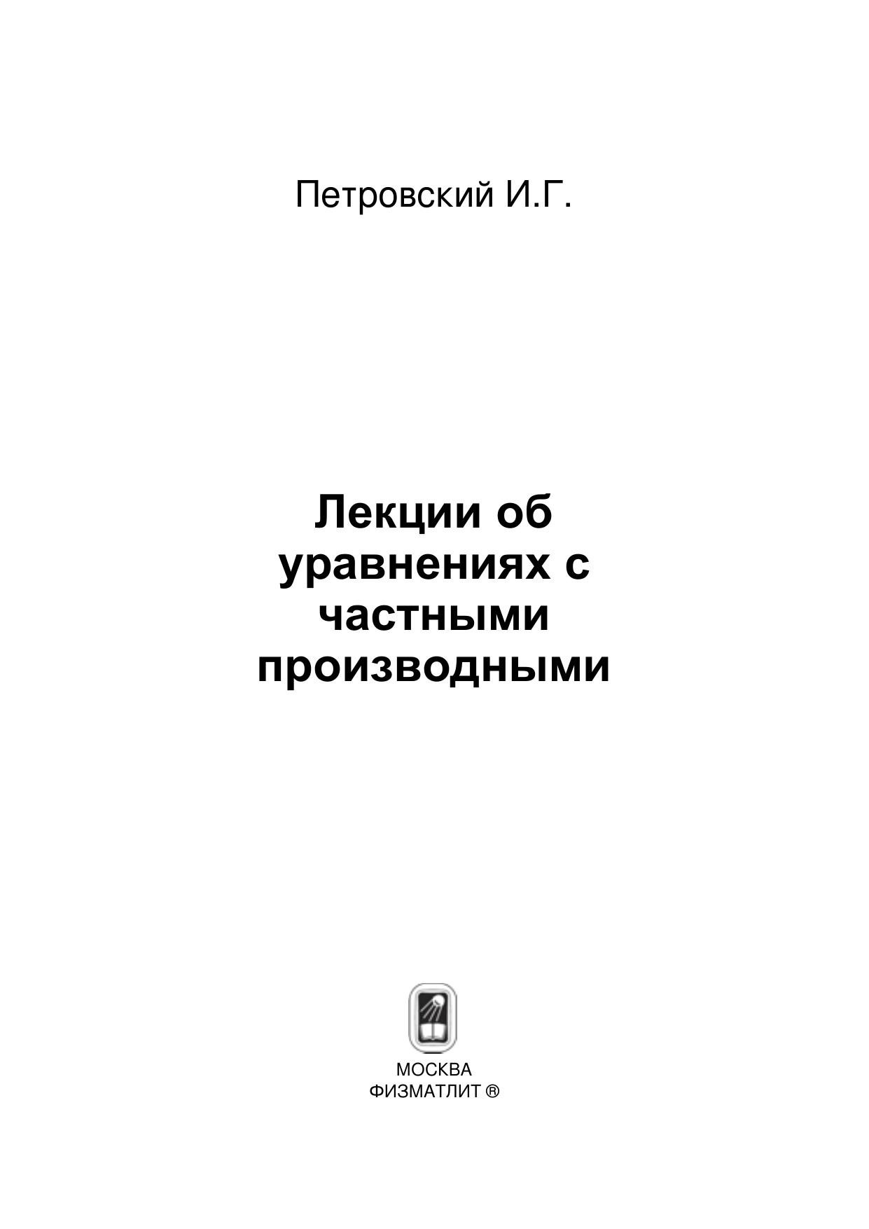 Автор этой книги является основоположником современной теории дифференциальных уравнений. Основу книги составили лекции, прочитанные студентам-математикам механико-математического факультета Московского государственного университета в тридцатых годах двадцатого столетия. В книге рассматриваются три типа дифференциальных уравнений в частных производных: эллиптические, параболические и гиперболические. Для каждого типа исследуются вопросы существования и единственности решения и его непрерывной зависимости от заданных начальных и граничных условий. Книга может быть рекомендована студентам математических и естественно-научных специальностей, в которых требуется знать и использовать уравнения в частных производных.