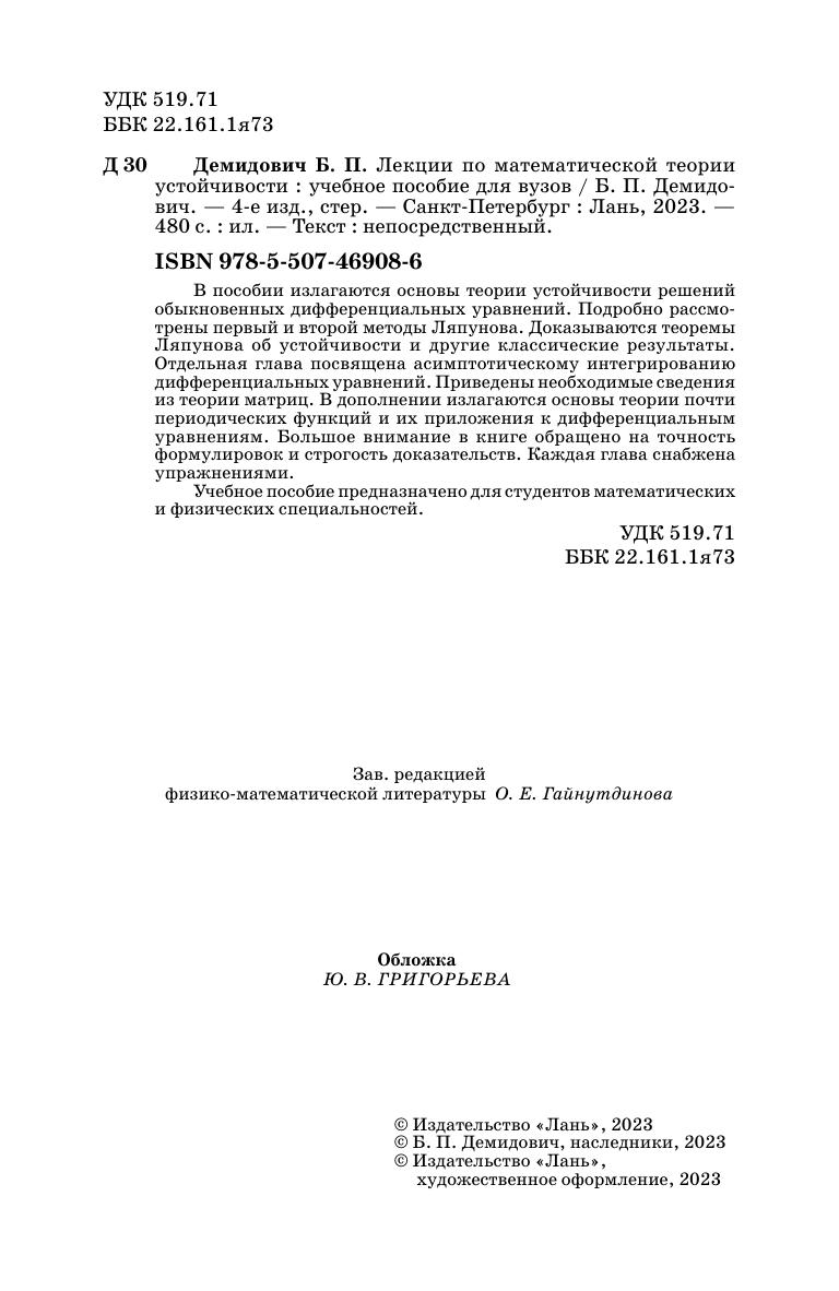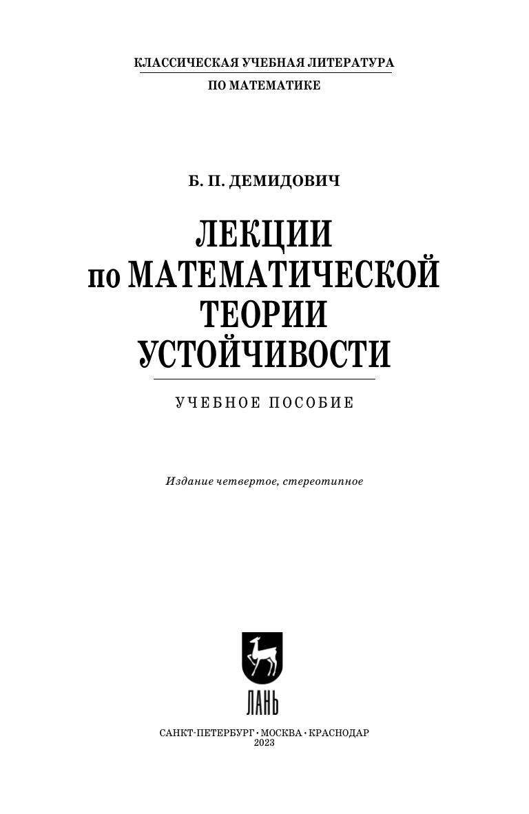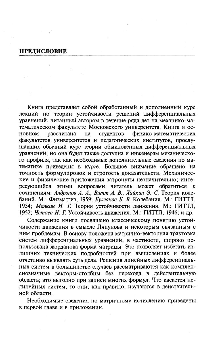 В пособии излагаются основы теории устойчивости решений обыкновенных дифференциальных уравнений. Подробно рассмотрены первый и второй методы Ляпунова. Доказываются теоремы Ляпунова об устойчивости и другие классические результаты. Отдельная глава посвящена асимптотическому интегрированию дифференциальных уравнений. Приведены необходимые сведения из теории матриц. В дополнении излагаются основы теории почти периодических функций и их приложения к дифференциальным уравнениям. Большое внимание в книге обращено на точность формулировок и строгость доказательств. Каждая глава снабжена упражнениями. Учебное пособие предназначено для студентов математических и физических специальностей.