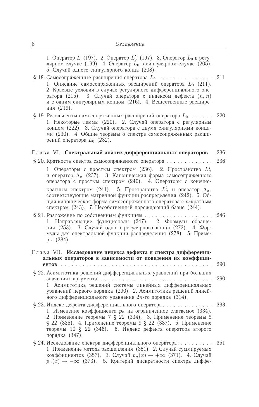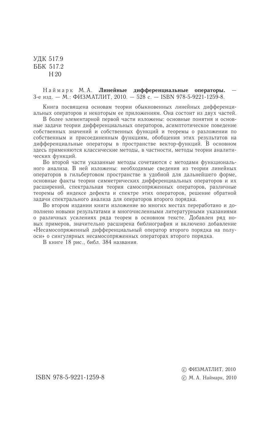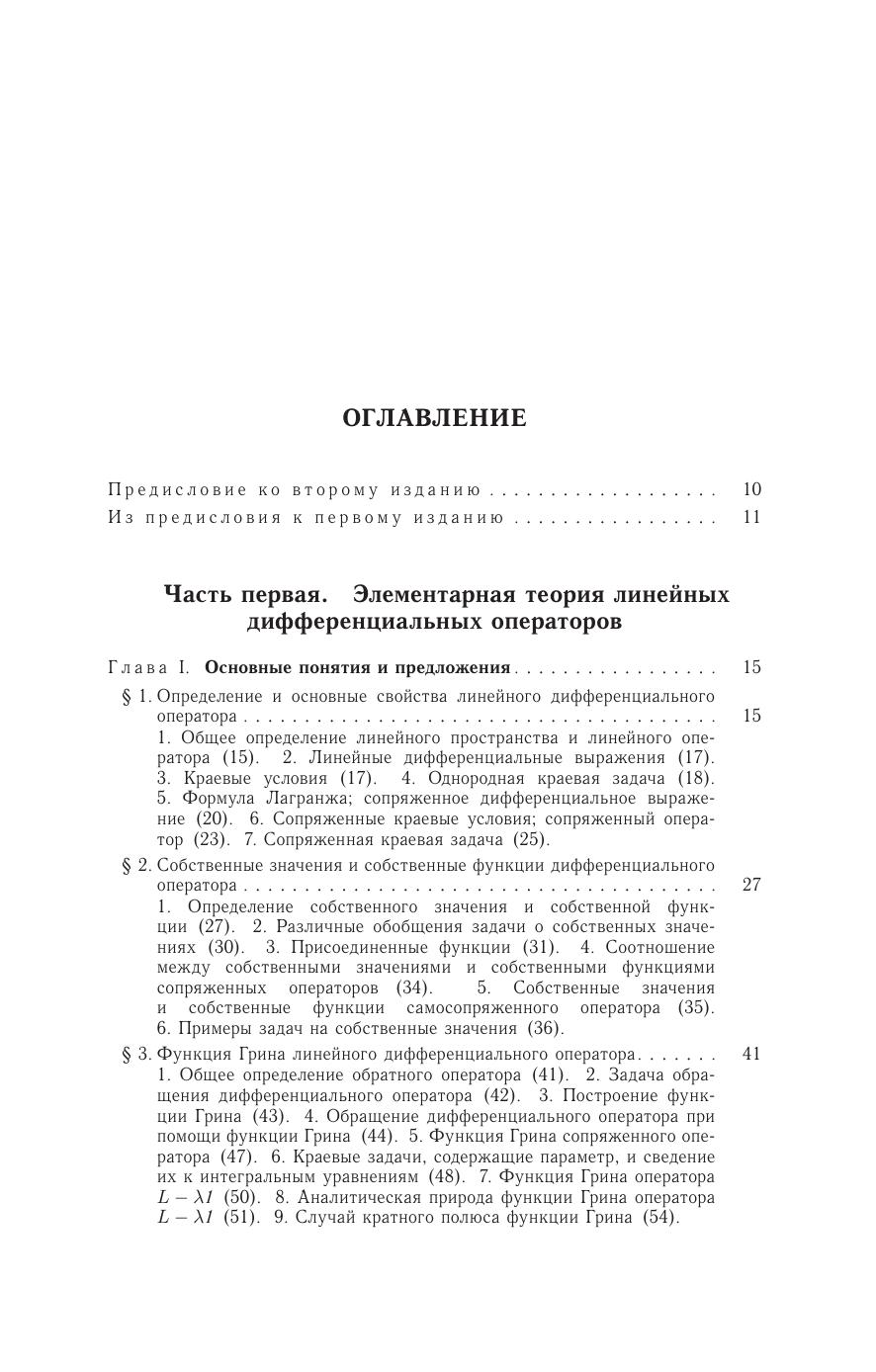 Книга посвящена основам теории обыкновенных линейных дифференциальных операторов и некоторым ее приложениям. Она состоит из двух частей. В более элементарной первой части изложены: основные понятия и основные задачи теории дифференциальных операторов, асимптотическое поведение собственных значений и собственных функций и теоремы о разложении по собственным и присоединенным функциям, обобщения этих результатов на дифференциальные операторы в пространстве вектор-функций. В основном здесь применяются классические методы, в частности, методы теории аналитических функций. Во второй части указанные методы сочетаются с методами функционального анализа. В ней изложены: необходимые сведения из теории линейных операторов в гильбертовом пространстве в удобной для дальнейшего форме, основные факты теории симметрических дифференциальных операторов и их расширений, спектральная теория самосопряженных операторов, различные теоремы оби ндексе дефекта и спектре этих операторов, решение обратной задачи спектрального анализа для операторов второго порядка. Во втором издании книги изложение во многих местах переработано и дополнено новыми результатами и многочисленными литературными указаниями о различных усилениях ряда теорем в основном тексте. Добавлен ряд новых примеров, значительно расширена библиография и включено добавление «Несамосопряженный дифференциальный оператор второго порядка на полуоси» о сингулярных несамоcопряженных операторах второго порядка.