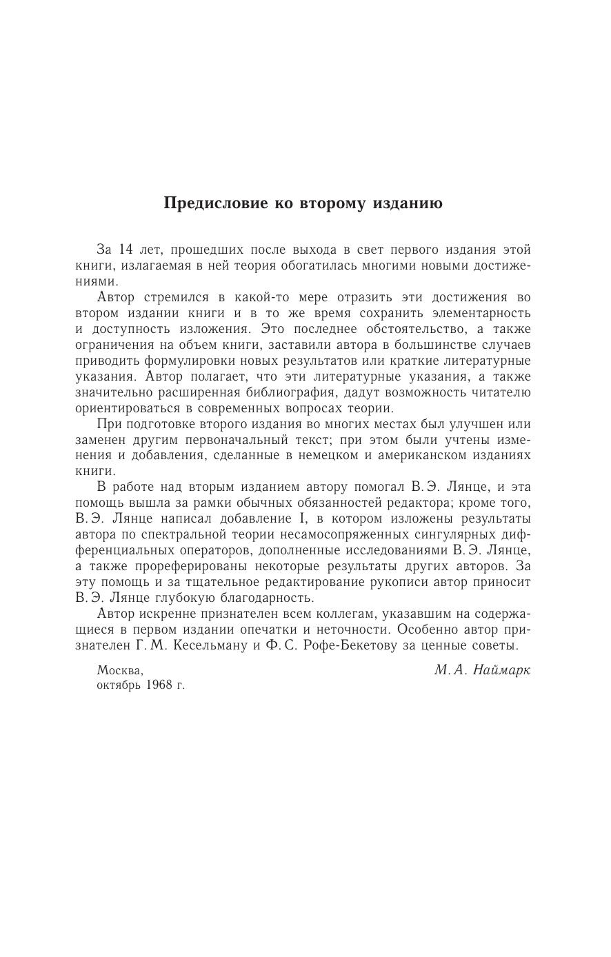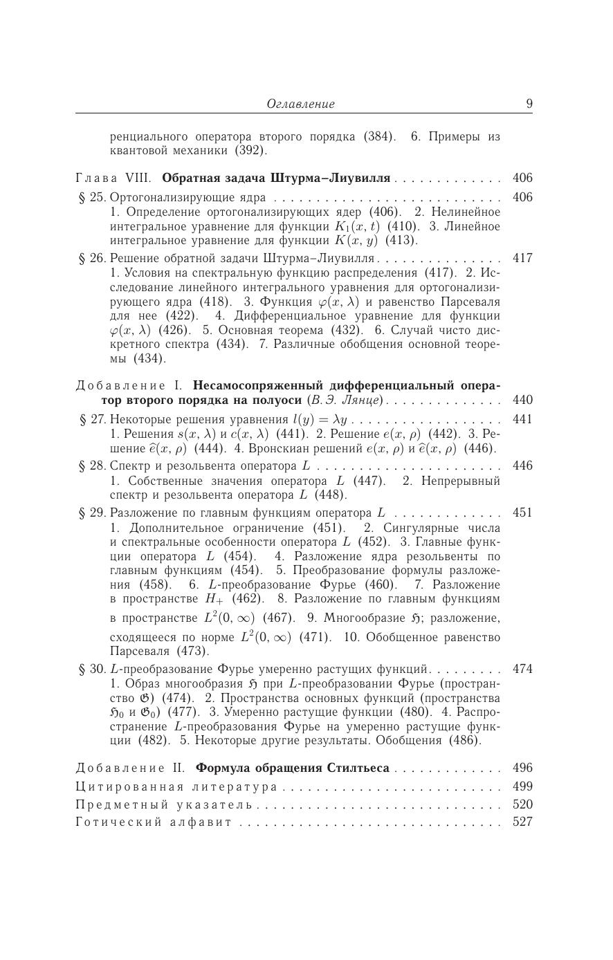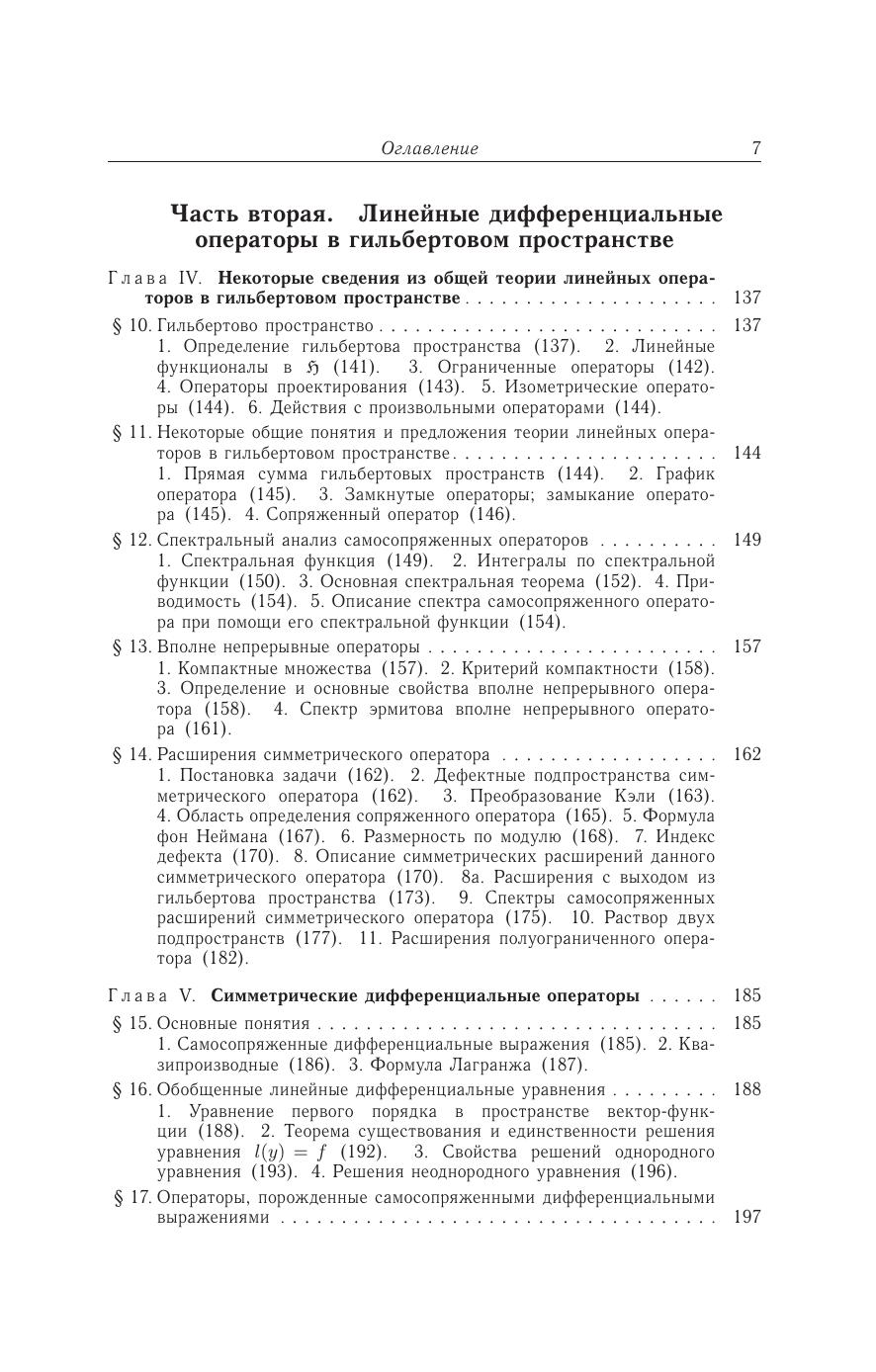 Книга посвящена основам теории обыкновенных линейных дифференциальных операторов и некоторым ее приложениям. Она состоит из двух частей. В более элементарной первой части изложены: основные понятия и основные задачи теории дифференциальных операторов, асимптотическое поведение собственных значений и собственных функций и теоремы о разложении по собственным и присоединенным функциям, обобщения этих результатов на дифференциальные операторы в пространстве вектор-функций. В основном здесь применяются классические методы, в частности, методы теории аналитических функций. Во второй части указанные методы сочетаются с методами функционального анализа. В ней изложены: необходимые сведения из теории линейных операторов в гильбертовом пространстве в удобной для дальнейшего форме, основные факты теории симметрических дифференциальных операторов и их расширений, спектральная теория самосопряженных операторов, различные теоремы оби ндексе дефекта и спектре этих операторов, решение обратной задачи спектрального анализа для операторов второго порядка. Во втором издании книги изложение во многих местах переработано и дополнено новыми результатами и многочисленными литературными указаниями о различных усилениях ряда теорем в основном тексте. Добавлен ряд новых примеров, значительно расширена библиография и включено добавление «Несамосопряженный дифференциальный оператор второго порядка на полуоси» о сингулярных несамоcопряженных операторах второго порядка.