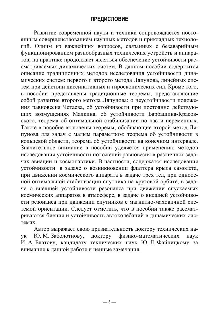Изложены основные понятия и теоремы современной теории устойчивости для систем в первом приближении, консервативных систем, систем с учетом диссипативных и гироскопических сил, систем с малым параметром. Основное внимание уделяется второму методу Ляпунова и его модификациям. Теоретический материал в пособии сопровождается разнообразными примерами применения теории устойчивости в авиации и космонавтике. Рассматриваются интересные динамические явления: биения, автоколебания, флаттер, внешняя устойчивость резонансов. Пособие предназначено для студентов вузов, обучающихся по направлениям подготовки и специальностям, входящим в УГС: «Математика и механика», «Физика и астрономия», «Электроника, радиотехника и системы связи», «Электро- и теплотехника», «Физико-технические науки и технологии», «Машиностроение», «Технологии материалов», «Авиационная и ракетно-космическая техника», и другим инженерно-техническим направлениям подготовки. Книга будет полезна аспирантам, преподавателям и специалистам в области динамики твердого тела и механики космического полета.