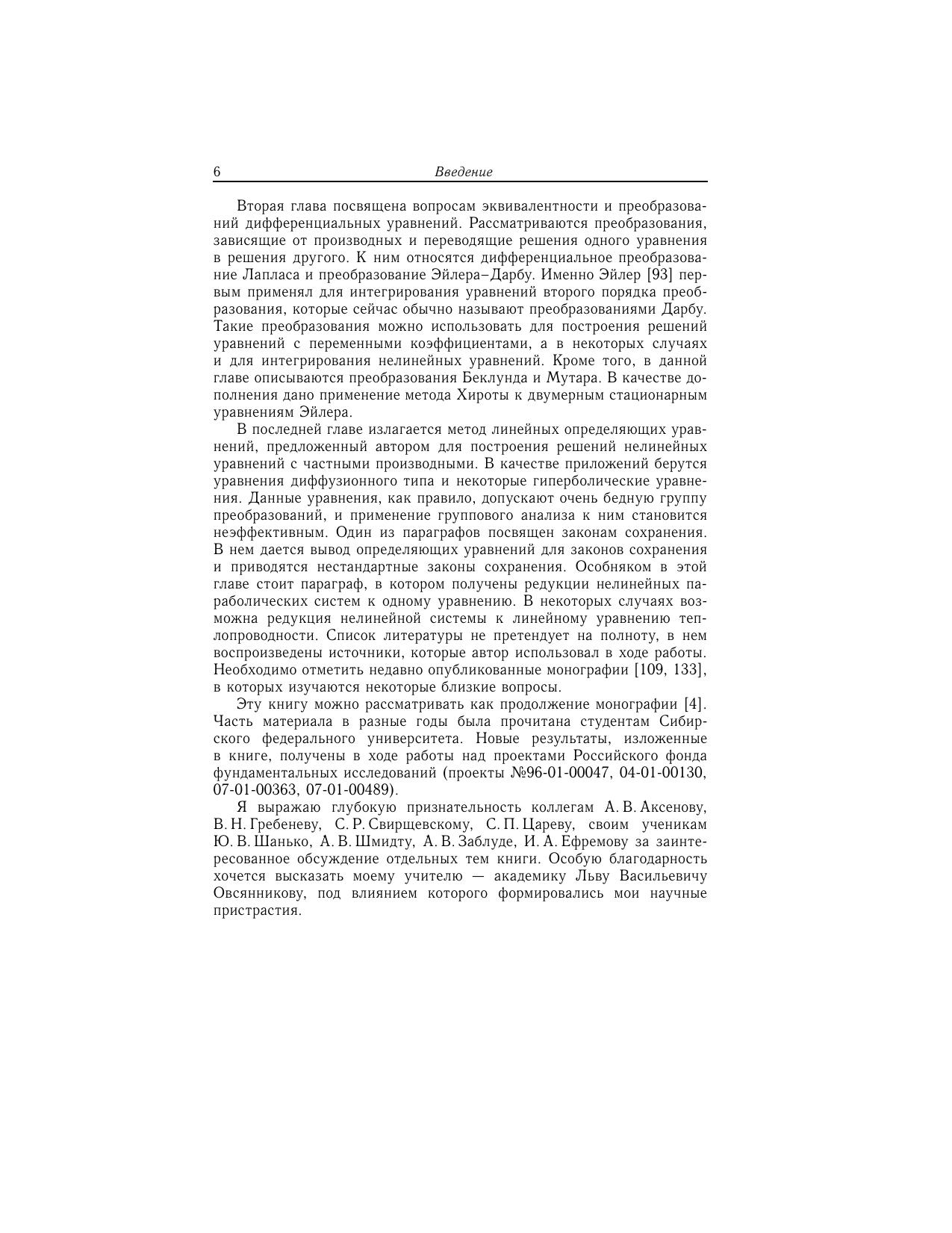 В монографии представлен ряд методов построения точных решений линейных и нелинейных уравнений с частными производными. Изложение ведется в рамках двух основных парадигм: непрерывные преобразования и инвариантность. Особое внимание уделяется таким подходам, как методы интегрирования Дарбу, Эйлера, Беклунда, Мутара. Дано обобщение классических методов для систем дифференциальных уравнений, подробно описан новый способ интегрирования - метод линейных определяющих уравнений. С характеристиками систем уравнений связываются инвариантные тензоры и интегральные инварианты, обсуждаются локальные законы сохранения. В качестве приложений рассмотрены математические модели механики сплошной среды: от гидродинамики до нелинейной теплопроводности. Книга рассчитана на широкий круг читателей - математиков, механиков, физиков, преподавателей вузов и студентов.