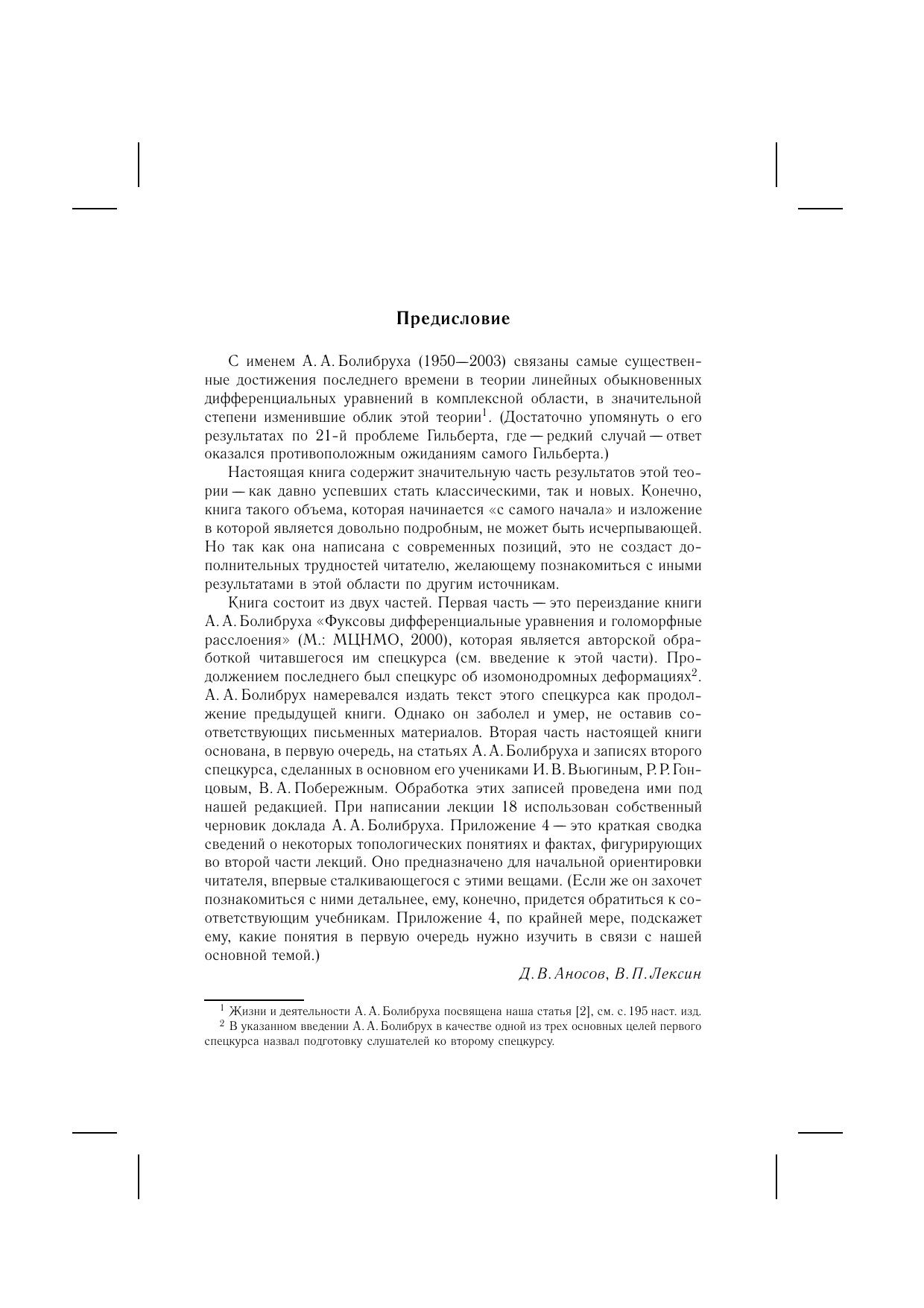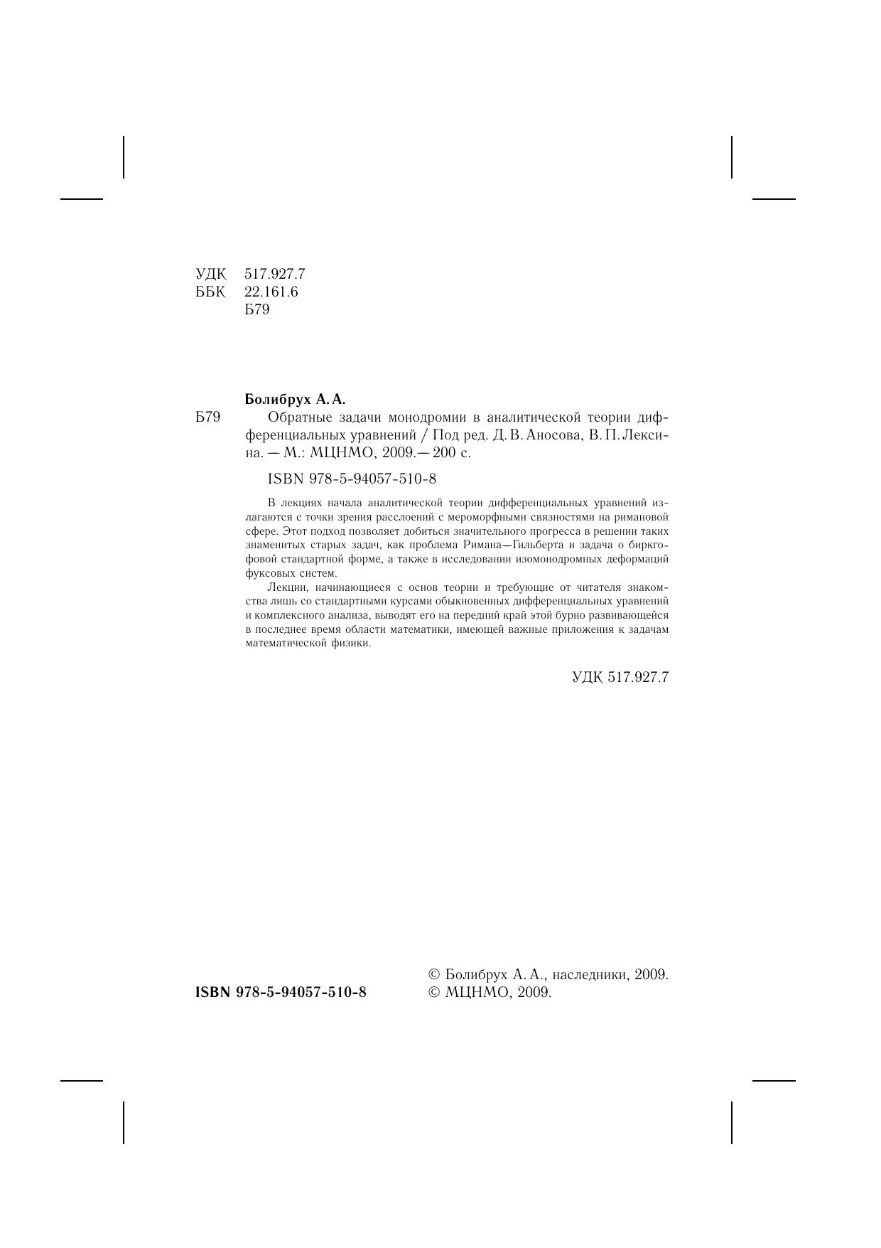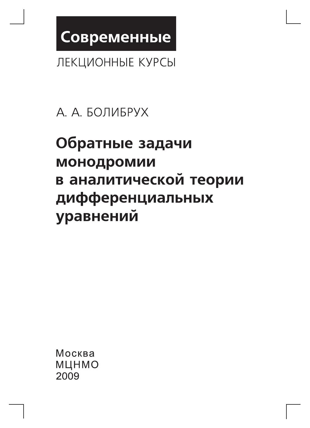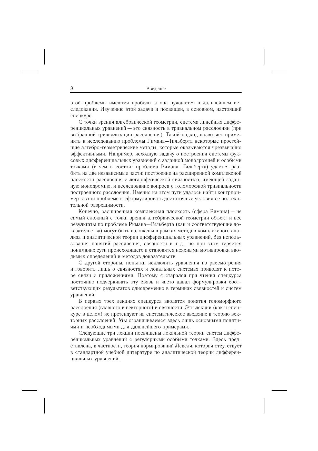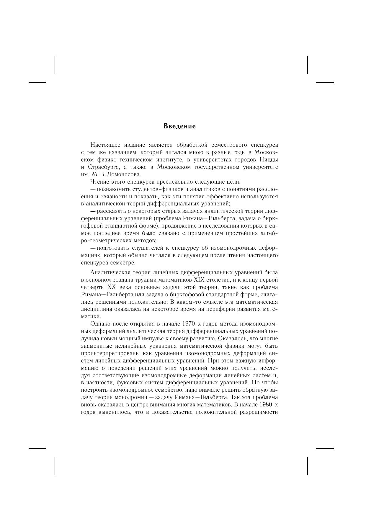 В лекциях начала аналитической теории дифференциальных уравнений излагаются с точки зрения расслоений с мероморфными связностями на римановой сфере. Этот подход позволяет добиться значительного прогресса в решении таких знаменитых старых задач, как проблема Римана–Гильберта и задача о биркгофовой стандартной форме, а также в исследовании изомонодромных деформаций фуксовых систем.Лекции, начинающиеся с основ теории и требующие от читателя знакомства лишь со стандартными курсами обыкновенных дифференциальных уравнений и комплексного анализа, выводят его на передний край этой бурно развивающейся в последнее время области математики, имеющей важные приложения к задачам математической физики.