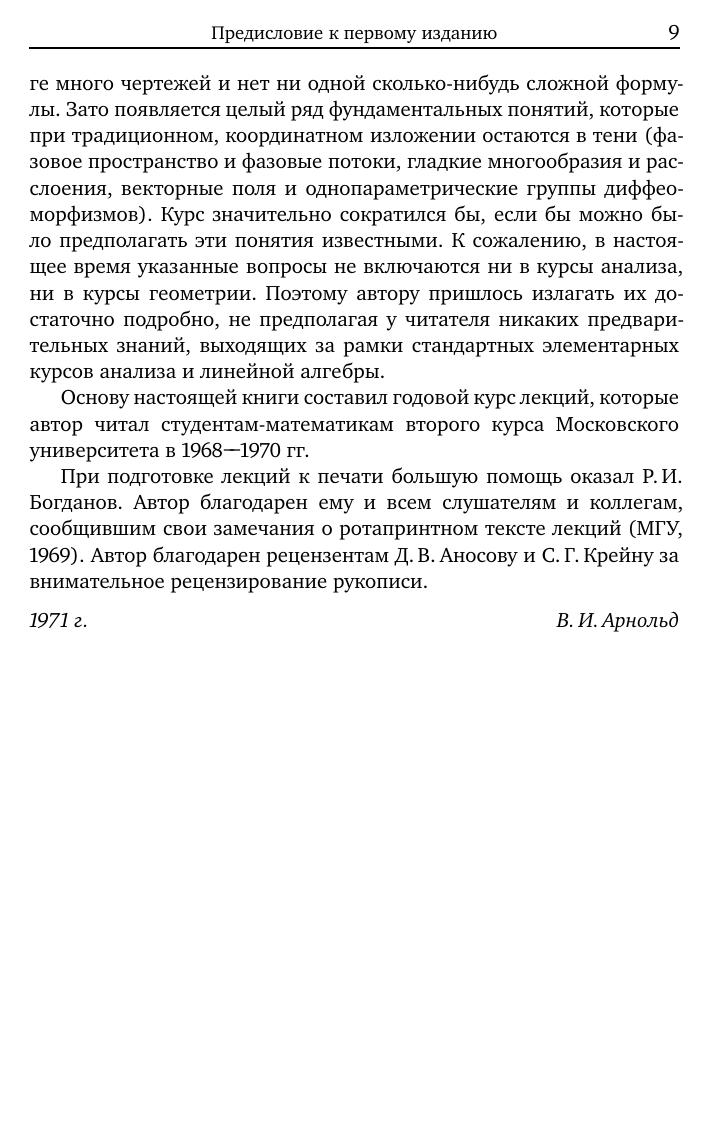 За сорок лет, прошедших со времени выхода первого издания, этот учебник успел стать классическим.Большое внимание уделяется геометрическомусмыслу основных понятий. В книге прослеживается тесная связь предмета с приложениями, в особенности с механикой. При изложении делается упор не на формулы, а на геометрический смысл основных определений и теорем. Автор знакомит читателя с такими понятиями, как многообразия, однопараметрические группы диффеоморфизмов, касательные пространства и расслоения. В число рассматриваемых примеров из механики входит исследование фазовых портретов консервативных систем с одной степенью свободы, теория малых колебаний, параметрический резонанс. Книга предназначена для студентов и аспирантов математических факультетов университетов и вузов с расширенной программой по математике.