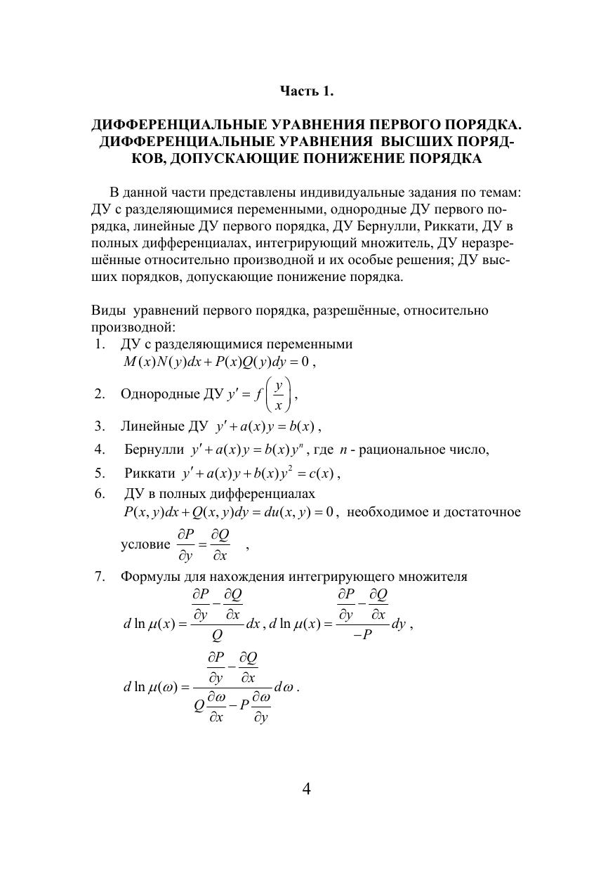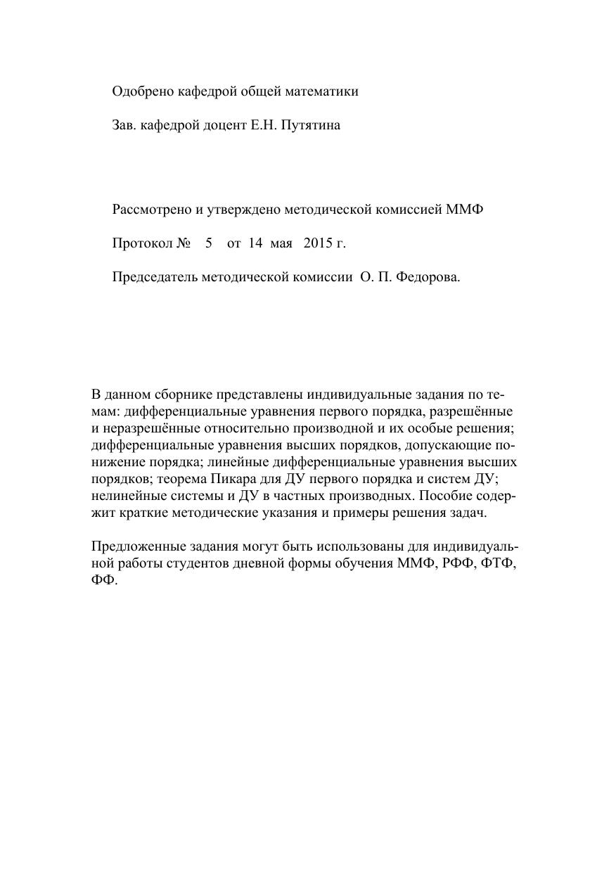 В данном сборнике представлены индивидуальные задания по темам: дифференциальные уравнения первого порядка, разрешённые и неразрешённые относительно производной и их особые решения, дифференциальные уравнения высших порядков, допускающие понижение порядка, линейные дифференциальные уравнения высших порядков, теорема Пикара для ДУ первого порядка и систем ДУ, нелинейные системы и ДУ в частных производных. Пособие содержит краткие методические указания и примеры решения задач. Предложенные задания могут быть использованы для индивидуальной работы студентов дневной формы обучения ММФ, РФФ, ФТФ, ФФ.