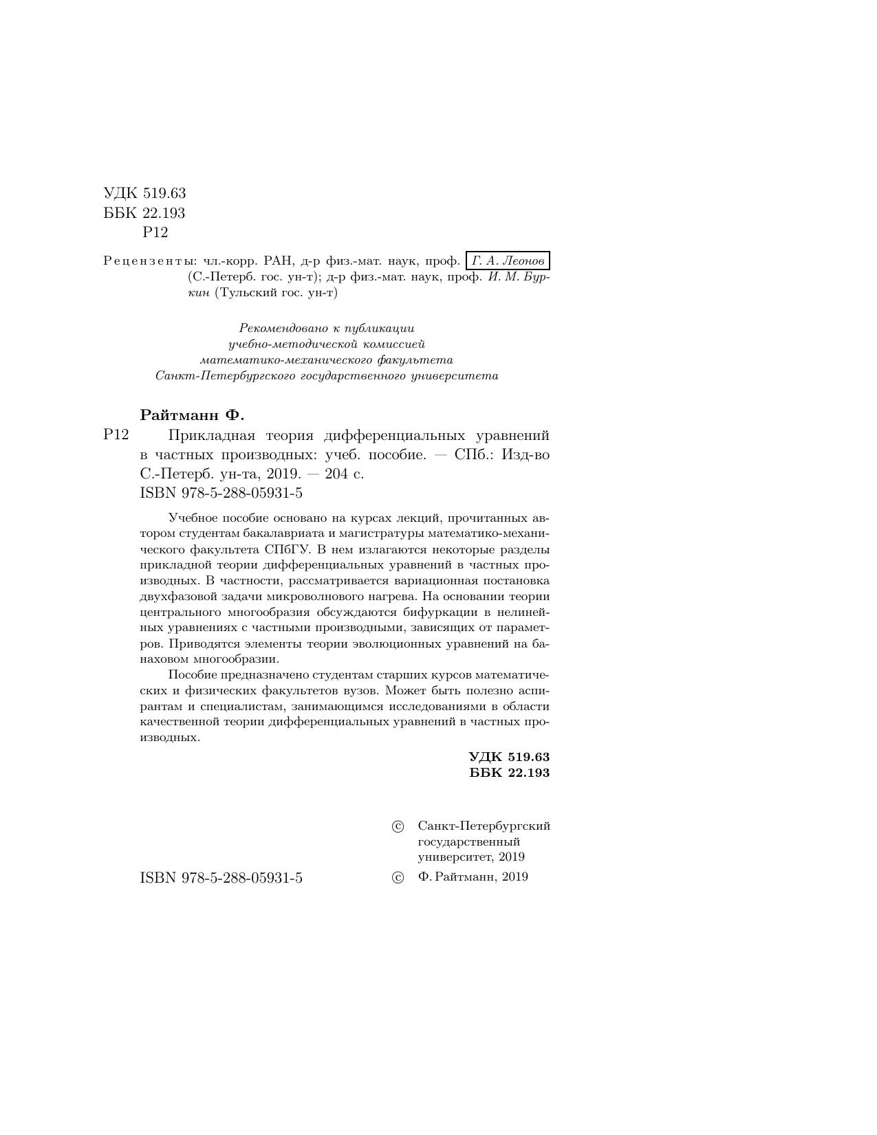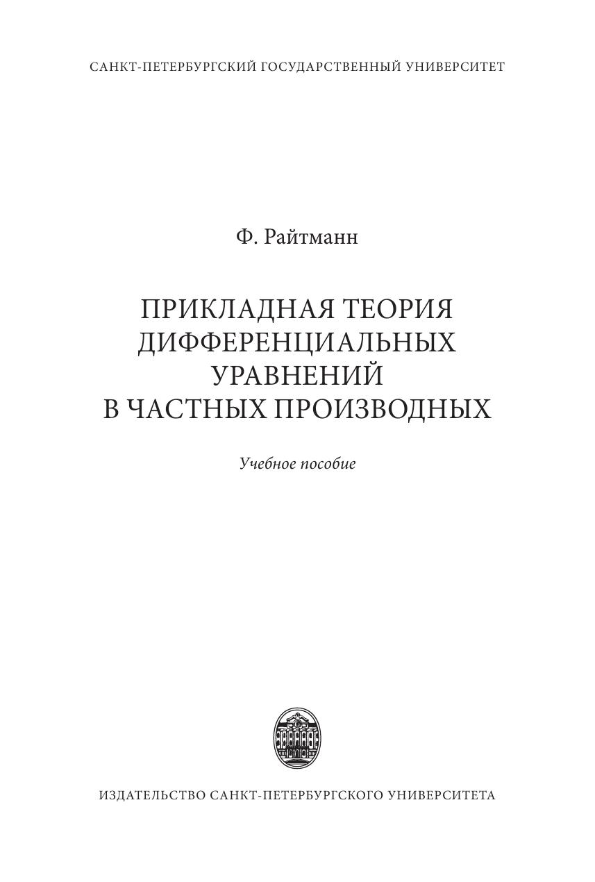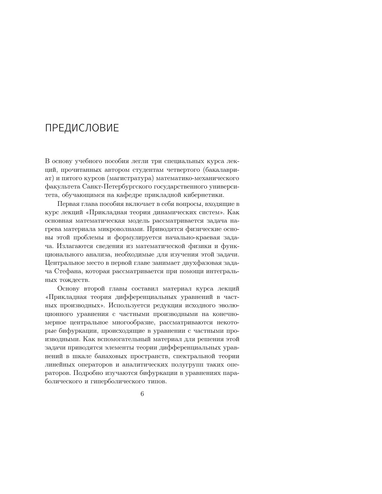 Учебное пособие основано на курсах лекций, прочитанных автором студентам бакалавриата и магистратуры математико-механического факультета СПбГУ. В нем излагаются некоторые разделы прикладной теории дифференциальных уравнений в частных производных. В частности, рассматривается вариационная постановка двухфазовой задачи микроволнового нагрева. На основании теории центрального многообразия обсуждаются бифуркации в нелинейных уравнениях с частными производными, зависящих от параметров. Приводятся элементы теории эволюционных уравнений на банаховом многообразии. Пособие предназначено студентам старших курсов математических и физических факультетов вузов. Может быть полезно аспирантам и специалистам, занимающимся исследованиями в области качественной теории дифференциальных уравнений в частных производных.