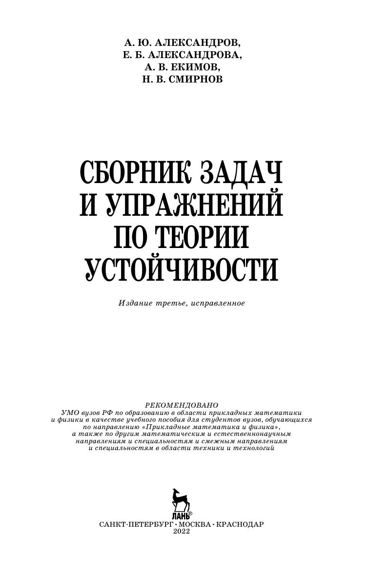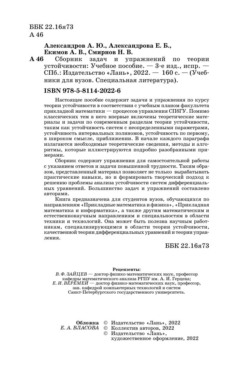 Настоящее пособие содержит задачи и упражнения по курсу теории устойчивости в соответствии с учебным планом факультета прикладной математики процессов управления СПбГУ. Помимо классических тем в него впервые включены теоретические материалы и задачи по современным разделам теории устойчивости, таким как устойчивость систем с неопределенными параметрами, устойчивость интервальных полиномов, устойчивость по первому, в широком смысле, приближении. В начале каждого параграфа излагаются необходимые теоретические сведения, методы и алгоритмы, которые иллюстрируются подробно разобранными примерами. Сборник содержит упражнения для самостоятельной работы с указанием ответов и задачи повышенной трудности. Таким образом, представленный материал позволяет не только вырабатывать практические навыки, но и формировать творческий подход к решению проблемы анализа устойчивости систем дифференциальных уравнений. Большинство задач и упражнений составлено авторами. Книга предназначена для студентов вузов, обучающихся по направлениям «Прикладные математика и физика», «Прикладная математика и информатика», а также другим математическим и естественнонаучным направлениям и специальностям в области техники и технологий. Она может быть полезна научным работникам, специализирующимся в области теории устойчивости, качественной теории дифференциальных уравнений и теории управления.