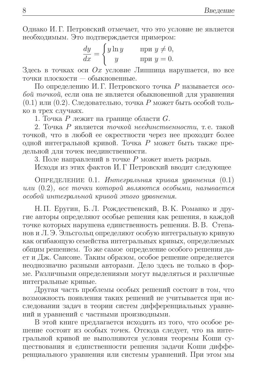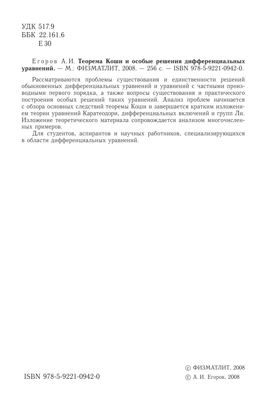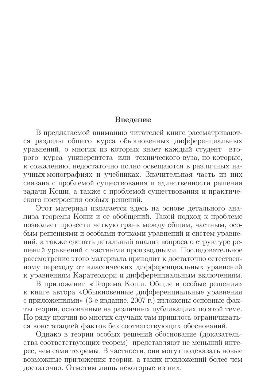 Рассматриваются проблемы существования и единственности решений обыкновенных дифференциальных уравнений и уравнений с частными производными первого порядка, а также вопросы существования и практического построения особых решений таких уравнений. Анализ проблем начинается с обзора основных следствий теоремы Коши и завершается кратким изложением теории уравнений Каратеодори, дифференциальных включений и групп Ли. Изложение теоретического материала сопровождается анализом многочисленных примеров.Для студентов, аспирантов и научных работников, специализирующихся в области дифференциальных уравнений.