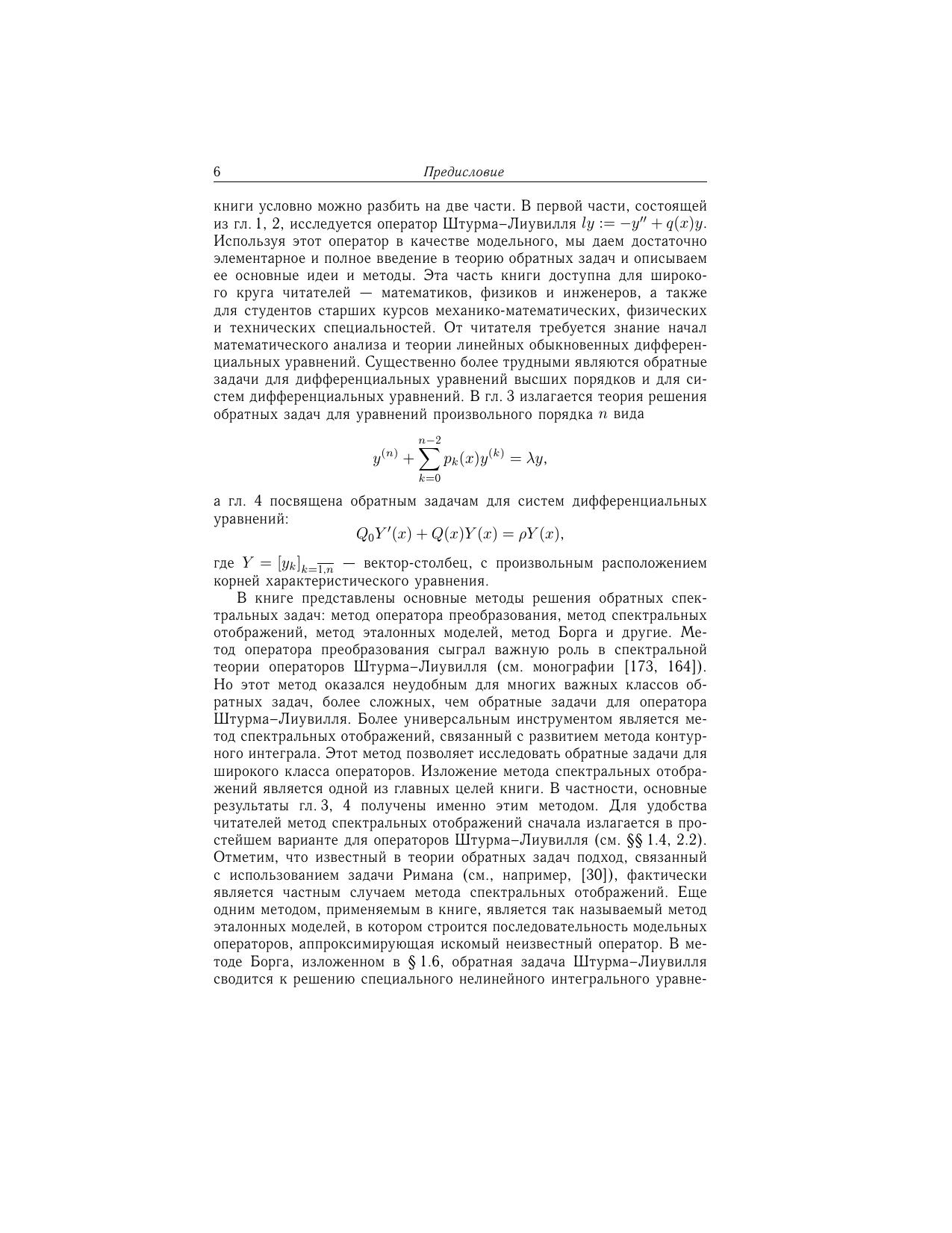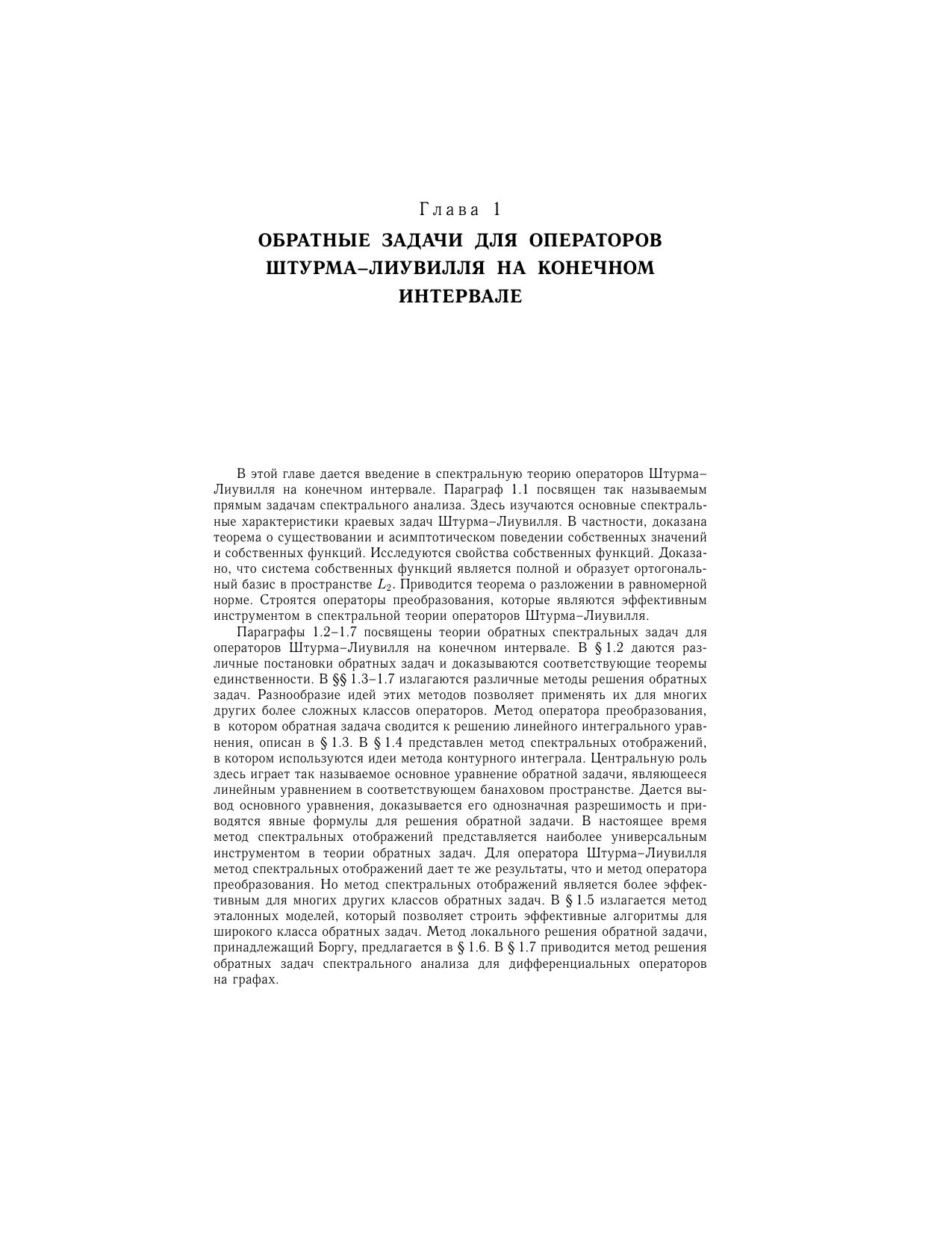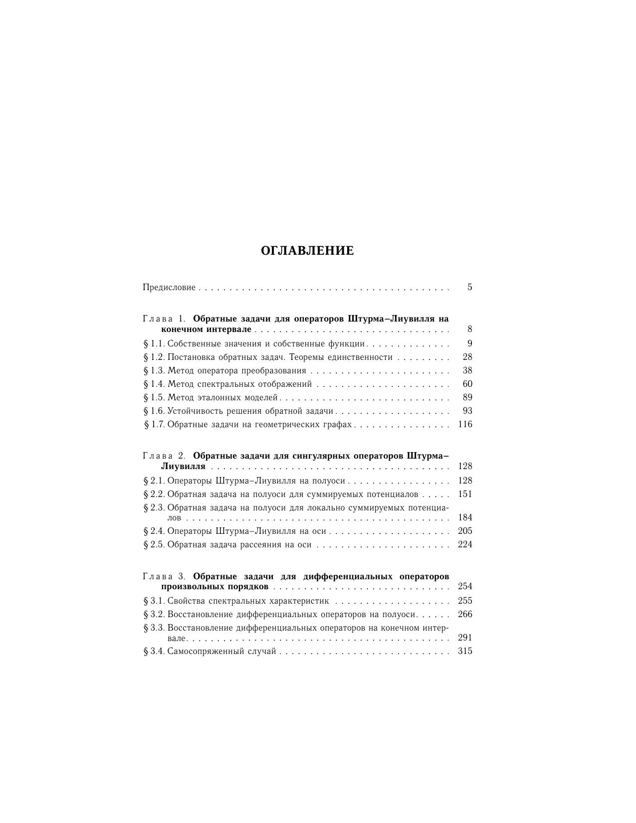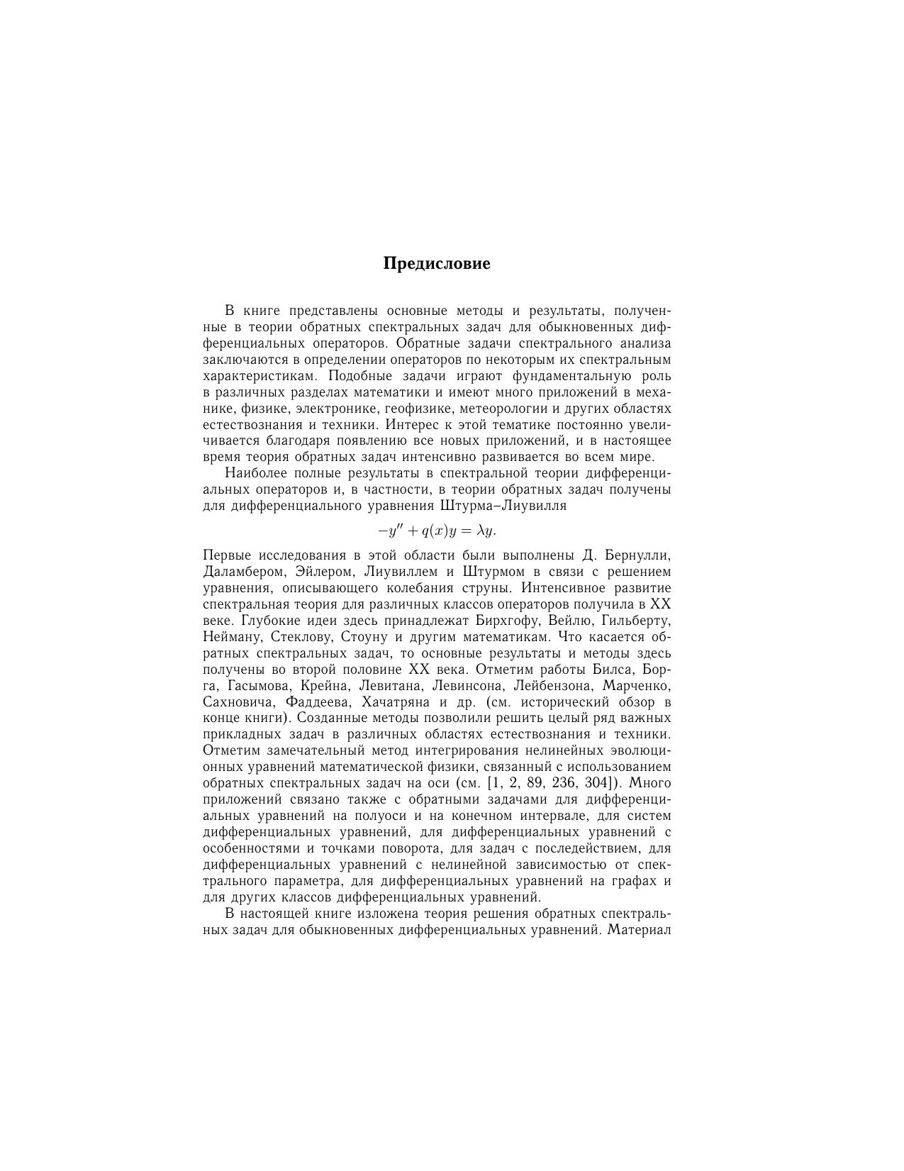 В книге рассматривается современное состояние теории обратных задач спектрального анализа для обыкновенных дифференциальных уравнений. Представлены основные результаты и методы решения обратных задач как для уравнения Штурма-Лиувилля, так и для дифференциальных уравнений высших порядков и систем дифференциальных уравнений. Материал книги представляет собой переработанное и дополненное изложение курса лекций, читавшегося автором в ряде классических университетов (Саратовский государственный университет (Россия), университет Дуйсбург-Эссен (Германия), Сивасский университет (Турция) и др.). Для математиков, физиков, инженеров, а также для студентов старших курсов математических, физических и технических специальностей.