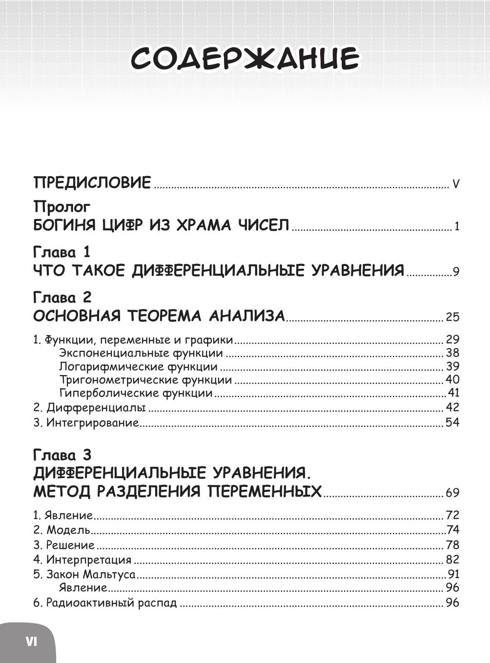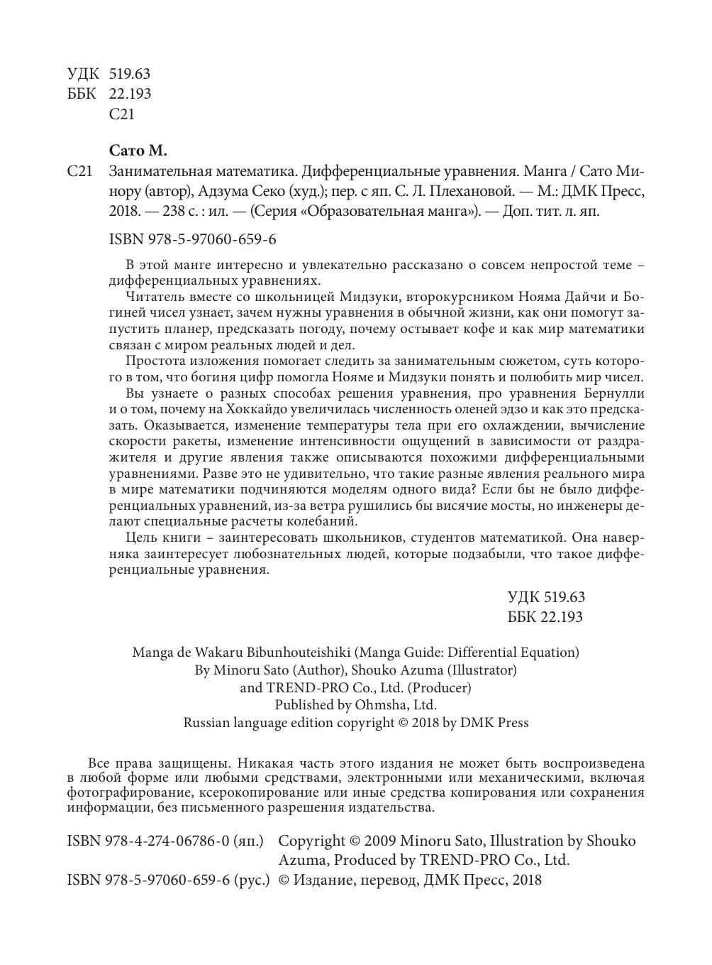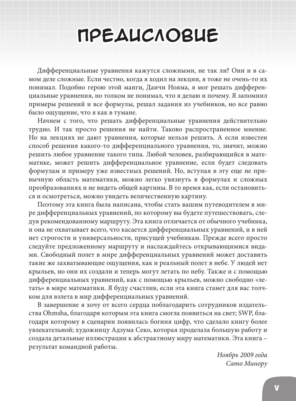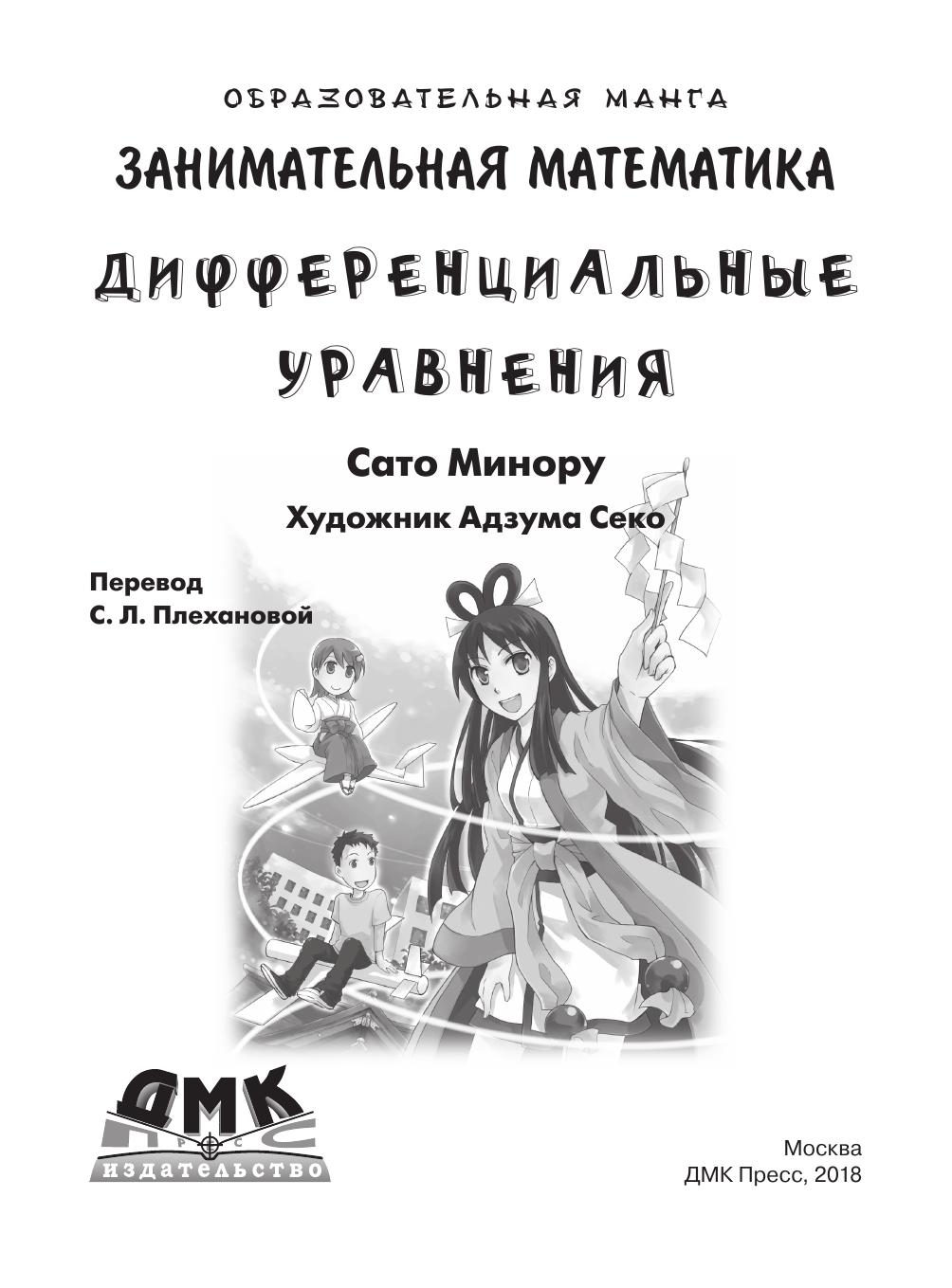 В этой манге интересно и увлекательно рассказано о совсем непростой теме – дифференциальных уравнениях. Читатель вместе со школьницей Мидзуки, второкурсником Нояма Дайчи и Богиней чисел узнает, зачем нужны уравнения в обычной жизни, как они помогут запустить планер, предсказать погоду, почему остывает кофе и как мир математики связан с миром реальных людей и дел. Простота изложения помогает следить за занимательным сюжетом, суть которого в том, что богиня цифр помогла Нояме и Мидзуки понять и полюбить мир чисел. Вы узнаете о разных способах решения уравнения, про уравнения Бернулли и о том, почему на Хоккайдо увеличилась численность оленей эдзо и как это предсказать. Оказывается, изменение температуры тела при его охлаждении, вычисление скорости ракеты, изменение интенсивности ощущений в зависимости от раздражителя и другие явления также описываются похожими дифференциальными уравнениями. Разве это не удивительно, что такие разные явления реального мира в мире математики подчиняются моделям одного вида? Если бы не было дифференциальных уравнений, из-за ветра рушились бы висячие мосты, но инженеры делают специальные расчеты колебаний. Цель книги – заинтересовать школьников, студентов математикой. Она наверняка заинтересует любознательных людей, которые подзабыли, что такое дифференциальные уравнения.