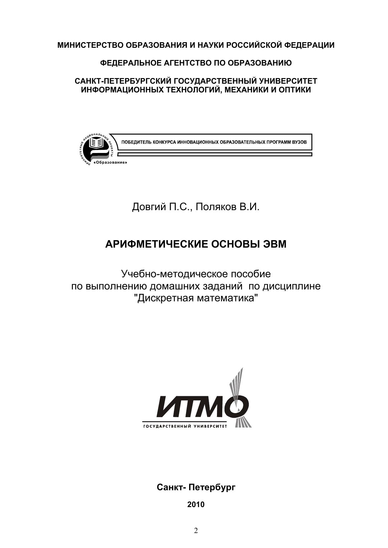 Арифметические основы ЭВМ. Учебно-методическое пособие по выполнению домашних заданий по дисциплине Дискретная математика