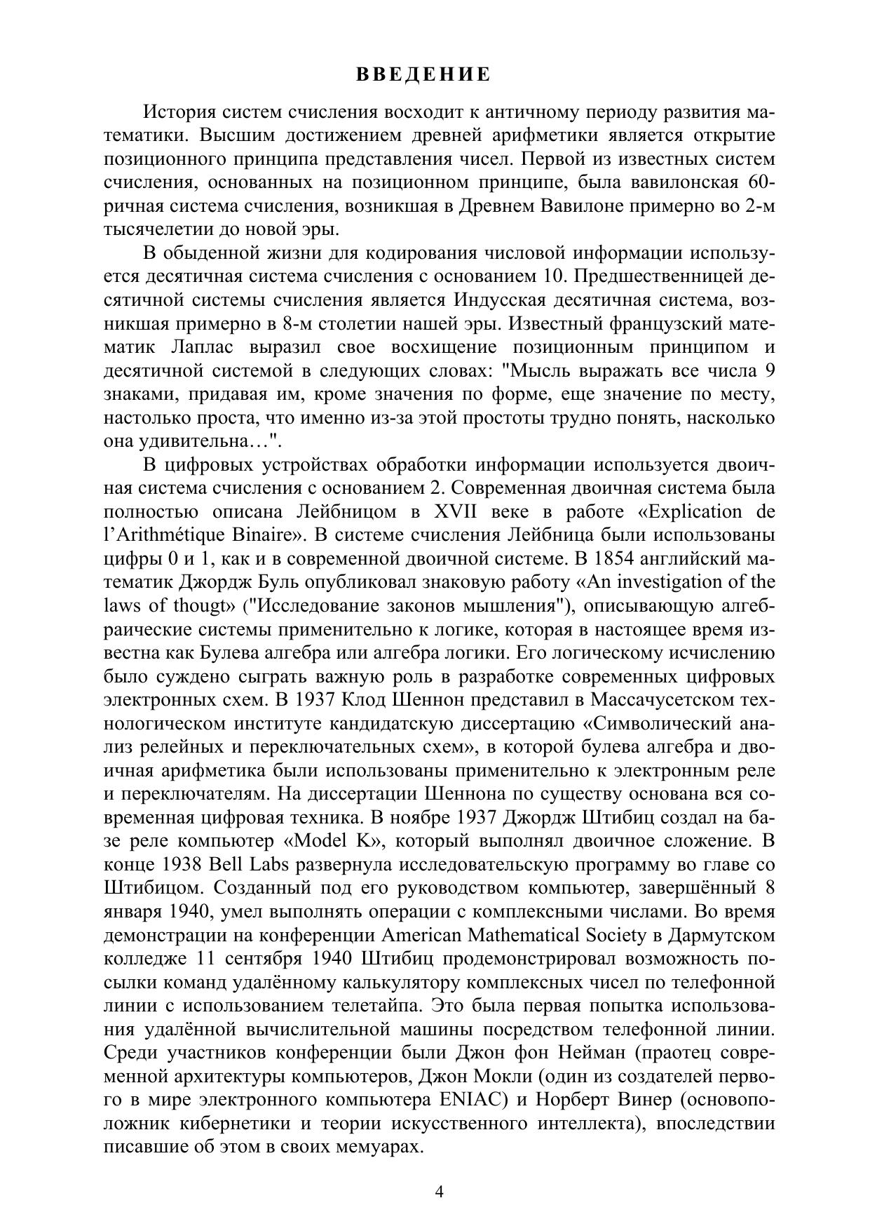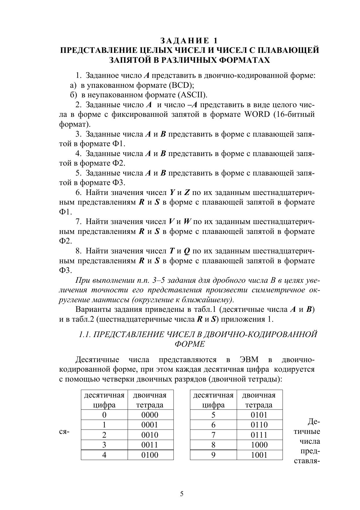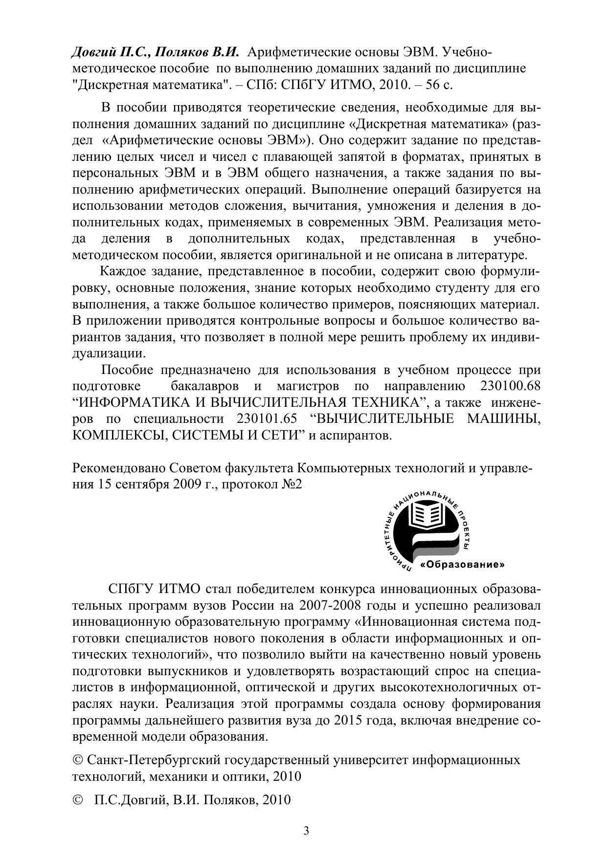 В пособии приводятся теоретические сведения, необходимые для выполнения домашних заданий по дисциплине «Дискретная математика» (раздел «Арифметические основы ЭВМ»). Оно содержит задание по представлению целых чисел и чисел с плавающей запятой в форматах, принятых в персональных ЭВМ и в ЭВМ общего назначения, а также задания по выполнению арифметических операций. Выполнение операций базируется на использовании методов сложения, вычитания, умножения и деления в дополнительных кодах, применяемых в современных ЭВМ. Реализация метода деления в дополнительных кодах, представленная в учебно-методическом пособии, является оригинальной и не описана в литературе. Каждое задание, представленное в пособии, содержит свою формулировку, основные положения, знание которых необходимо студенту для его выполнения, а также большое количество примеров, поясняющих материал. В приложении приводятся контрольные вопросы и большое количество вариантов задания, что позволяет в полной мере решить проблему их индивидуализации.