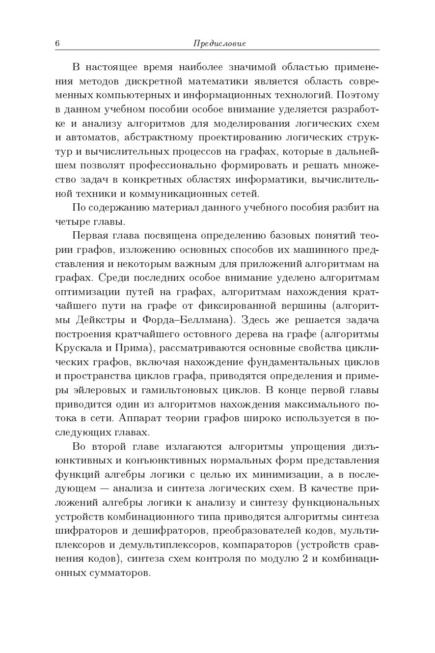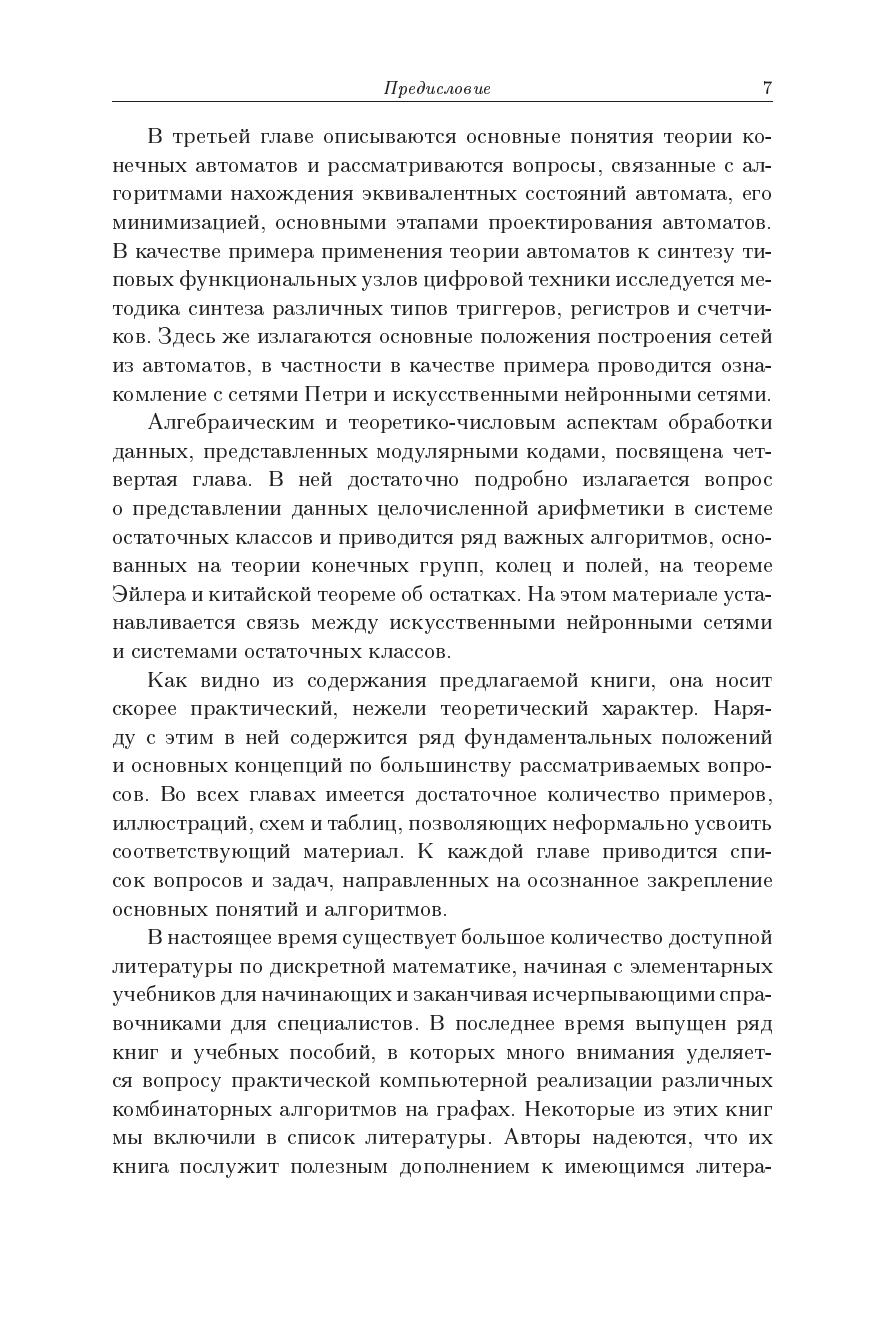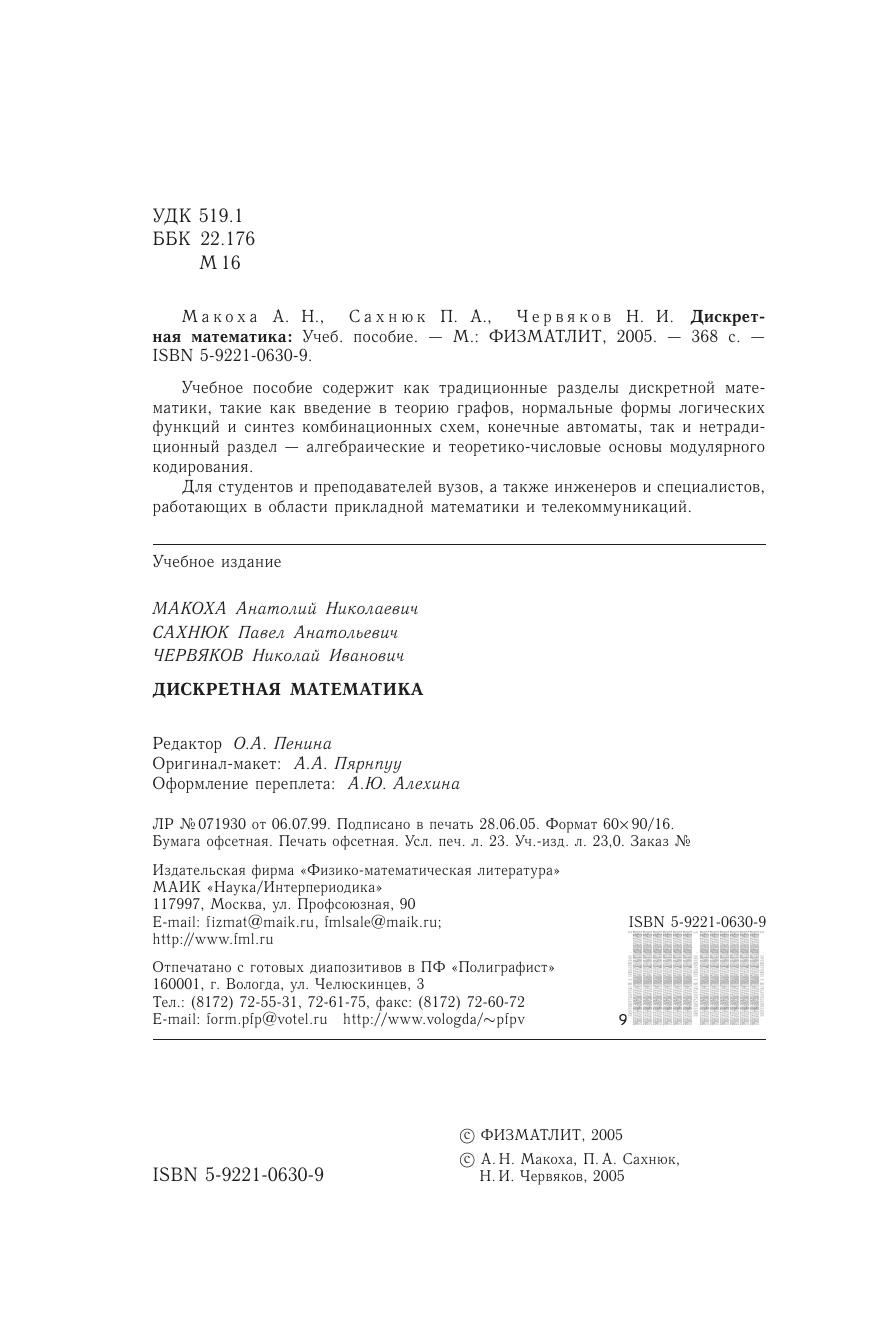 Учебное пособие содержит как традиционные разделы дискретной математики, такие как введение в теорию графов, нормальные формы логических функций и синтез комбинационных схем, конечные автоматы, так и нетрадиционный раздел — алгебраические и теоретико-числовые основы модулярного кодирования.Для студентов и преподавателей вузов, а также инженеров и специалистов, работающих в области прикладной математики и телекоммуникаций.