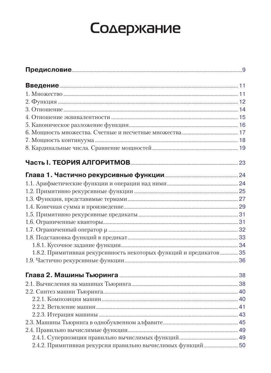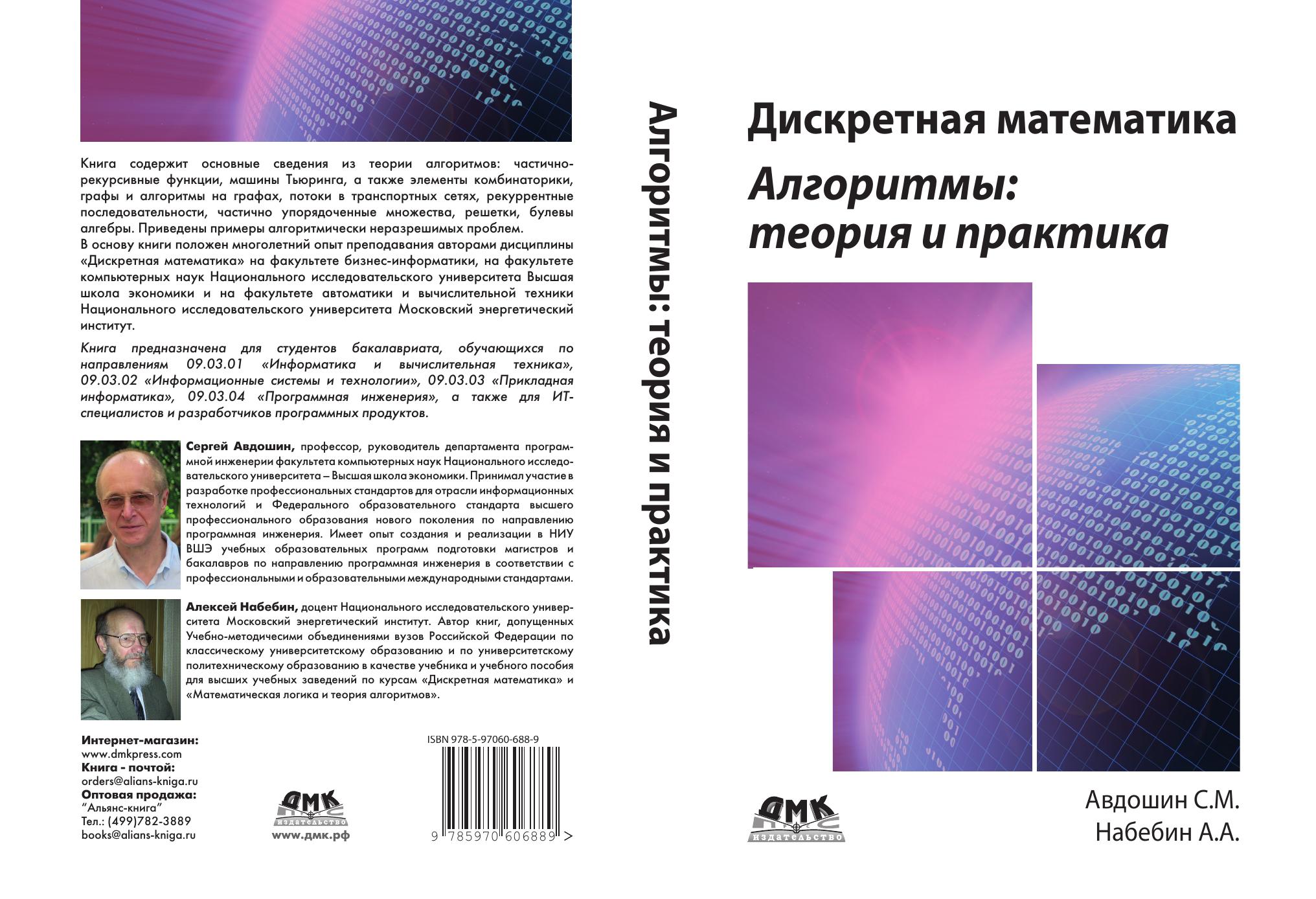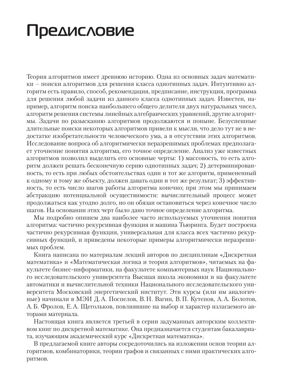 Книга содержит необходимые сведения из теории алгоритмов, теории графов, комбинаторики. Рассматриваются частично рекурсивные функции, машины Тьюринга, приводятся некоторые варианты алгоритмов (ассоциативные исчисления, системы подстановок, грамматики, продукции Поста, нормальные алгоритмы Маркова, операторные алгоритмы). Описываются основные типы графов (мультиграфы, псевдографы, эйлеровы графы, гамильтоновы графы, деревья, двудольные графы, паросочетания, сети Петри, планарные графы, транспортные сети). Приводятся некоторые часто используемые в практике алгоритмы на графах. Рассматриваются классические комбинаторные конфигурации и их производящие функции, рекуррентные последовательности. В основу книги положен многолетний опыт преподавания авторами дисциплины «Дискретная математика» на факультете бизнес-информатики, на факультете компьютерных наук Национального исследовательского университета Высшая школа экономики и на факультете автоматики и вычислительной техники Национального исследовательского университета Московский энергетический институт. Книга предназначена для студентов бакалавриата, обучающихся по направлениям 09.03.01 «Информатика и вычислительная техника», 09.03.02 «Информационные системы и технологии», 09.03.03 «Прикладная информатика», 09.03.04 «Программная инженерия», а также для ИТ-специалистов и разработчиков программных продуктов.