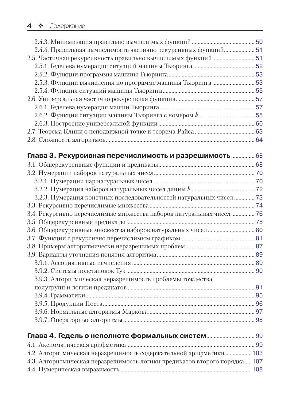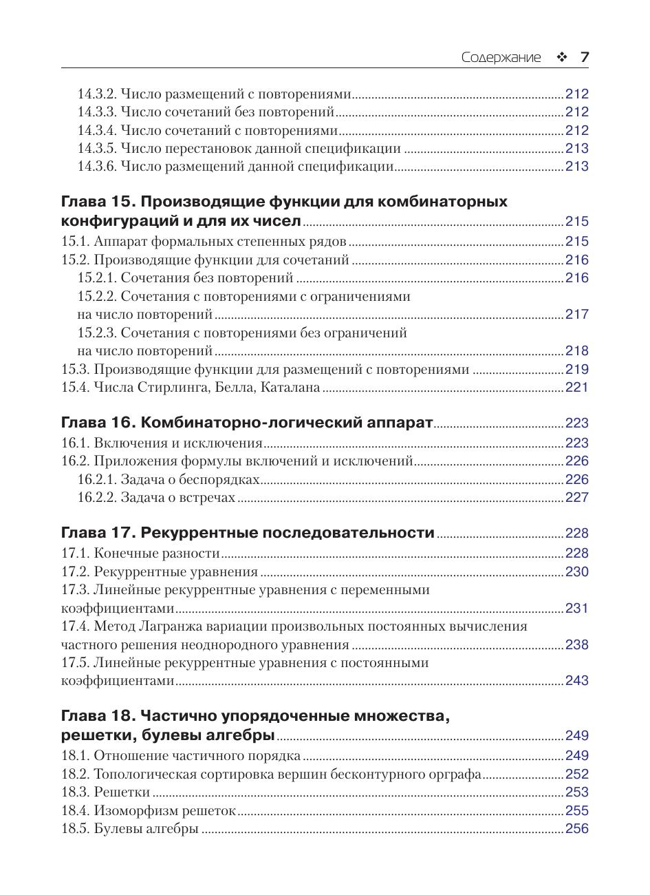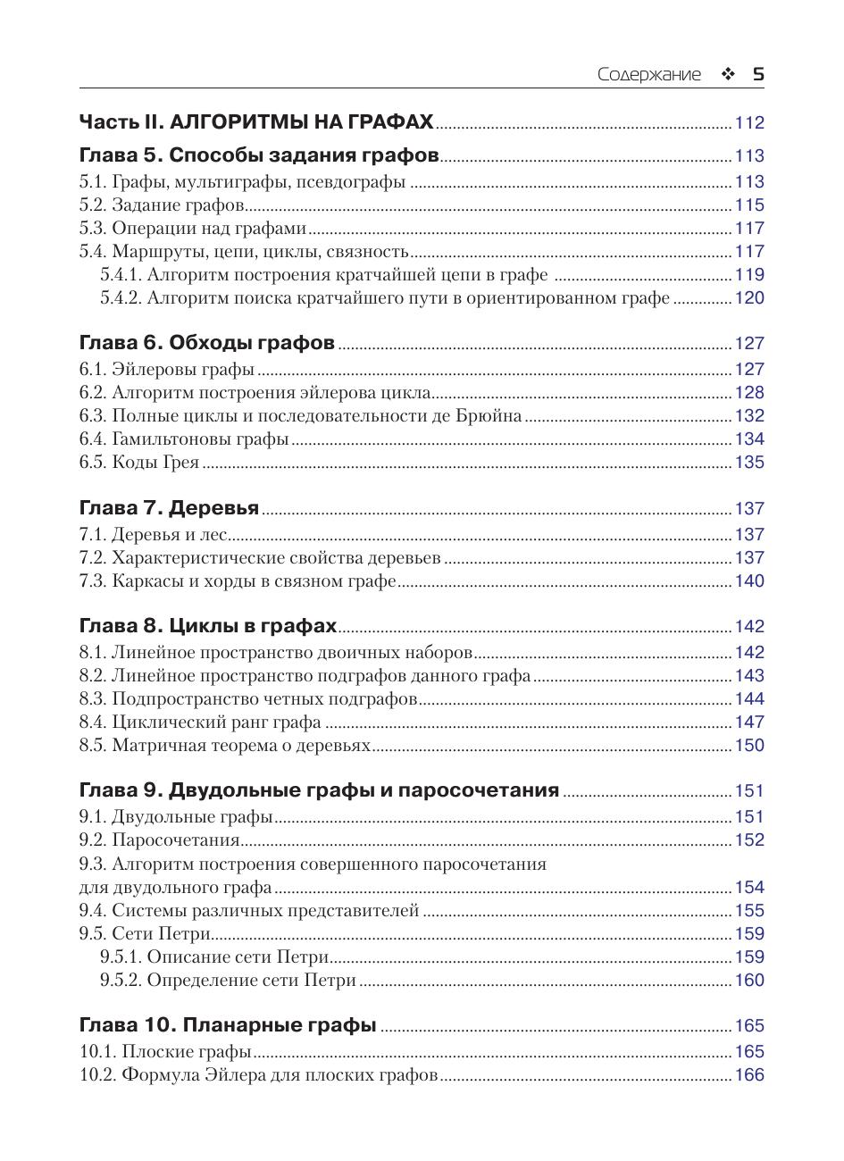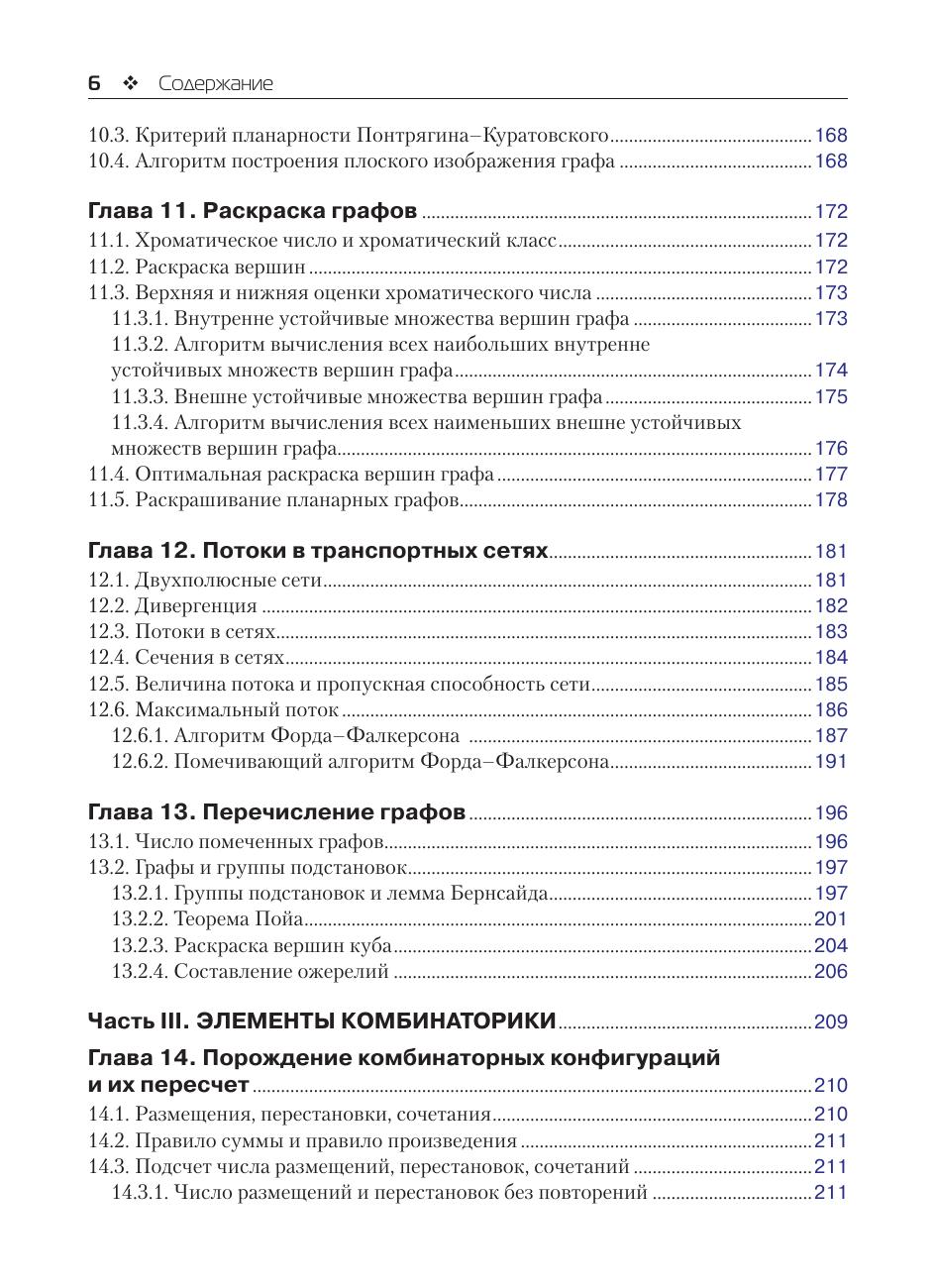 Книга содержит необходимые сведения из теории алгоритмов, теории графов, комбинаторики. Рассматриваются частично рекурсивные функции, машины Тьюринга, приводятся некоторые варианты алгоритмов (ассоциативные исчисления, системы подстановок, грамматики, продукции Поста, нормальные алгоритмы Маркова, операторные алгоритмы). Описываются основные типы графов (мультиграфы, псевдографы, эйлеровы графы, гамильтоновы графы, деревья, двудольные графы, паросочетания, сети Петри, планарные графы, транспортные сети). Приводятся некоторые часто используемые в практике алгоритмы на графах. Рассматриваются классические комбинаторные конфигурации и их производящие функции, рекуррентные последовательности. В основу книги положен многолетний опыт преподавания авторами дисциплины «Дискретная математика» на факультете бизнес-информатики, на факультете компьютерных наук Национального исследовательского университета Высшая школа экономики и на факультете автоматики и вычислительной техники Национального исследовательского университета Московский энергетический институт. Книга предназначена для студентов бакалавриата, обучающихся по направлениям 09.03.01 «Информатика и вычислительная техника», 09.03.02 «Информационные системы и технологии», 09.03.03 «Прикладная информатика», 09.03.04 «Программная инженерия», а также для ИТ-специалистов и разработчиков программных продуктов.
