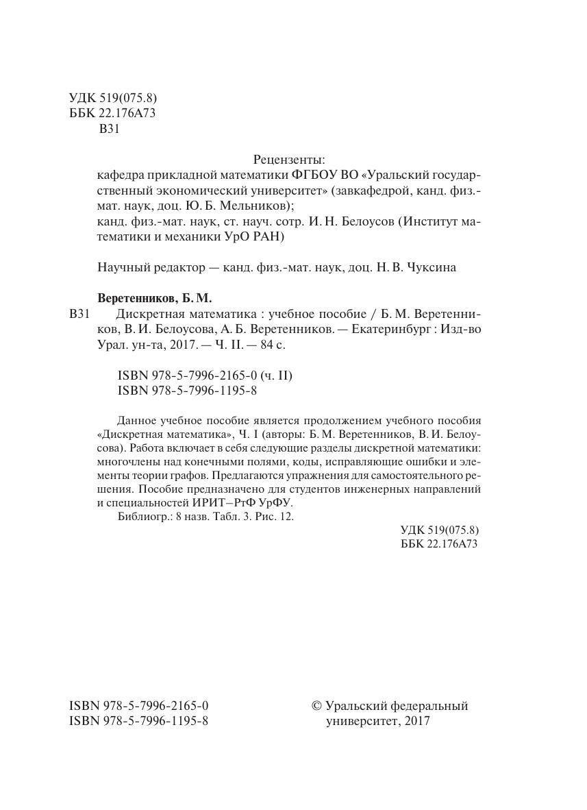 Данное учебное пособие является продолжением учебного пособия «Дискретная математика», Ч. I (авторы: Б. М. Веретенников, В. И. Белоусова). Работа включает в себя следующие разделы дискретной математики: многочлены над конечными полями, коды, исправляющие ошибки и элементы теории графов. Предлагаются упражнения для самостоятельного решения. Пособие предназначено для студентов инженерных направлений и специальностей ИРИТ–РтФ УрФУ.