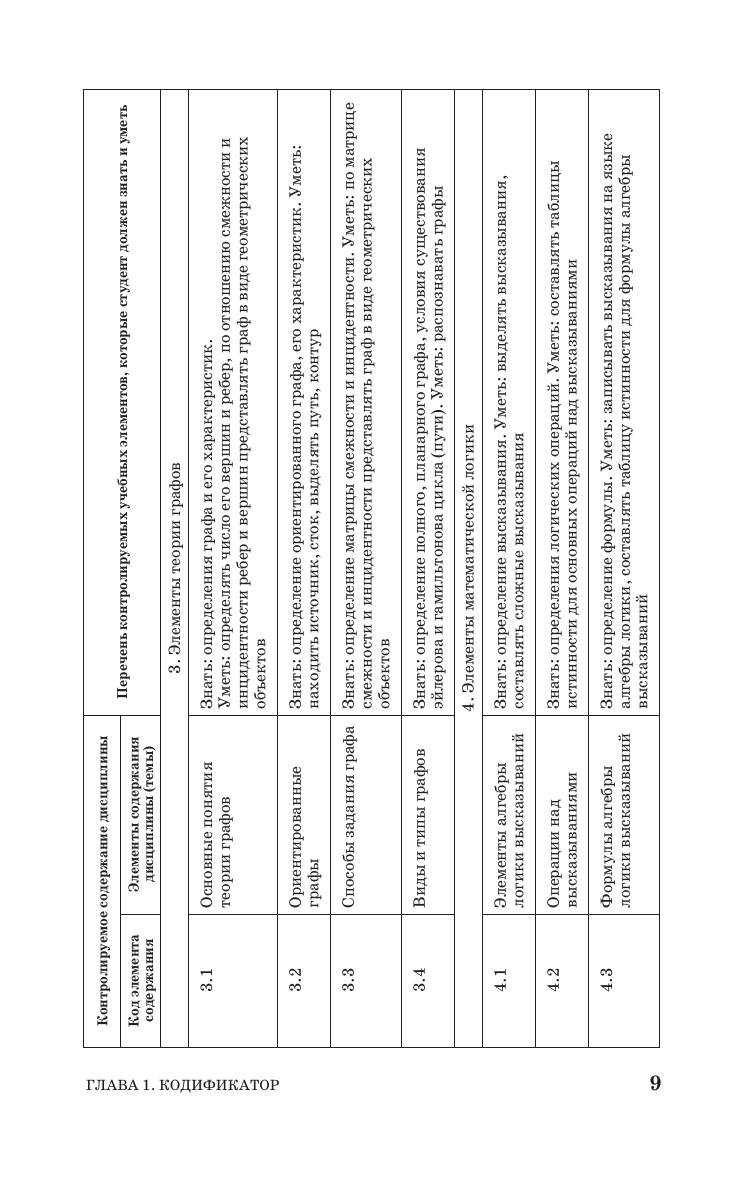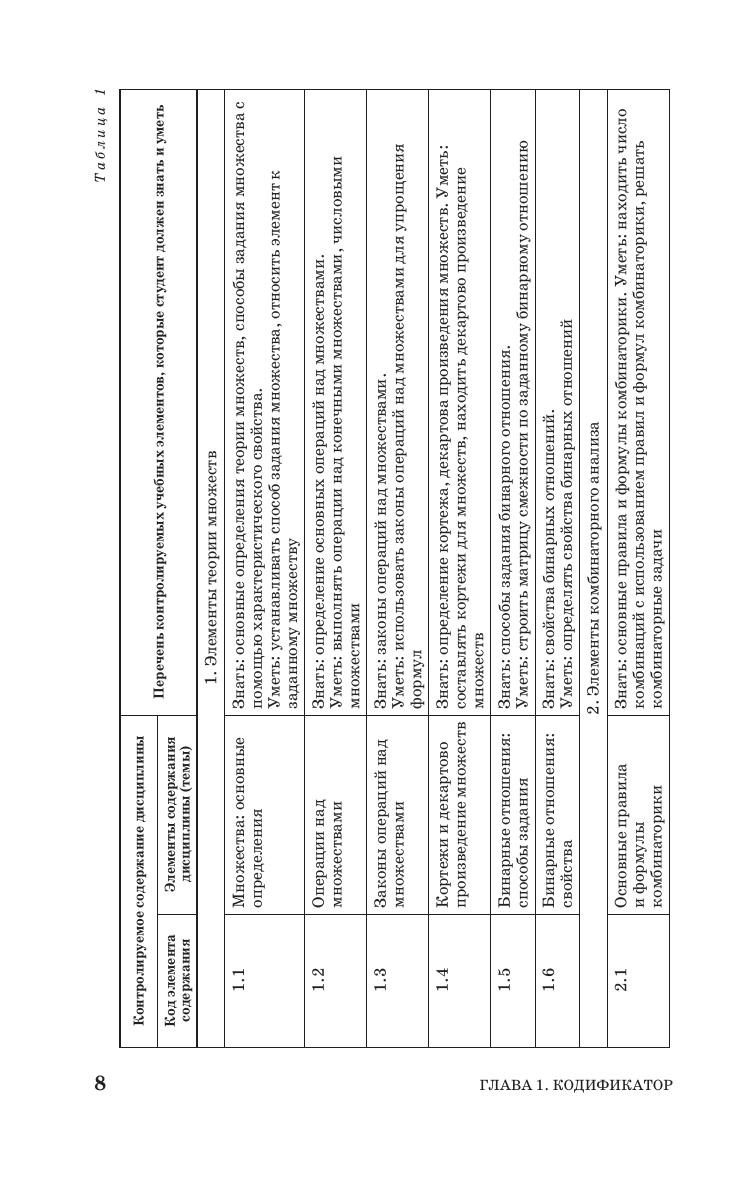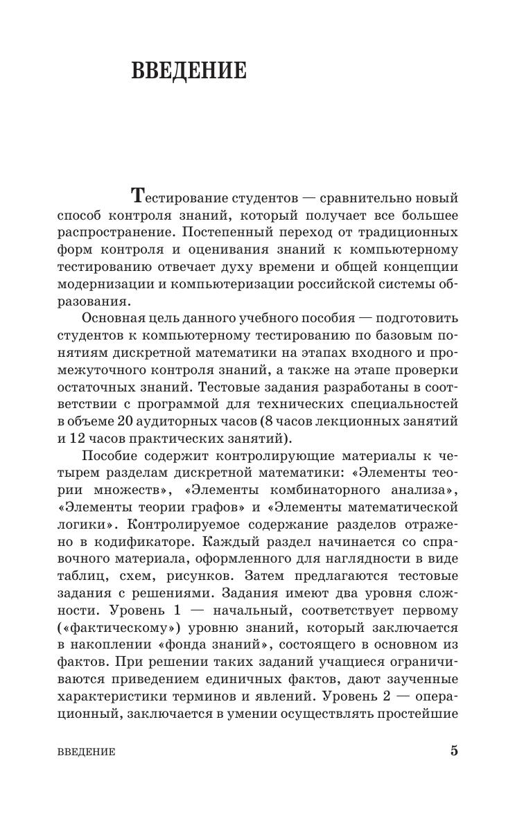 Учебное пособие содержит кодификатор, тестовые задания и типовой расчет к разделу «Дискретная математика». Раздел представлен четырьмя темами: элементы теории множеств, элементы комбинаторного анализа, элементы теории графов и элементы математической логики. Каждая тема снабжена справочным материалом, оформленным в виде таблиц, схем, рисунков. Имеются тестовые задания с решениями, тестовые задания для самопроверки и индивидуальные типовые задания с образцом для их выполнения. К тестовым заданиям для самопроверки прилагаются ответы. Данное пособие можно использовать для подготовки студентов к компьютерному тестированию по дискретной математике на этапах текущего, промежуточного контроля и проверки остаточных знаний. Пособие адресовано студентам и преподавателям математики технических вузов.