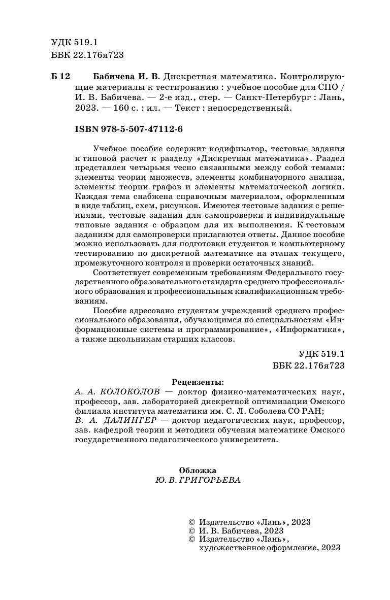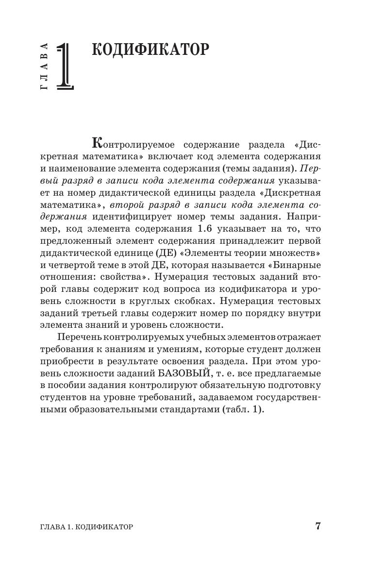 Учебное пособие содержит кодификатор, тестовые задания и типовой расчет к разделу «Дискретная математика». Раздел представлен четырьмя тесно связанными между собой темами: элементы теории множеств, элементы комбинаторного анализа, элементы теории графов и элементы математической логики. Каждая тема снабжена справочным материалом, оформленным в виде таблиц, схем, рисунков. Имеются тестовые задания с решениями, тестовые задания для самопроверки и индивидуальные типовые задания с образцом для их выполнения. К тестовым заданиям для самопроверки прилагаются ответы. Соответствует современным требованиям Федерального государственного образовательного стандарта среднего профессионального образования и профессиональным квалификационным требованиям. Данное пособие можно использовать для подготовки студентов к компьютерному тестированию по дискретной математике на этапах текущего, промежуточного контроля и проверки остаточных знаний. Пособие адресовано студентам учреждений среднего профессионального образования, обучающимся по специальностям «Информационные системы и программирование», «Информатика», а также школьникам старших классов.