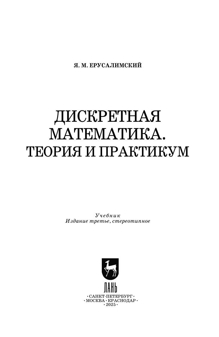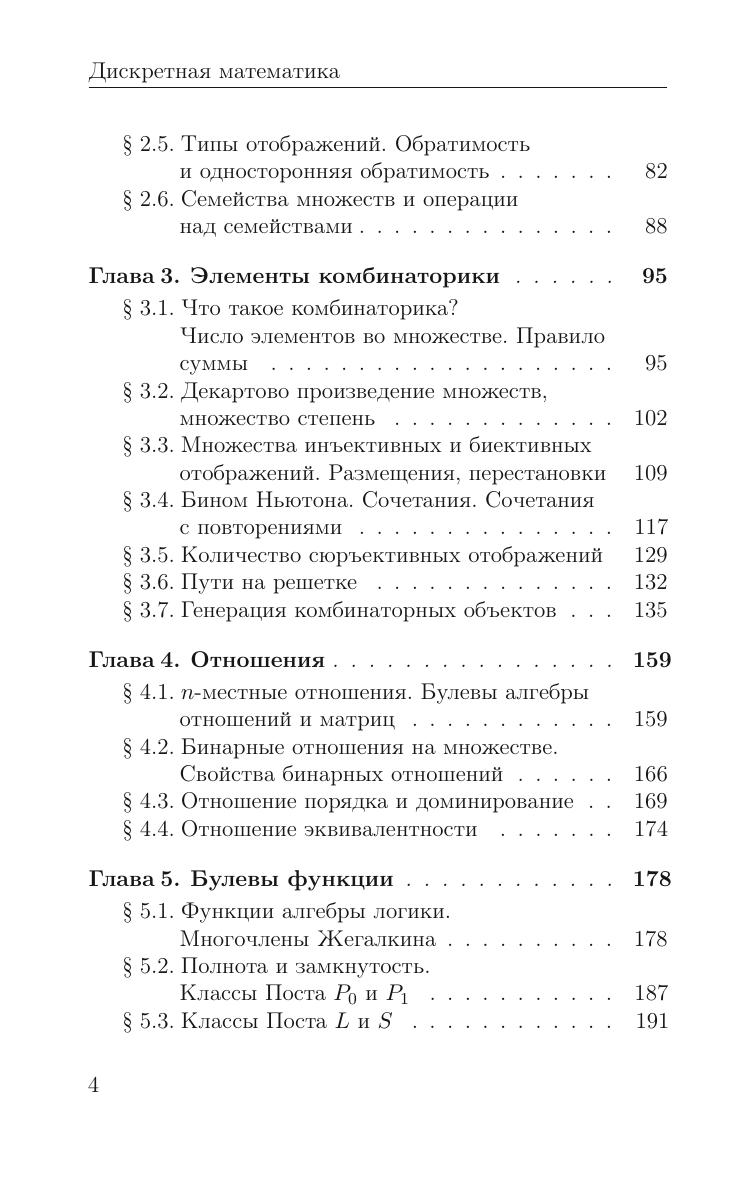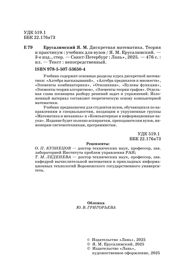 Учебник содержит основные разделы курса дискретной математики: Алгебра высказываний, Алгебра предикатов и множеств, Элементы комбинаторики, Отношения, Булевы функции, Элементы теории алгоритмов, Элементы теории графов. Отдельная глава посвящена разбору решений задач и упражнений. Изложенный материал составляет теоретическую основу компьютерной математики. Учебник предназначен для студентов вузов, обучающихся по направлениям и специальностям, входящим в укрупненные группы Математика и механика и Компьютерные и информационные науки. Издание будет полезно аспирантам, преподавателям вузов, инженерам-системотехникам, программистам.