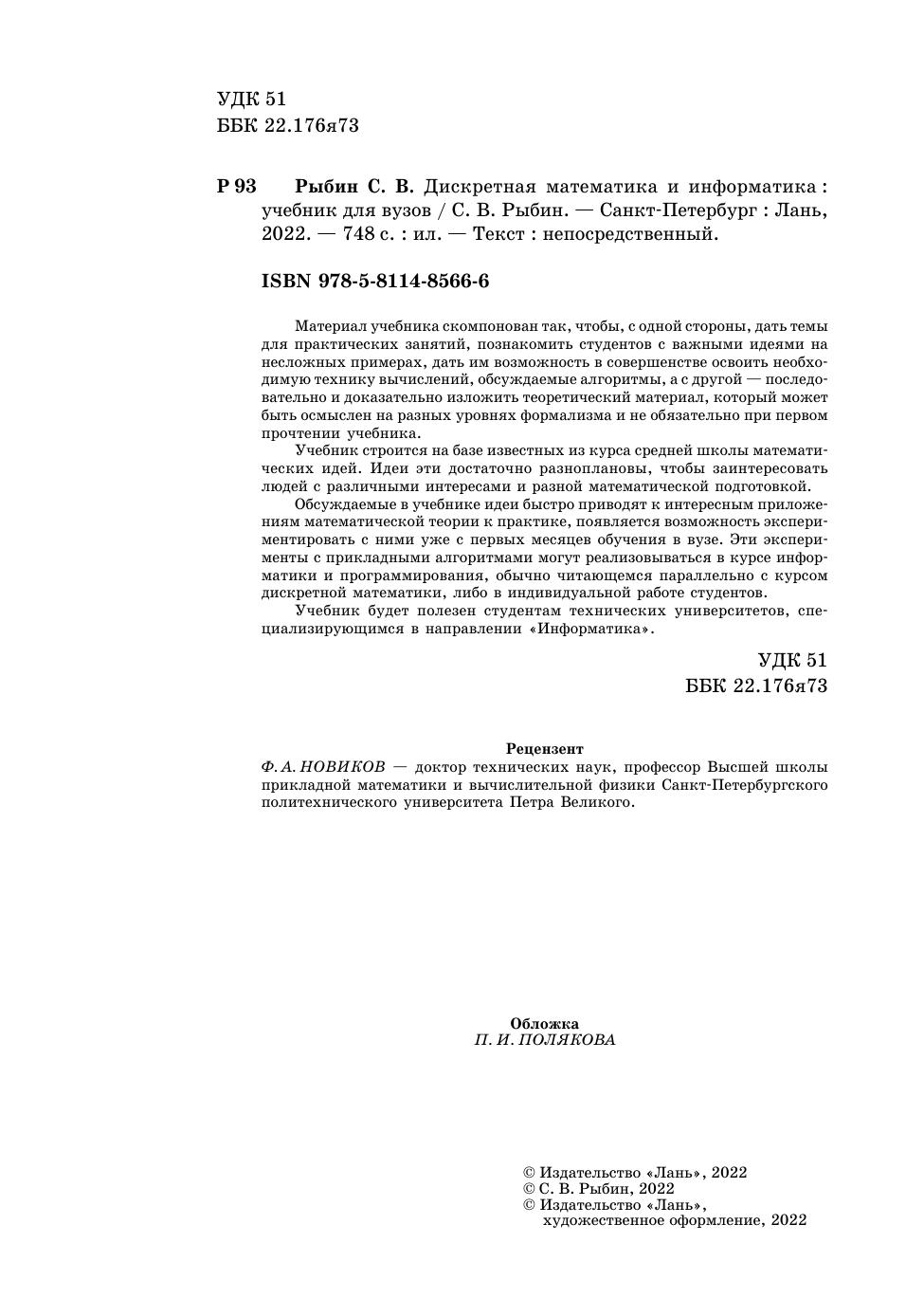 Обсуждаемые в учебнике идеи быстро приводят к интересным приложениям математической теории к практике, появляется возможность экспериментировать с ними уже с первых месяцев обучения в вузе. Эти эксперименты с прикладными алгоритмами могут реализовываться в курсе информатики и программирования, обычно читающемся параллельно с курсом дискретной математики, либо в индивидуальной работе студентов. Учебник будет полезен студентам технических университетов, специализирующимся в направлении «Информатика».