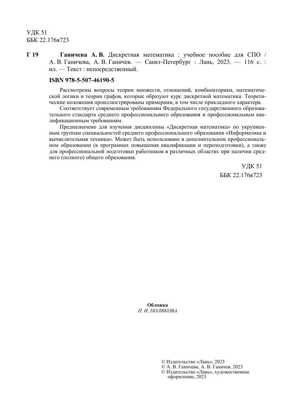 Рассмотрены вопросы теории множеств, отношений, комбинаторики, математической логики и теории графов, которые образуют курс дискретной математики. Теоретические положения проиллюстрированы примерами, в том числе прикладного характера. Соответствует современным требованиям Федерального государственного образовательного стандарта среднего профессионального образования и профессиональным квалификационным требованиям. Предназначено для изучения дисциплины «Дискретная математика» по укрупненным группам специальностей среднего профессионального образования «Информатика и вычислительная техника». Может быть использовано в дополнительном профессиональном образовании (в программах повышения квалификации и переподготовки), а также для профессиональной подготовки работников в различных областях при наличии среднего (полного) общего образования.