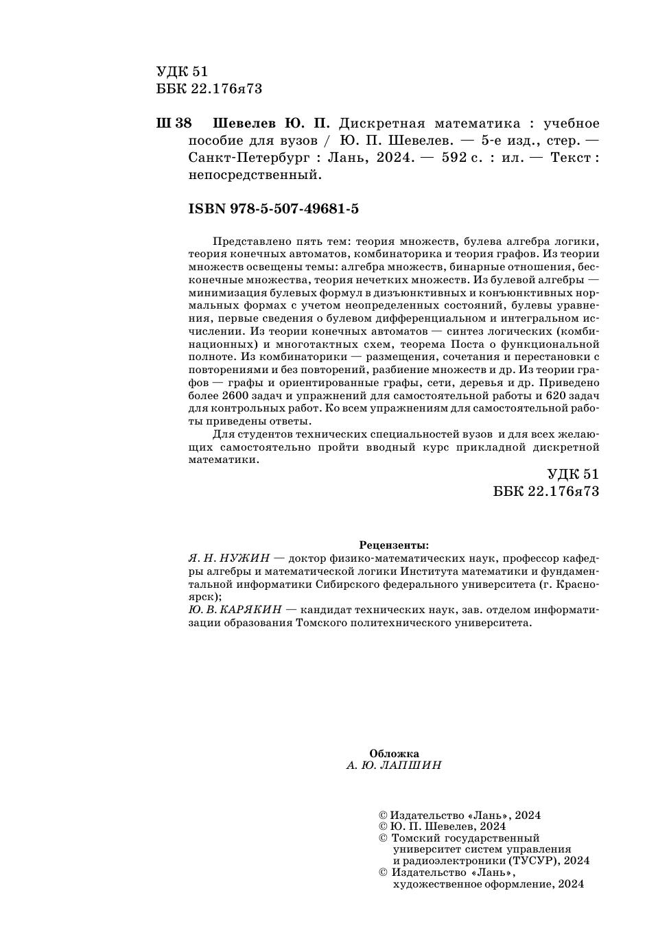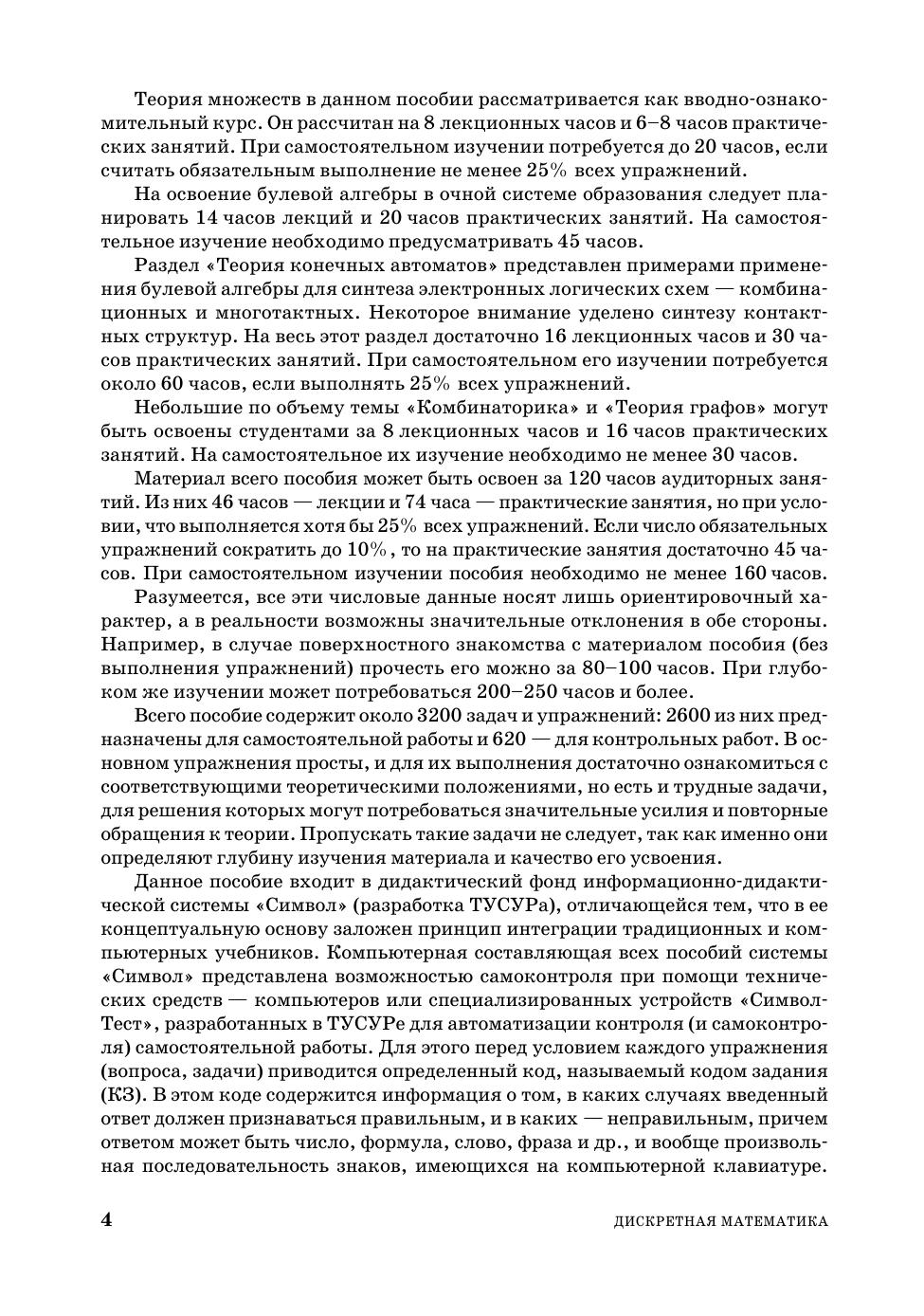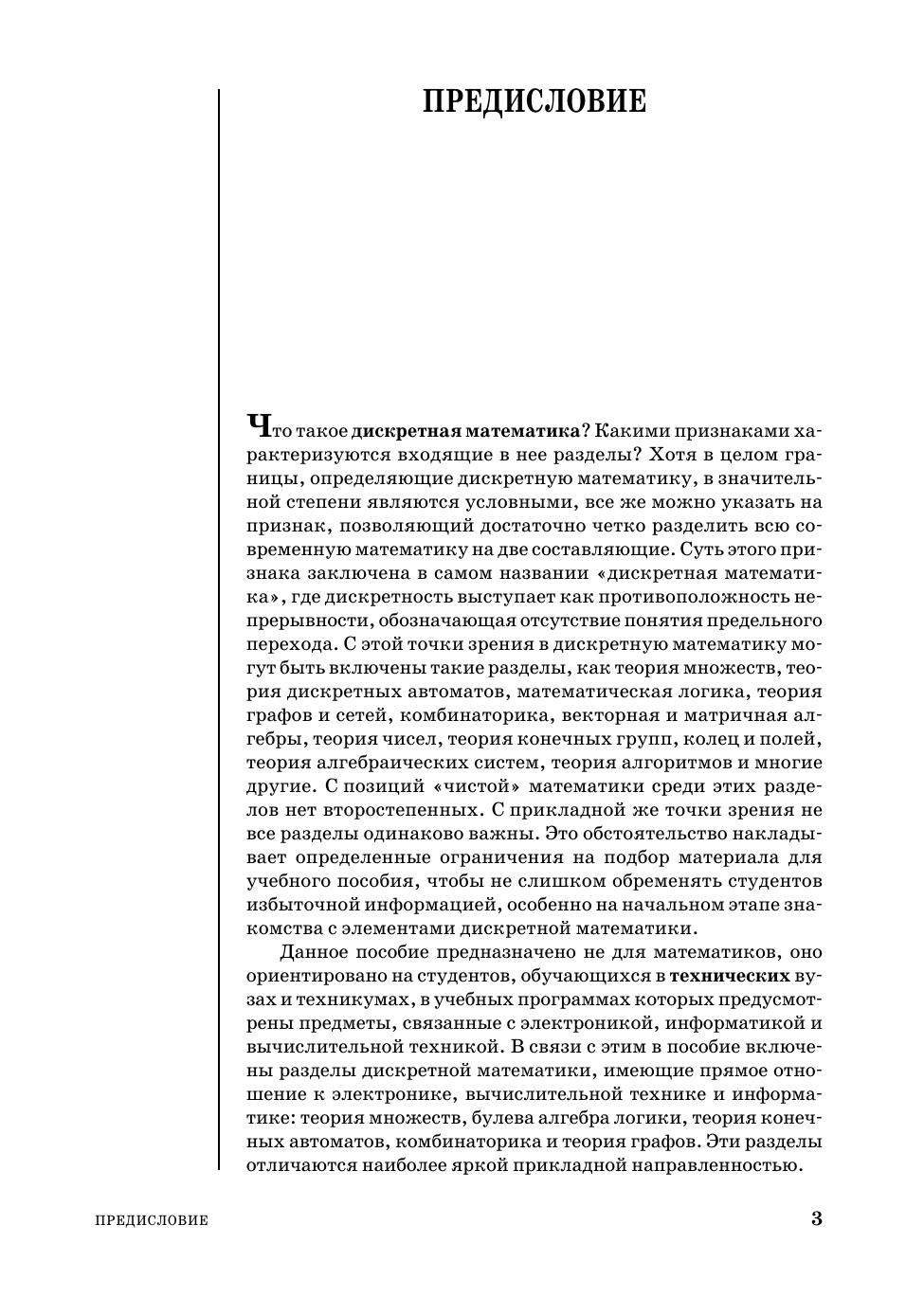 Доп. Мин. обр. и науки РФ в кач. уч. пос. для студентов ВУЗов, обуч. по напр. и специальности "Прикладная математика и информатика". Представлено пять тем: теория множеств, булева алгебра логики, теория конечных автоматов, комбинаторика и теория графов. Из теории множеств освещены темы: алгебра множеств, бинарные отношения, бесконечные множества, теория нечетких множеств. Из булевой алгебры - минимизация булевых формул в дизъюнктивных и конъюнктивных нормальных формах с учетом неопределенных состояний, булевы уравнения, первые сведения о булевом диф. и интегр. исчислении. Из теории конечных автоматов - синтез логических (комбинационных) и многотактных схем, теорема Поста о функциональной полноте. Из комбинаторики - размещения, сочетания и перестановки с повторениями и без повторений, разбиение множеств и др. Из теории графов - графы и ориентированные графы, сети, деревья и др. Приведено более 2600 задач и упр. для сам. работы. Для студентов технич. спец. вузов и для всех желающих самостоятельно пройти вводный курс прикладной дискретной математики.