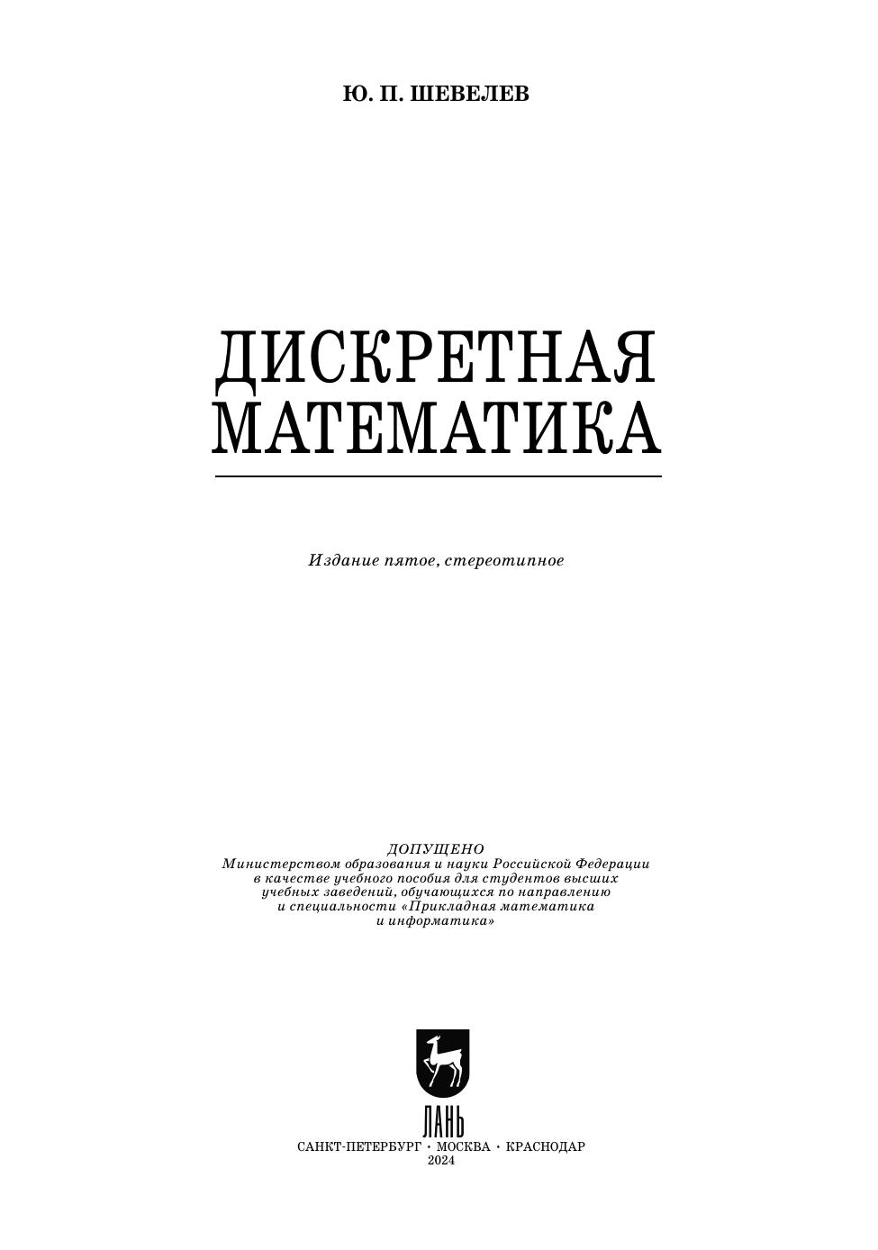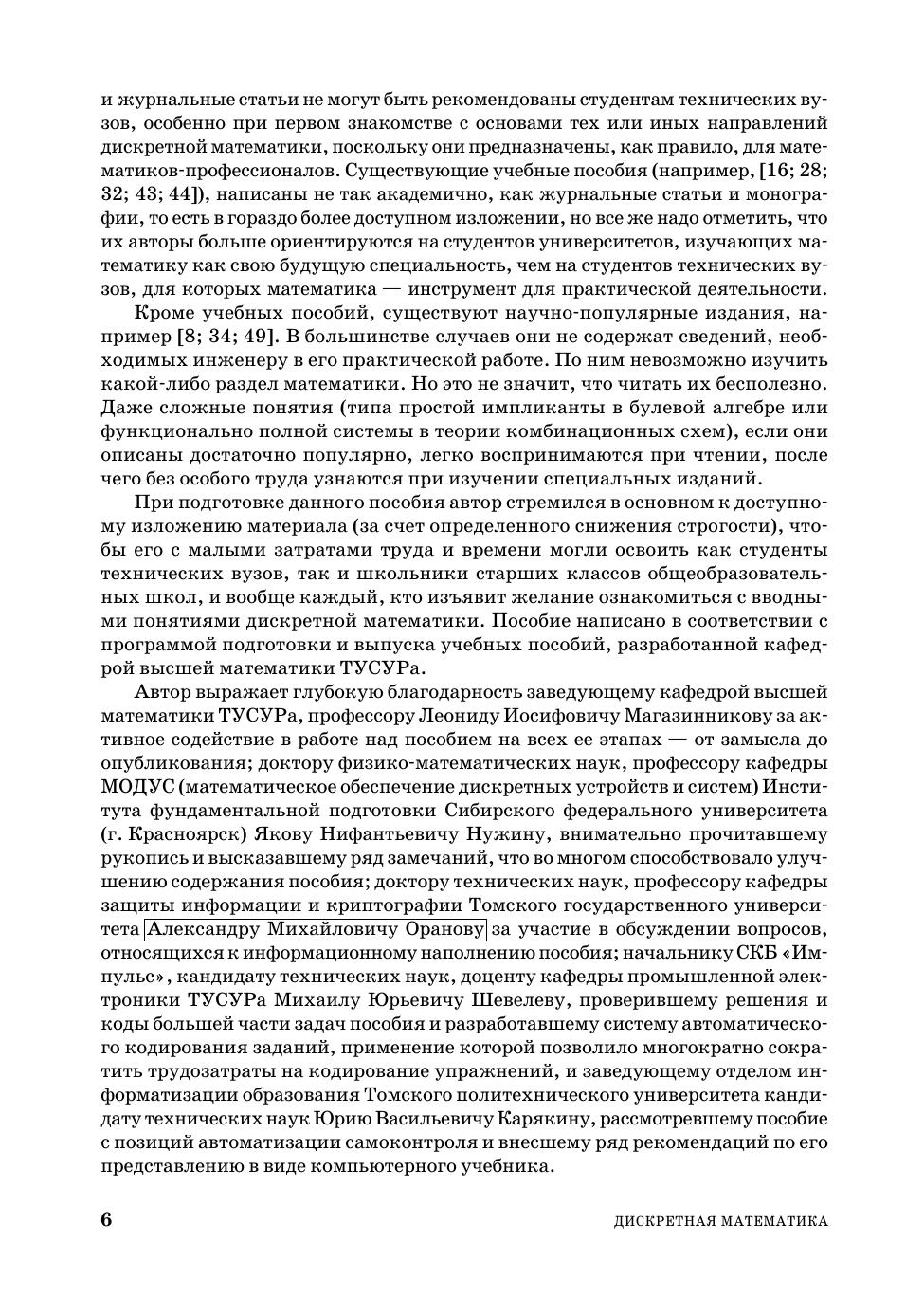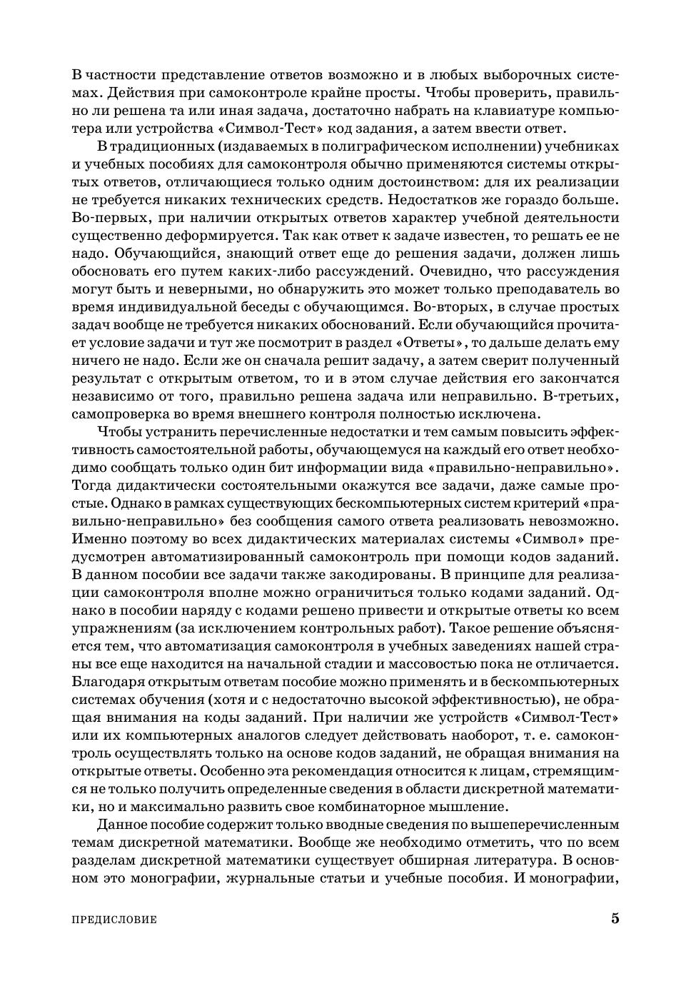 Доп. Мин. обр. и науки РФ в кач. уч. пос. для студентов ВУЗов, обуч. по напр. и специальности "Прикладная математика и информатика". Представлено пять тем: теория множеств, булева алгебра логики, теория конечных автоматов, комбинаторика и теория графов. Из теории множеств освещены темы: алгебра множеств, бинарные отношения, бесконечные множества, теория нечетких множеств. Из булевой алгебры - минимизация булевых формул в дизъюнктивных и конъюнктивных нормальных формах с учетом неопределенных состояний, булевы уравнения, первые сведения о булевом диф. и интегр. исчислении. Из теории конечных автоматов - синтез логических (комбинационных) и многотактных схем, теорема Поста о функциональной полноте. Из комбинаторики - размещения, сочетания и перестановки с повторениями и без повторений, разбиение множеств и др. Из теории графов - графы и ориентированные графы, сети, деревья и др. Приведено более 2600 задач и упр. для сам. работы. Для студентов технич. спец. вузов и для всех желающих самостоятельно пройти вводный курс прикладной дискретной математики.