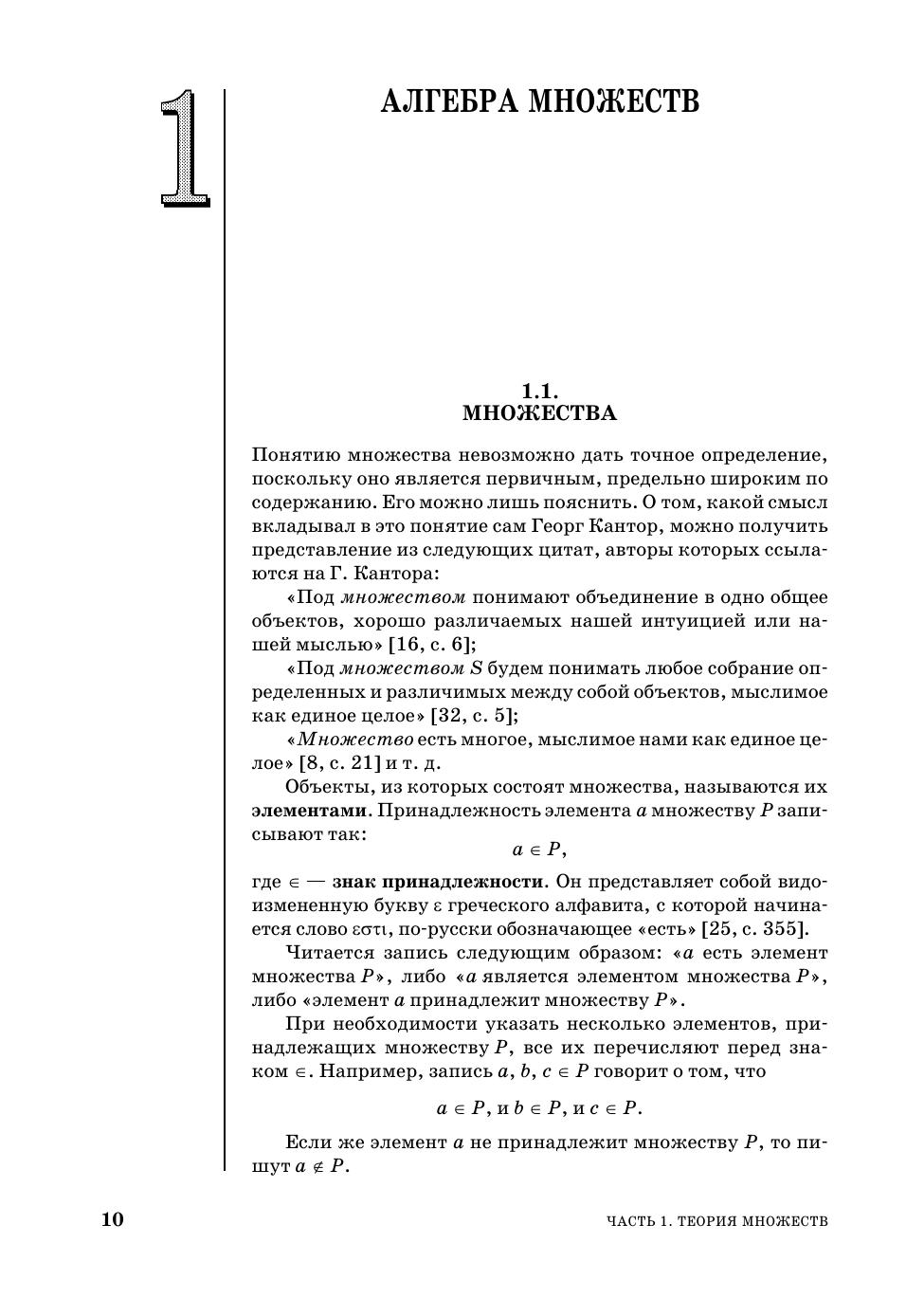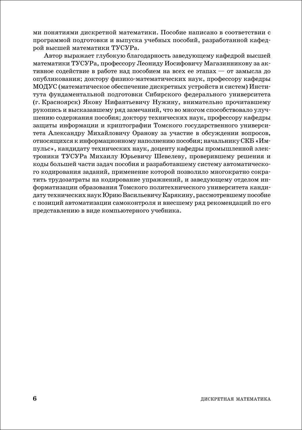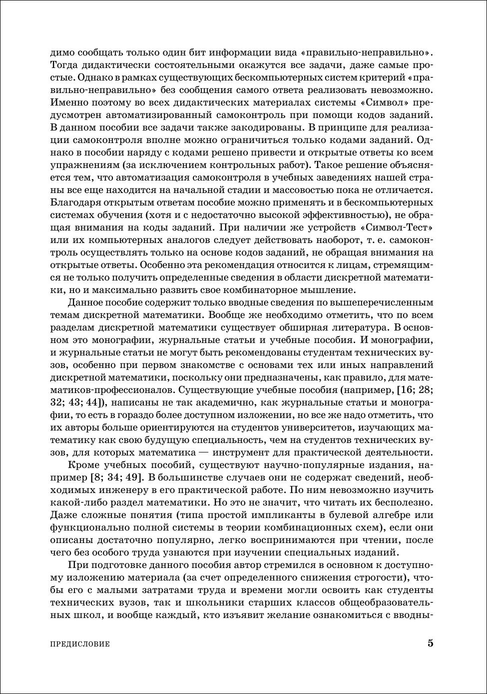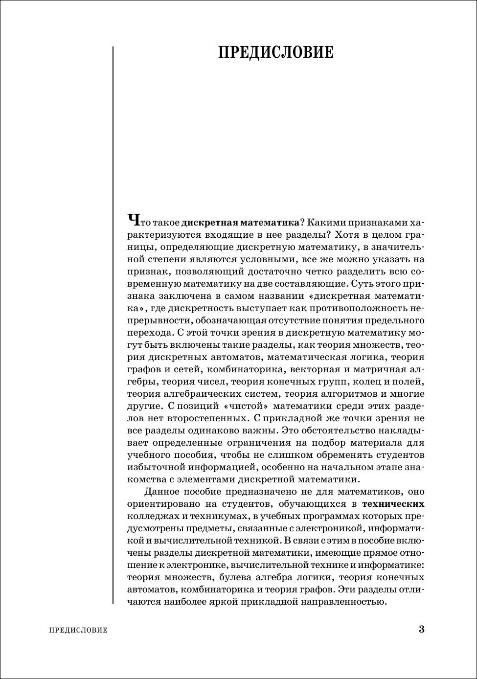 Представлено пять тем: теория множеств, булева алгебра логики, теория конечных автоматов, комбинаторика и теория графов. Из теории множеств освещены темы: алгебра множеств, бинарные отношения, бесконечные множества, теория нечетких множеств. Из булевой алгебры — минимизация булевых формул в дизъюнктивных и конъюнктивных нормальных формах с учетом неопределенных состояний, булевы уравнения, первые сведения о булевом дифференциальном и интегральном исчислении. Из теории конечных автоматов — синтез логических комбинационных и многотактных схем, теорема Поста о функциональной полноте. Из комбинаторики — размещения, сочетания и перестановки с повторениями и без повторений, разбиение множеств и др. Из теории графов — графы и ориентированные графы, сети, деревья и др. Приведено более 2600 задач и упражнений для самостоятельной работы и 620 задач для контрольных работ. Ко всем упражнениям для самостоятельной работы приведены ответы. Для студентов технических специальностей колледжей и техникумов, школьников старших классов общеобразовательных школ и для всех желающих самостоятельно пройти вводный курс прикладной дискретной математики. Соответствует современным требованиям Федерального государственного образовательного стандарта среднего профессионального образования и профессиональным квалификационным требованиям.